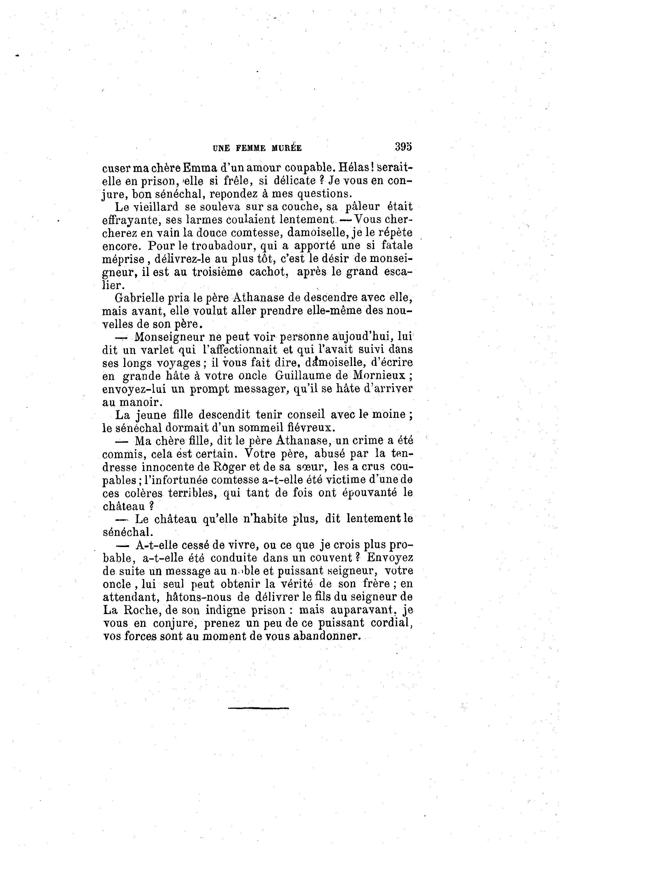 UNE FEMME MURÉE 393 cuser ma chère Emma d'un amour coupable. Hélas ! serait- elle en prison, 'elle si frêle, si délicate ? Je vous en con- jure, bon sénéchal, repondez à mes questions. Le vieillard se souleva sur sa couche, sa pâleur était effrayante, ses larmes coulaient lentement.—Vous cher- cherez en vain la douce comtesse, damoiselle, je le répète encore. Pour le troubadour, qui a apporté une si fatale méprise , délivrez-le au plus tôt, c'est le désir de monsei- gneur, il est au troisième cachot, après le grand esca- lier. Gabrielle pria le père Athanase de descendre avec elle, mais avant, elle voulut aller prendre elle-même des nou- velles de son père. -r- Monseigneur ne peut voir personne aujoud'hui, lui dit un varlet qui l'affectionnait et qui l'avait suivi dans ses longs voyages ; il vous fait dire, demoiselle, d'écrire en grande hâte à votre oncle Guillaume de Mornieux ; envoyez-lui un prompt messager, qu'il se hâte d'arriver au manoir. La jeune fille descendit tenir conseil avec le moine ; le sénéchal dormait d'un sommeil fiévreux. — Ma chère fille, dit le père Athanase, un crime a été commis, cela est certain. Votre père, abusé par la ten- dresse innocente de Roger et de sa sœur, les a crus cou- pables ; l'infortunée comtesse a-t-elle été victime d'une de ces colères terribles, qui tant de fois ont épouvanté le château ? — Le château qu'elle n'habite plus, dit lentement le sénéchal. — A-t-elle cessé de vivre, ou ce que je crois plus pro- bable, a-t-elle été conduite dans un couvent ? Envoyez de suite un message au n>bie et puissant seigneur, votre oncle , lui seul peut obtenir la vérité de son frère ; en attendant, hâtons-nous de délivrer le fils du seigneur de La Roche, de son indigne prison : mais auparavant, je vous en conjure, prenez un peu de ce puissant cordial, vos forces sont au moment de vous abandonner.