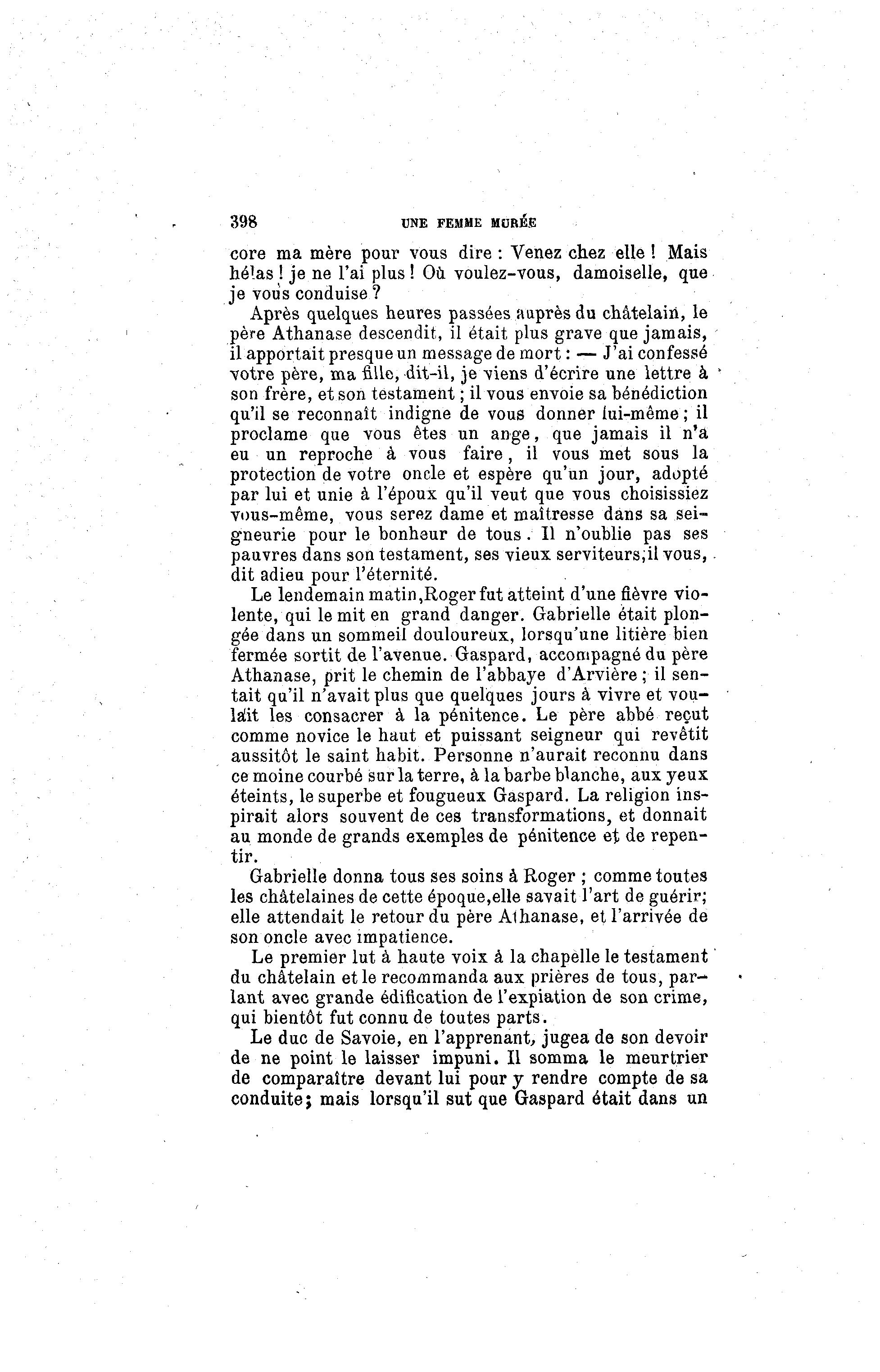 398 UNE FEMME MURÉE core ma mère pour vous dire : Venez chez elle ! Mais hélas ! je ne l'ai plus ! Où voulez-vous, damoiselle, que je vous conduise ? Après quelques heures passées auprès du châtelain, le père Athanase descendit, il était plus grave que jamais, il apportait presque un message de mort : — J'ai confessé votre père, ma fille, dit-il, je viens d'écrire une lettre à son frère, et son testament ; il vous envoie sa bénédiction qu'il se reconnaît indigne de vous donner lui-même ; il proclame que vous êtes un ange, que jamais il n'a eu un reproche à vous faire, il vous met sous la protection de votre oncle et espère qu'un jour, adopté par lui et unie à l'époux qu'il veut que vous choisissiez vous-même, vous serez dame et maîtresse dans sa sei- gneurie pour le bonheur de tous . Il n'oublie pas ses pauvres dans son testament, ses vieux serviteursjil vous, . dit adieu pour l'éternité. Le lendemain matin ,Roger fut atteint d'une fièvre vio- lente, qui le mit en grand danger. Gabrielle était plon- gée dans un sommeil douloureux, lorsqu'une litière bien fermée sortit de l'avenue. Gaspard, accompagné du père Athanase, prit le chemin de l'abbaye d'Arvière ; il sen- tait qu'il n'avait plus que quelques jours à vivre et vou- lait les consacrer à la pénitence. Le père abbé reçut comme novice le haut et puissant seigneur qui revêtit aussitôt le saint habit. Personne n'aurait reconnu dans ce moine courbé sur la terre, à la barbe blanche, aux yeux éteints, le superbe et fougueux Gaspard. La religion ins- pirait alors souvent de ces transformations, et donnait au monde de grands exemples de pénitence et de repen- tir. Gabrielle donna tous ses soins à Roger ; comme toutes les châtelaines de cette époque,elle savait l'art de guérir; elle attendait le retour du père Athanase, et l'arrivée de son oncle avec impatience. Le premier lut à haute voix à la chapelle le testament du châtelain et le recommanda aux prières de tous, par- lant avec grande édification de l'expiation de son crime, qui bientôt fut connu de toutes parts. Le duc de Savoie, en l'apprenant, jugea de son devoir de ne point le laisser impuni. Il somma le meurtrier de comparaître devant lui pour y rendre compte de sa conduite ; mais lorsqu'il sut que Gaspard était dans un