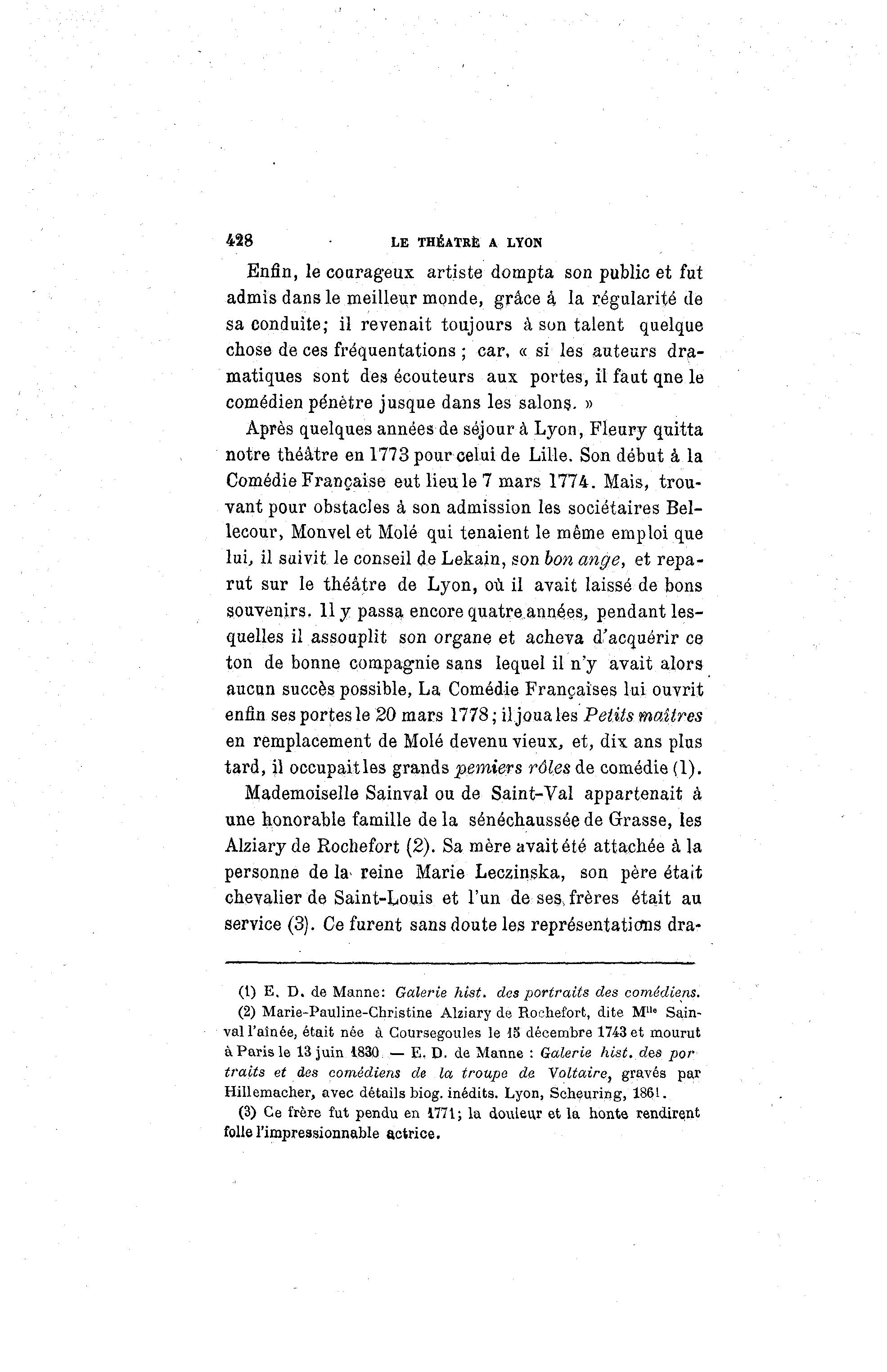 428 LE THÉÂTRE A LYON Enfin, le courageux artiste dompta son public et fut admis dans le meilleur monde, grâce à la régularité de sa conduite; il revenait toujours à son talent quelque chose de ces fréquentations ; car, « si les auteurs dra- matiques sont des écouteurs aux portes, il faut qne le comédien pénètre jusque dans les salons. » Après quelques années de séjour à Lyon, Fleury quitta notre théâtre en 1773 pour celui de Lille. Son début à la Comédie Française eut lieu le 7 mars 1774. Mais, trou- vant pour obstacles à son admission les sociétaires Bel- lecour, Monvel et Mole qui tenaient le même emploi que lui, il suivit le conseil de Lekain, son bon ange, et repa- rut sur le théâtre de Lyon, où il avait laissé de bons souvenirs. 11 y passa encore quatre années, pendant les- quelles il assouplit son organe et acheva d'acquérir ce ton de bonne compagnie sans lequel il n'y avait alors aucun succès possible, La Comédie Françaises lui ouvrit enfin ses portes le 20 mars 1778 ; il joua les Petits maîtres en remplacement de Mole devenu vieux, et, dix ans plus tard, il occupait les grands pemiers rôles de comédie (1). Mademoiselle Sainval ou de Saint-Val appartenait à une honorable famille de la sénéchaussée de Grasse, les Alziary de Rochefort (2). Sa mère avait été attachée à la personne de la> reine Marie Leczinska, son père était chevalier de Saint-Louis et l'un de ses, frères était au service (3). Ce furent sans doute les représentations dra- (1) E. D. de Manne: Galerie hist. des portraits des comédiens. (2) Marie-Pauline-Christine Alziary de Rochefort, dite M"" Sain- val l'aînée, était née à Goursegoules le 18 décembre 1743 et mourut à Paris le 13 juin 1830. — E. D. de Manne : Galerie hist. des por traits et des comédiens de la troupe de Voltaire, gravés par Hillemacher, avec détails biog. inédits. Lyon, Sûheuring, 1861. (3) Ce frère fut pendu en 1771; la douleur et la honte rendirent folle l'impressionnable actrice.