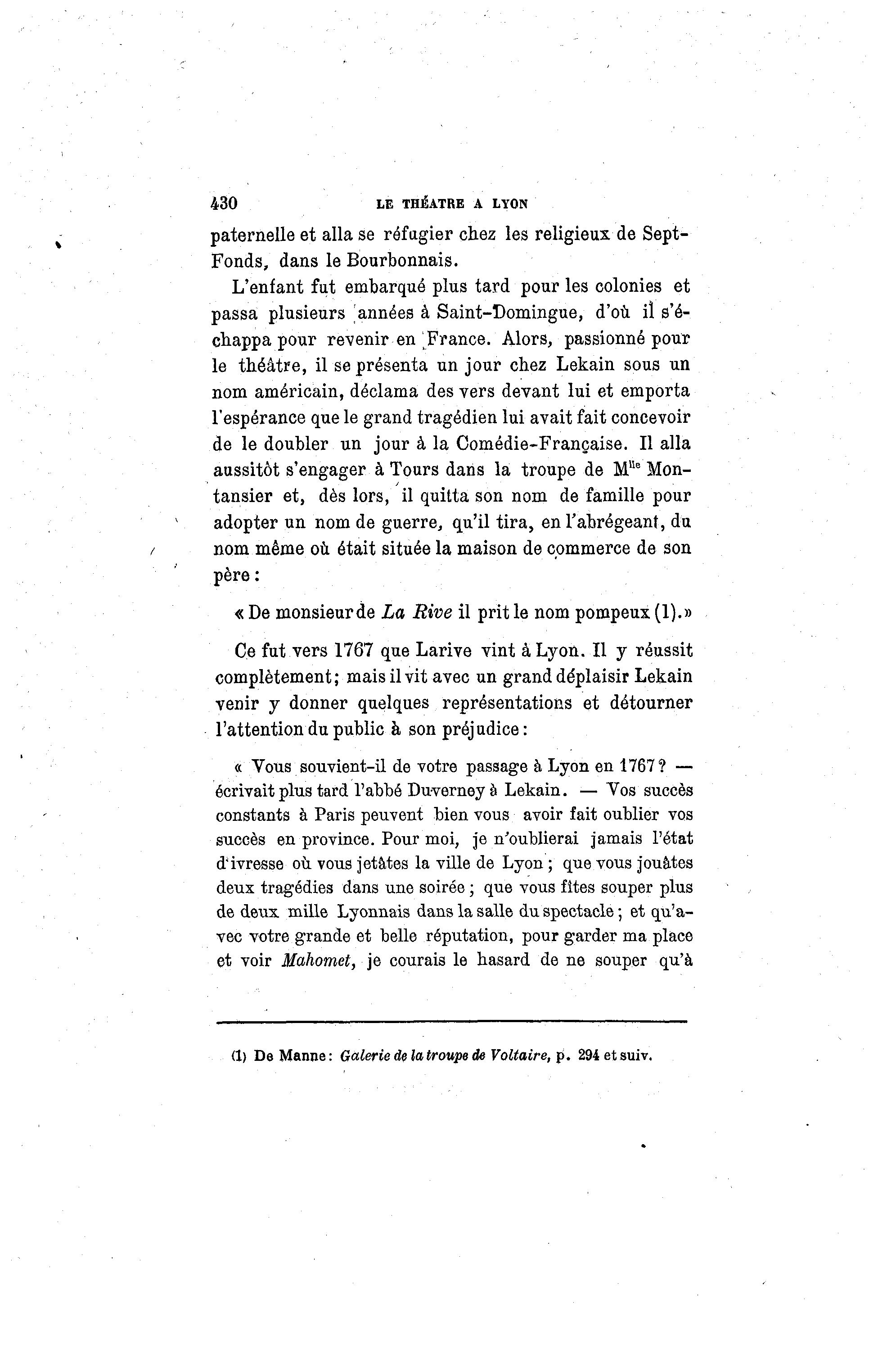 430 LE THÉÂTRE A LYON paternelle et alla se réfugier chez les religieux de Sept- Fonds, dans le Bourbonnais. L'enfant fut embarqué plus tard pour les colonies et passa plusieurs années à Saint-Domingue, d'où il s'é- chappa pour revenir en France. Alors, passionné pour le théâtre, il se présenta un jour chez Lekain sous un nom américain, déclama des vers devant lui et emporta l'espérance que le grand tragédien lui avait fait concevoir de le doubler un jour à la Comédie-Française. Il alla aussitôt s'engager à Tours dans la troupe de MUe Mon- tansier et, dès lors, il quitta son nom de famille pour adopter un nom de guerre, qu'il tira, en l'abrégeant, du nom même où était située la maison de commerce de son père : « De monsieurde La Rive il prit le nom pompeux (1).» Ce fut vers 1767 que Larive vint à Lyon. Il y réussit complètement; mais il vit avec un grand déplaisir Lekain venir y donner quelques représentations et détourner l'attention du public à son préjudice : « Vous souvient-il de votre passage à Lyon en 1767? — écrivait plus tard l'abbé Duverney à Lekain. — Yos succès constants à Paris peuvent bien vous avoir fait oublier vos succès en province. Pour moi, je n'oublierai jamais l'état d'ivresse où vous jetâtes la ville de Lyon ; que vous jouâtes deux tragédies dans une soirée ; que vous fîtes souper plus de deux mille Lyonnais dans la salle du spectacle ; et qu'a- vec votre grande et belle réputation, pour garder ma place et voir Mahomet, je courais le hasard de ne souper qu'à (1) De Manne: Galerie de la troupe de Voltaire, p . 294etsuiv.