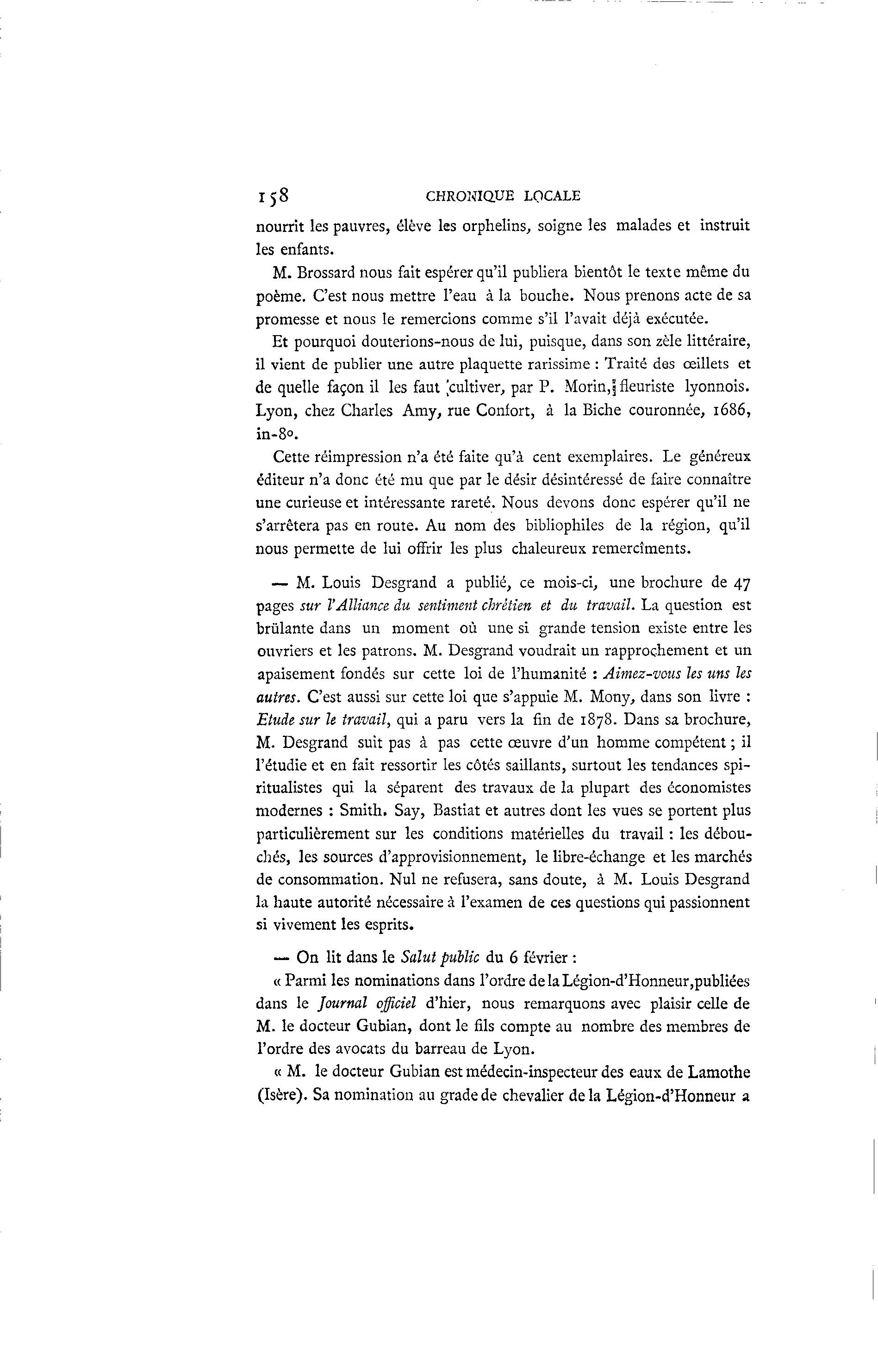158 CHRONIQUE LOCALE nourrit les pauvres, élève les orphelins, soigne les malades et instruit les enfants. M. Brossard nous fait espérer qu'il publiera bientôt le texte même du poème. C'est nous mettre l'eau à la bouche. Nous prenons acte de sa promesse et nous le remercions comme s'il l'avait déjà exécutée. Et pourquoi douterions-nous de lui, puisque, dans son zèle littéraire, il vient de publier une autre plaquette rarissime : Traité des œillets et de quelle façon il les faut [cultiver, par P. Morin,j fleuriste lyonnois. Lyon, chez Charles Amy, rue Confort, à la Biche couronnée, 1686, in-8°. Cette réimpression n'a été faite qu'à cent exemplaires. Le généreux éditeur n'a donc été mu que par le désir désintéressé de faire connaître une curieuse et intéressante rareté. Nous devons donc espérer qu'il ne s'arrêtera pas en route. Au nom des bibliophiles de la région, qu'il nous permette de lui offrir les plus chaleureux remercîments. — M. Louis Desgrand a publié, ce mois-ci, une brochure de 47 pages sur l'Alliance du sentiment chrétien et du travail. La question est brûlante dans un moment où une si grande tension existe entre les ouvriers et les patrons. M. Desgrand voudrait un rapprochement et un apaisement fondés sur cette loi de l'humanité : Aimez-vous les uns les autres. C'est aussi sur cette loi que s'appuie M. Mony, dans son livre : Etude sur le travail, qui a paru vers la fin de 1878. Dans sa brochure, M. Desgrand suit pas à pas cette œuvre d'un homme compétent ; il l'étudié et en fait ressortir les côtés saillants, surtout les tendances spi- ritualistes qui la séparent des travaux de la plupart des économistes modernes : Smith. Say, Bastiat et autres dont les vues se portent plus particulièrement sur les conditions matérielles du travail : les débou- chés, les sources d'approvisionnement, le libre-échange et les marchés de consommation. Nul ne refusera, sans doute, à M. Louis Desgrand la haute autorité nécessaire à l'examen de ces questions qui passionnent si vivement les esprits. — On lit dans le Salut public du 6 février : « Parmi les nominations dans l'ordre delaLégion-d'Honneur,publiées dans le Journal officiel d'hier, nous remarquons avec plaisir celle de M. le docteur Gubian, dont le fils compte au nombre des membres de l'ordre des avocats du barreau de Lyon. « M. le docteur Gubian est médecin-inspecteur des eaux de Lamothe (Isère). Sa nomination au grade de chevalier de la Légion-d'Honneur a