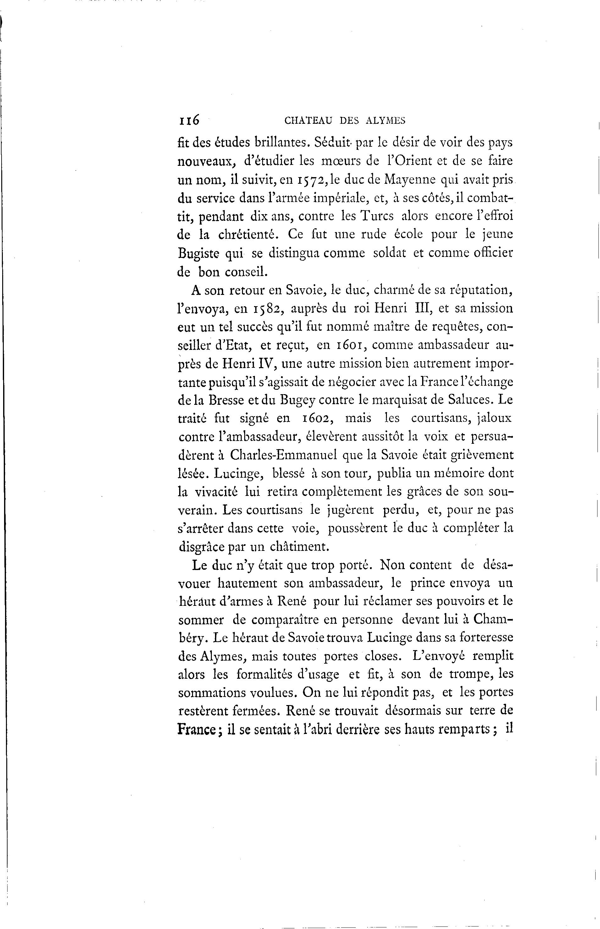 lié CHATEAU DES ALYMES fit des études brillantes. Séduit- par le désir de voir des pays nouveaux, d'étudier les mœurs de l'Orient et de se faire un nom, il suivit, en 1572,1e duc de Mayenne qui avait pris du service dans l'armée impériale, et, à ses côtés, il combat- tit, pendant dix ans, contre les Turcs alors encore l'effroi de la chrétienté. Ce fut une rude école pour le jeune Bugiste qui se distingua comme soldat et comme officier de bon conseil. A son retour en Savoie, le duc, charmé de sa réputation, l'envoya, en 1582, auprès du roi Henri III, et sa mission eut un tel succès qu'il fut nommé maître de requêtes, con- seiller d'Etat, et reçut, en 1601, comme ambassadeur au- près de Henri IV, une autre mission bien autrement impor- tante puisqu'il s'agissait de négocier avec la France l'échange delà Bresse et du Bugey contre le marquisat de Saluées. Le traité fut signé en 1602, mais les courtisans, jaloux contre l'ambassadeur, élevèrent aussitôt la voix et persua- dèrent à Charles-Emmanuel que la Savoie était grièvement lésée. Lucinge, blessé à son tour, publia un mémoire dont la vivacité lui retira complètement les grâces de son sou- verain. Les courtisans le jugèrent perdu, et, pour ne pas s'arrêter dans cette voie, poussèrent le duc à compléter la disgrâce par un châtiment. Le duc n'y était que trop porté. Non content de désa- vouer hautement son ambassadeur, le prince envoya un héraut d'armes à René pour lui réclamer ses pouvoirs et le sommer de comparaître en personne devant lui à Cham- béry. Le héraut de Savoie trouva Lucinge dans sa forteresse des Alymes, mais toutes portes closes. L'envoyé remplit alors les formalités d'usage et fit, à son de trompe, les sommations voulues. On ne lui répondit pas, et les portes restèrent fermées. René se trouvait désormais sur terre de France; il se sentait à l'abri derrière ses hauts remparts ; il