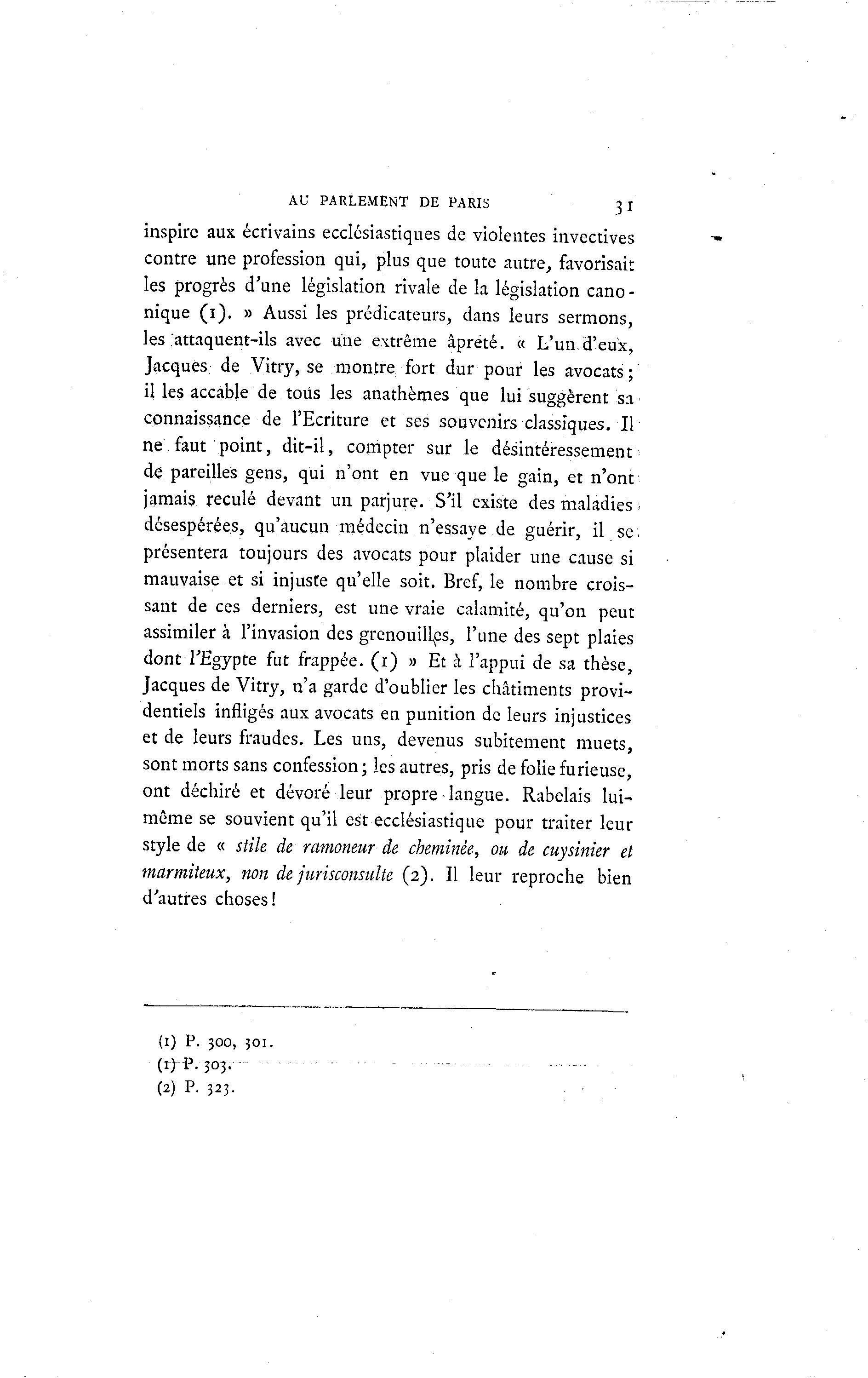 AU PARLEMENT DE PARIS 3I inspire aux écrivains ecclésiastiques de violentes invectives contre une profession qui, plus que toute autre, favorisait les progrès d'une législation rivale de la législation cano - nique ( i ) . » Aussi les prédicateurs, dans leurs sermons, les attaquent-ils avec une extrême âpreté. « L'un d'eux, Jacques de Vitry, se montre fort dur pour les avocats; il les accable de tous les anathèmes que lui suggèrent sa connaissance de l'Ecriture et ses souvenirs classiques. Il ne faut point, dit-il, compter sur le désintéressement de pareilles gens, qui n'ont en vue que le gain, et n'ont jamais reculé devant un parjure. S'il existe des maladies désespérées, qu'aucun médecin n'essaye de guérir, il se. présentera toujours des avocats pour plaider une cause si mauvaise et si injuste qu'elle soit. Bref, le nombre crois- sant de ces derniers, est une vraie calamité, qu'on peut assimiler à l'invasion des grenouilles, l'une des sept plaies dont l'Egypte fut frappée, (x) » Et à l'appui de sa thèse, Jacques de Vitry, n'a garde d'oublier les châtiments provi- dentiels infligés aux avocats en punition de leurs injustices et de leurs fraudes. Les uns, devenus subitement muets, sont morts sans confession ; les autres, pris de folie furieuse, ont déchiré et dévoré leur propre langue. Rabelais lui- même se souvient qu'il est ecclésiastique pour traiter leur style de « stile de ramoneur de cheminée, ou de cuysinier et marmiîeux, non de jurisconsulte (2). Il leur reproche bien d'autres choses! (1) P. 300, 301. (1)^-303. (2) P. 323-