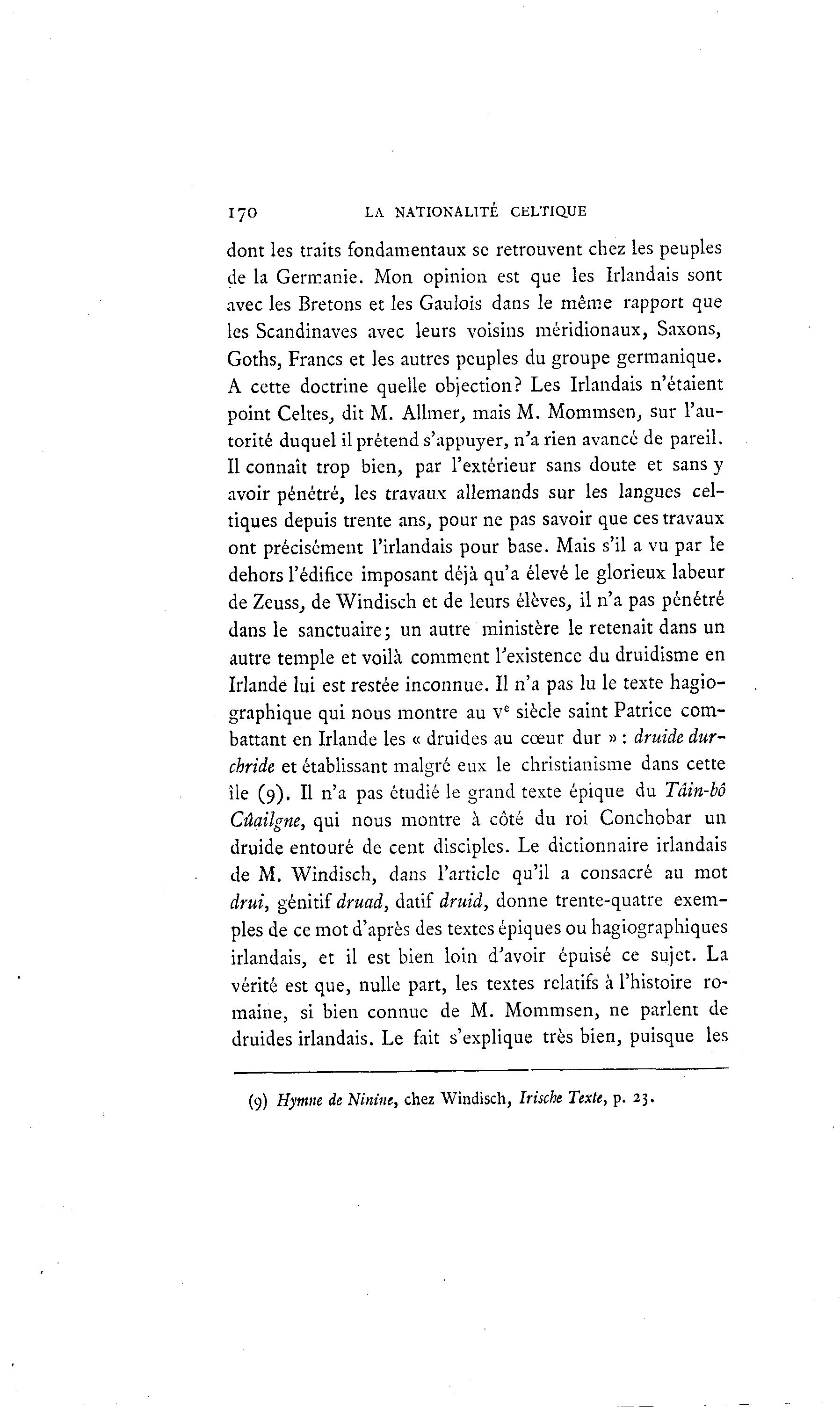 IJO LA NATIONALITÉ CELTIQUE dont les traits fondamentaux se retrouvent chez les peuples de la Germanie. Mon opinion est que les Irlandais sont avec les Bretons et les Gaulois dans le même rapport que les Scandinaves avec leurs voisins méridionaux, Saxons, Goths, Francs et les autres peuples du groupe germanique. A cette doctrine quelle objection? Les Irlandais n'étaient point Celtes, dit M. Allmer, mais M. Mommsen, sur l'au- torité duquel il prétend s'appuyer, n'a rien avancé de pareil. Il connaît trop bien, par l'extérieur sans doute et sans y avoir pénétré, les travaux allemands sur les langues cel- tiques depuis trente ans, pour ne pas savoir que ces travaux ont précisément l'irlandais pour base. Mais s'il a vu par le dehors l'édifice imposant déjà qu'a élevé le glorieux labeur de Zeuss, de Windisch et de leurs élèves, il n'a pas pénétré dans le sanctuaire; un autre ministère le retenait dans un autre temple et voilà comment l'existence du druidisme en Irlande lui est restée inconnue. Il n'a pas lu le texte hagio- graphique qui nous montre au Ve siècle saint Patrice com- battant en Irlande les « druides au cœur dur » : druide dur- chride et établissant malgré eux le christianisme dans cette île (9). Il n'a pas étudié le grand texte épique du Tâin-bô Cûaiîgne, qui nous montre à côté du roi Conchobar un druide entouré de cent disciples. Le dictionnaire irlandais de M. Windisch, dans l'article qu'il a consacré au mot drui, génitif druad, datif druid, donne trente-quatre exem- ples de ce mot d'après des textes épiques ou hagiographiques irlandais, et il est bien loin d'avoir épuisé ce sujet. La vérité est que, nulle part, les textes relatifs à l'histoire ro- maine, si bien connue de M. Mommsen, ne parlent de druides irlandais. Le fait s'explique très bien, puisque les (9) Hymne de Ninine, chez Windisch, Irische Texte, p. 23.