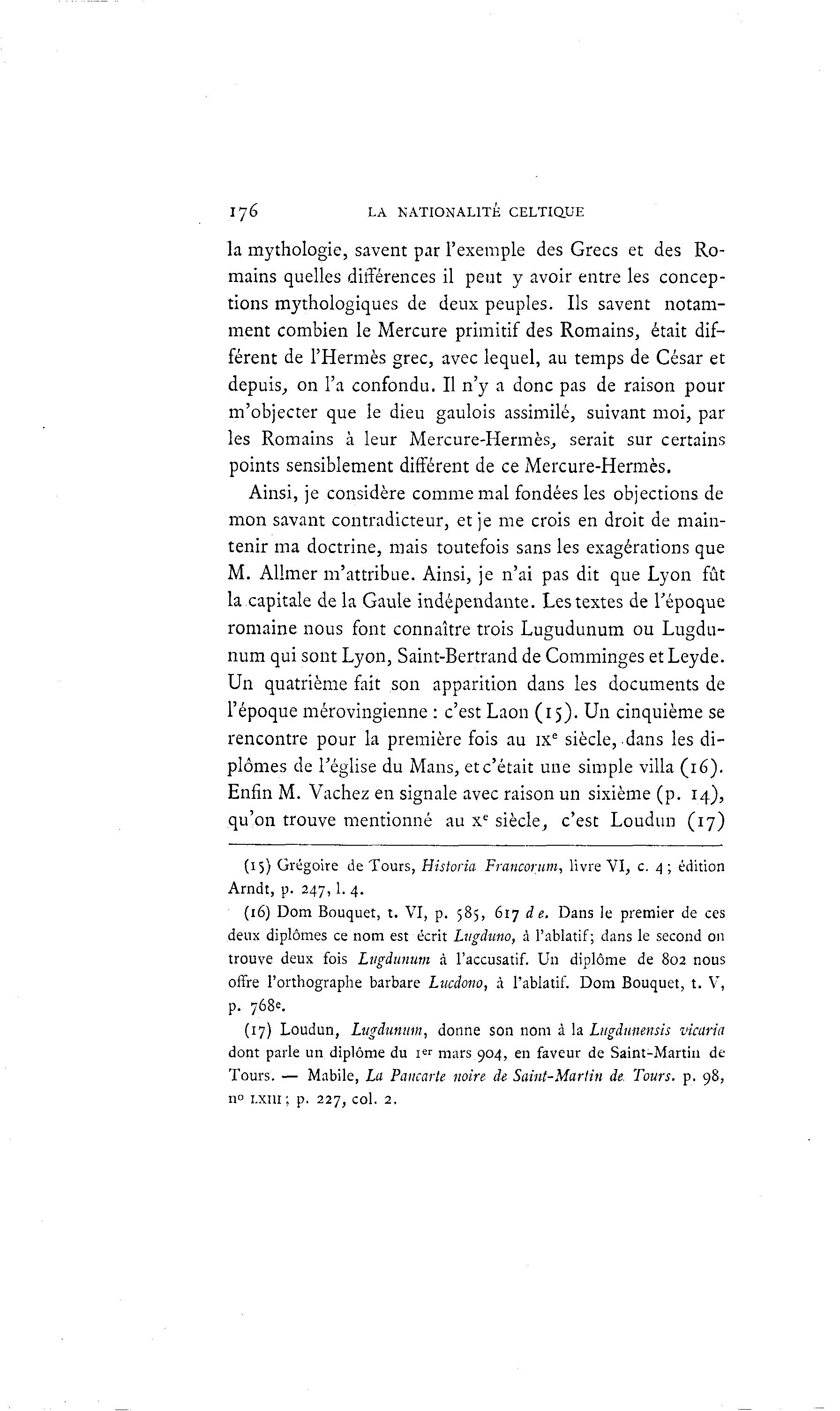 I76 LA NATIONALITÉ CELTIQUE la mythologie, savent par l'exemple des Grecs et des Ro- mains quelles différences il peut y avoir entre les concep- tions mythologiques de deux peuples. Ils savent notam- ment combien le Mercure primitif des Romains, était dif- férent de l'Hermès grec, avec lequel, au temps de César et depuis., on l'a confondu. Il n'y a donc pas de raison pour m'objecter que le dieu gaulois assimilé, suivant moi, par les Romains à leur Mercure-Hermès, serait sur certains points sensiblement différent de ce Mercure-Hermès. Ainsi, je considère comme mal fondées les objections de mon savant contradicteur, et je me crois en droit de main- tenir ma doctrine, mais toutefois sans les exagérations que M. Allmer m'attribue. Ainsi, je n'ai pas dit que Lyon fût la capitale de la Gaule indépendante. Les textes de l'époque romaine nous font connaître trois Lugudunutn ou Lugdu- num qui sont Lyon, Saint-Bertrand de Comminges et Leyde. Un quatrième fait son apparition dans les documents de l'époque mérovingienne : c'est Laon (15). Un cinquième se rencontre pour la première fois au IXe siècle, dans les di- plômes de l'église du Mans, etc'était une simple villa (16). Enfin M. Vachez en signale avec raison un sixième (p. 14), qu'on trouve mentionné au Xe siècle, c'est Loudun (17) (15) Grégoire de Tours, Historia Francorum, livre VI, c. 4 ; édition Arndt, p. 247,1. 4. (16) Dom Bouquet, t. VI, p. 585, 617 de. Dans le premier de ces deux diplômes ce nom est écrit Lugduno, à l'ablatif; dans le second on trouve deux fois Lugdunum à l'accusatif. Un diplôme de 802 nous offre l'orthographe barbare Lucdono, à l'ablatif. Dom Bouquet, t. V, p. 768e. (17) Loudun, Lugdunum, donne son nom à la Lugdunensis vkaria dont parle un diplôme du i er mars 904, en faveur de Saint-Martin de Tours. — Mabile, La Pancarte noire de Saint-Martin de Tours, p. 98, n° i.xm; p. 227, col. 2.