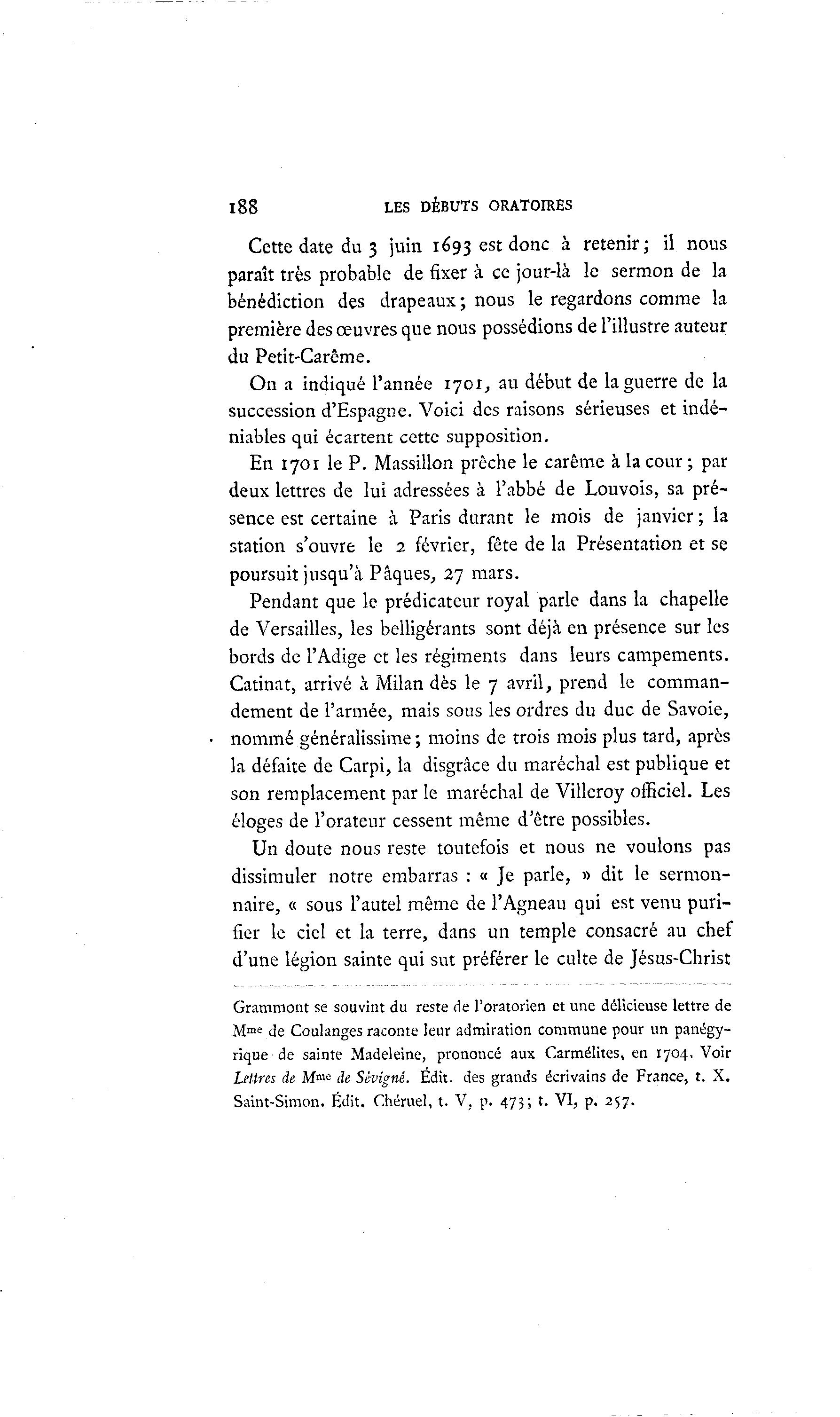 i88 LES DÉBUTS ORATOIRES Cette date du 3 juin 1693 est donc à retenir; il nous paraît très probable de fixer à ce jour-là le sermon de la bénédiction des drapeaux; nous le regardons comme la première des œuvres que nous possédions de l'illustre auteur du Petit-Carême. On a indiqué l'année 1701, au début de la guerre de la succession d'Espagne. Voici des raisons sérieuses et indé- niables qui écartent cette supposition. En 1701 le P. Massillon prêche le carême à la cour ; par deux lettres de lui adressées à l'abbé de Louvois, sa pré- sence est certaine à Paris durant le mois de janvier ; la station s'ouvre le 2 février, fête de la Présentation et se poursuit jusqu'à Pâques, 27 mars. Pendant que le prédicateur royal parle dans la chapelle de Versailles, les belligérants sont déjà en présence sur les bords de l'Adige et les régiments dans leurs campements. Catinat, arrivé à Milan dès le 7 avril, prend le comman- dement de l'armée, mais sous les ordres du duc de Savoie, nommé généralissime ; moins de trois mois plus tard, après la défaite de Carpi, la disgrâce du maréchal est publique et son remplacement par le maréchal de Villeroy officiel. Les éloges de l'orateur cessent même d'être possibles. Un doute nous reste toutefois et nous ne voulons pas dissimuler notre embarras : « Je parle, » dit le sermon- naire, « sous l'autel même de l'Agneau qui est venu puri- fier le ciel et la terre, dans un temple consacré au chef d'une légion sainte qui sut préférer le culte de Jésus-Christ Grammont se souvint du reste de l'oratorien et une délicieuse lettre de Mme de Coulanges raconte leur admiration commune pour un panégy- rique de sainte Madeleine, prononcé aux Carmélites, en 1704. Voir Lettres de Mme de Sévigné. Edit. des grands écrivains de France, t. X. Saint-Simon. Édit. Chéruel, t. V, p. 473; t. VI, p. 257.