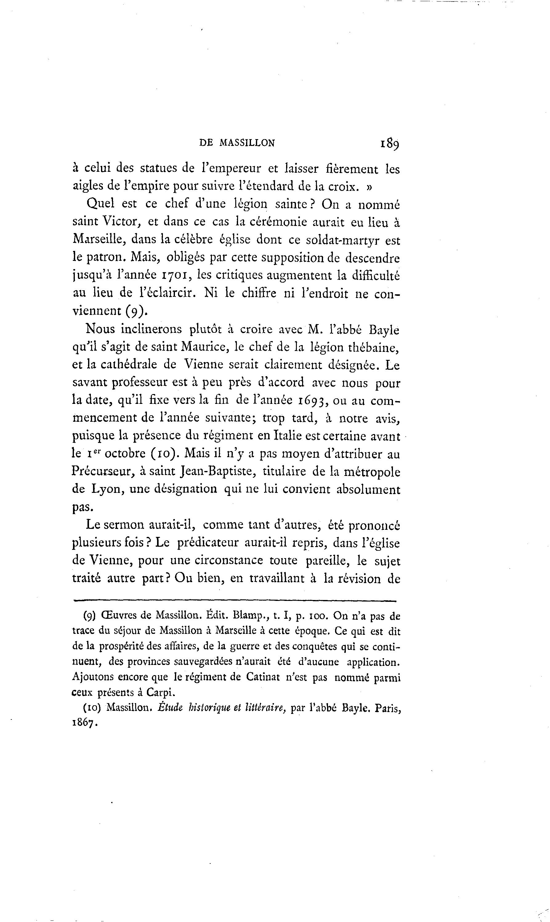 DE MASSILLON 189 à celui des statues de l'empereur et laisser fièrement les aigles de l'empire pour suivre l'étendard de la croix. » Quel est ce chef d'une légion sainte? On a nommé saint Victor, et dans ce cas la cérémonie aurait eu lieu à Marseille, dans la célèbre église dont ce soldat-martyr est le patron. Mais, obligés par cette supposition de descendre jusqu'à l'année 1701, les critiques augmentent la difficulté au lieu de l'éclaircir. Ni le chiffre ni l'endroit ne con- viennent (9). Nous inclinerons plutôt à croire avec M. l'abbé Bayle qu'il s'agit de saint Maurice, le chef de la légion thébaine, et la cathédrale de Vienne serait clairement désignée. Le savant professeur est à peu près d'accord avec nous pour la date, qu'il fixe vers la fin de l'année 1693, ou au com- mencement de l'année suivante; trop tard, à notre avis, puisque la présence du régiment en Italie est certaine avant le I er octobre (10). Mais il n'y a pas moyen d'attribuer au Précurseur, à saint Jean-Baptiste, titulaire de la métropole de Lyon, une désignation qui ne lui convient absolument pas. Le sermon aurait-il, comme tant d'autres, été prononcé plusieurs fois ? Le prédicateur aurait-il repris, dans l'église de Vienne, pour une circonstance toute pareille, le sujet traité autre part? Ou bien, en travaillant à la révision de (9) Œuvres de Massillon. Édit. Blamp., 1.1, p. 100. On n'a pas de trace du séjour de Massillon à Marseille à cette époque. Ce qui est dit de la prospérité des affaires, de la guerre et des conquêtes qui se conti- nuent, des provinces sauvegardées n'aurait été d'aucune application. Ajoutons encore que le régiment de Catinat n'est pas nommé parmi ceux présents à Carpi. (10) Massillon. Étude- historique et littéraire, par l'abbé Bayle. Paris, 1867.