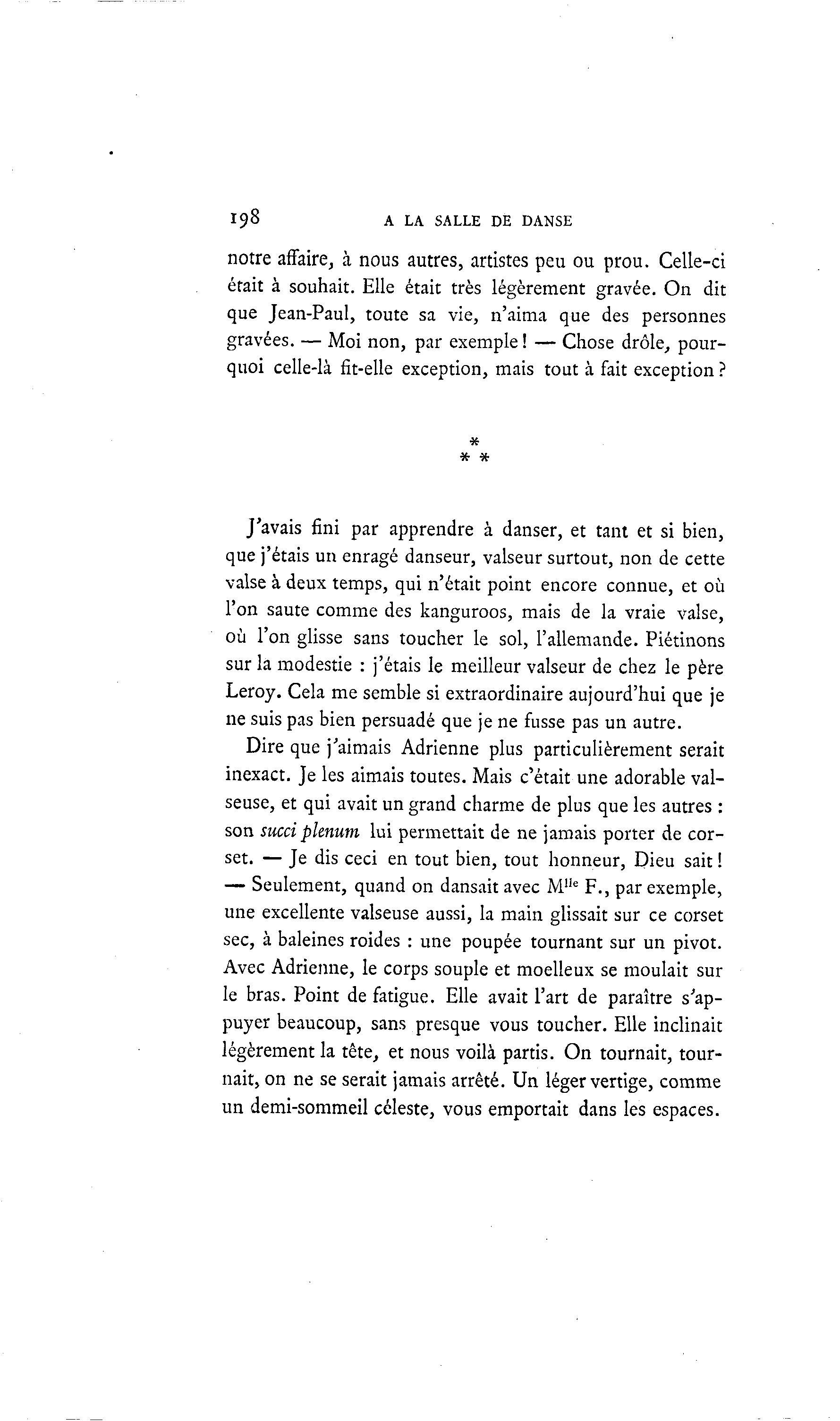 198 A LA SALLE DE DANSE notre affaire, à nous autres, artistes peu ou prou. Celle-ci était à souhait. Elle était très légèrement gravée. On dit que Jean-Paul, toute sa vie, n'aima que des personnes gravées. — Moi non, par exemple ! — Chose drôle, pour- quoi celle-là fit-elle exception, mais tout à fait exception ? J'avais fini par apprendre à danser, et tant et si bien, que j'étais un enragé danseur, valseur surtout, non de cette valse à deux temps, qui n'était point encore connue, et où l'on saute comme des kanguroos, mais de la vraie valse, où l'on glisse sans toucher le sol, l'allemande. Piétinons sur la modestie : j'étais le meilleur valseur de chez le père Leroy. Cela me semble si extraordinaire aujourd'hui que je ne suis pas bien persuadé que je ne fusse pas un autre. Dire que j'aimais Adrienne plus particulièrement serait inexact. Je les aimais toutes. Mais c'était une adorable val- seuse, et qui avait un grand charme de plus que les autres : son succi plénum lui permettait de ne jamais porter de cor- set. — Je dis ceci en tout bien, tout honneur, Dieu sait ! — Seulement, quand on dansait avec M1Ie F., par exemple, une excellente valseuse aussi, la main glissait sur ce corset sec, à baleines roides : une poupée tournant sur un pivot. Avec Adrienne, le corps souple et moelleux se moulait sur le bras. Point de fatigue. Elle avait l'art de paraître s'ap- puyer beaucoup, sans presque vous toucher. Elle inclinait légèrement la tête, et nous voilà partis. On tournait, tour- nait, on ne se serait jamais arrêté. Un léger vertige, comme un demi-sommeil céleste, vous emportait dans les espaces.
