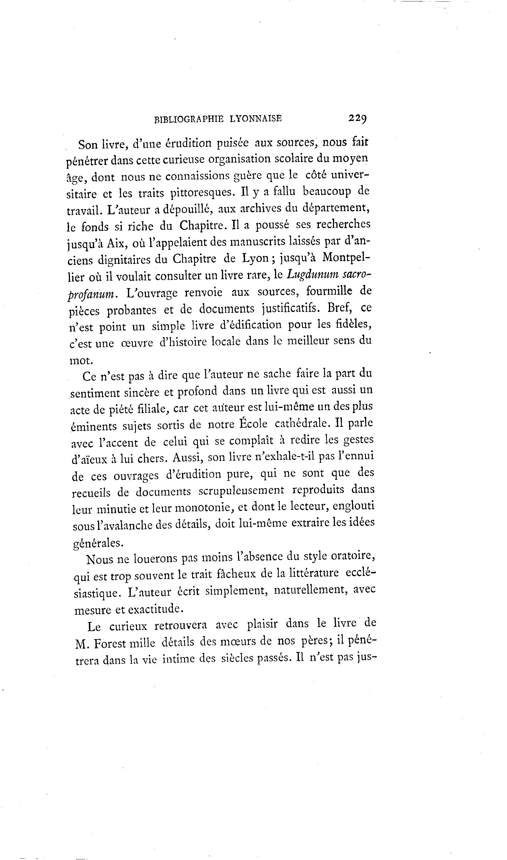 BIBLIOGRAPHIE LYONNAISE 229 Son livre, d'une érudition puisée aux sources, nous fait pénétrer dans cette curieuse organisation scolaire du moyen âge, dont nous ne connaissions guère que le côté univer- sitaire et les traits pittoresques. Il y a fallu beaucoup de travail. L'auteur a dépouillé, aux archives du département, le fonds si riche du Chapitre. Il a poussé ses recherches jusqu'à Aix, où l'appelaient des manuscrits laissés par d'an- ciens dignitaires du Chapitre de Lyon ; jusqu'à Montpel- lier où il voulait consulter un livre rare, le Lugdunum sacro- prof anum. L'ouvrage renvoie aux sources, fourmille de pièces probantes et de documents justificatifs. Bref, ce n'est point un simple livre d'édification pour les fidèles, c'est une œuvre d'histoire locale dans le meilleur sens du mot. Ce n'est pas à dire que l'auteur ne sache faire la part du sentiment sincère et profond dans un livre qui est aussi un acte de piété filiale, car cet auteur est lui-même un des plus éminents sujets sortis de notre Ecole cathédrale. Il parle avec l'accent de celui qui se complaît à redire les gestes d'aïeux à lui chers. Aussi, son livre n'exhale-t-il pas l'ennui de ces ouvrages d'érudition pure, qui ne sont que des recueils de documents scrupuleusement reproduits dans leur minutie et leur monotonie, et dont le lecteur, englouti sous l'avalanche des détails, doit lui-même extraire les idées générales. Nous ne louerons pas moins l'absence du style oratoire, qui est trop souvent le trait fâcheux de la littérature ecclé- siastique. L'auteur écrit simplement, naturellement, avec mesure et exactitude. Le curieux retrouvera avec plaisir dans le livre de M. Forest mille détails des moeurs de nos pères; il péné- trera dans la vie intime des siècles passés. Il n'est pas jus-