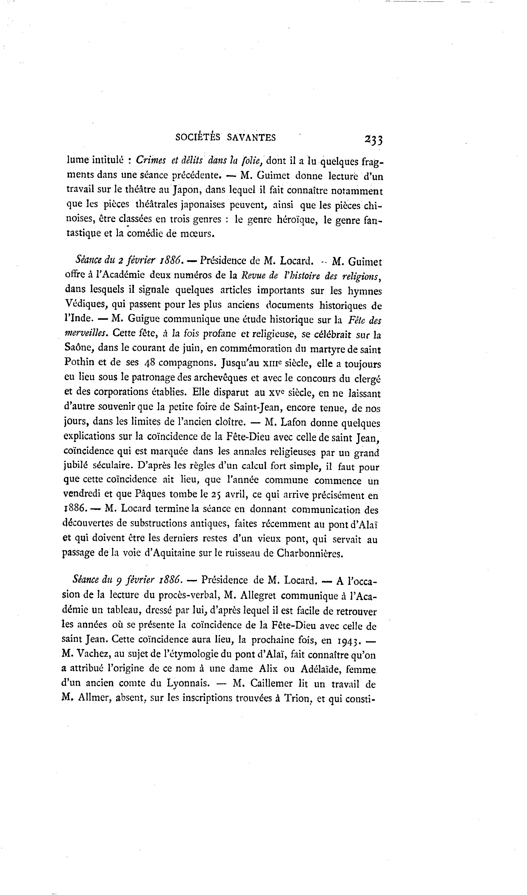 SOCIÉTÉS SAVANTES 333 lume intitulé : Crimes et délits dans h folie, dont il a lu quelques frag- ments dans une séance précédente. — M. Guimet donne lecture d'un travail sur le théâtre au Japon, dans lequel il fait connaître notamment que les pièces théâtrales japonaises peuvent, ainsi que les pièces chi- noises, être classées en trois genres : le genre héroïque, le genre fan- tastique et la comédie de mœurs. Séance du 2 février 1886. — Présidence de M. Locard. •• M. Guimet offre à l'Académie deux numéros de la Revue de l'histoire des religions, dans lesquels il signale quelques articles importants sur les hymnes Védiques, qui passent pour les plus anciens documents historiques de l'Inde. — M. Guigue communique une étude historique sur la Fête des merveilles. Cette fête, à la fois profane et religieuse, se célébrait sur la Saône, dans le courant de juin, en commémoration dn martyre de saint Pothin et de ses 48 compagnons. Jusqu'au xm e siècle, elle a toujours eu lieu sous le patronage des archevêques et avec le concours du clergé et des corporations établies. Elle disparut au xv° siècle, en ne laissant d'autre souvenir que la petite foire de Saint-Jean, encore tenue, de nos jours, dans les limites de l'ancien cloître. — M. Lafon donne quelques explications sur la coïncidence de la Fête-Dieu avec celle de saint Jean, coïncidence qui est marquée dans les annales religieuses par un grand jubilé séculaire. D'après les règles d'un calcul fort simple, il faut pour que cette coïncidence ait lieu, que l'année commune commence un vendredi et que Pâques tombe le 25 avril, ce qui arrive précisément en 1886.— M. Locard termine la séance en donnant communication des découvertes de substructions antiques, faites récemment au pont d'Alaï et qui doivent être les derniers restes d'un vieux pont, qui servait au passage de la voie d'Aquitaine sur le ruisseau de Charbonnières. Séance du 9 février 1886. — Présidence de M. Locard. — A l'occa- sion de la lecture du procès-verbal, M. Allegret communique à l'Aca- démie un tableau, dressé par lui, d'après lequel il est facile de retrouver les années où se présente la coïncidence de la Fête-Dieu avec celle de saint Jean. Cette coïncidence aura lieu, la prochaine fois, en 1943. — M. Vachez, au sujet de l'étymologie du pont d'Alaï, fait connaître qu'on a attribué l'origine de ce nom à une dame Alix ou Adélaïde, femme d'un ancien comte du Lyonnais. — M. Caillemer lit un travail de M, Allmer, absent, sur les inscriptions trouvées à Trion, et qui consti-