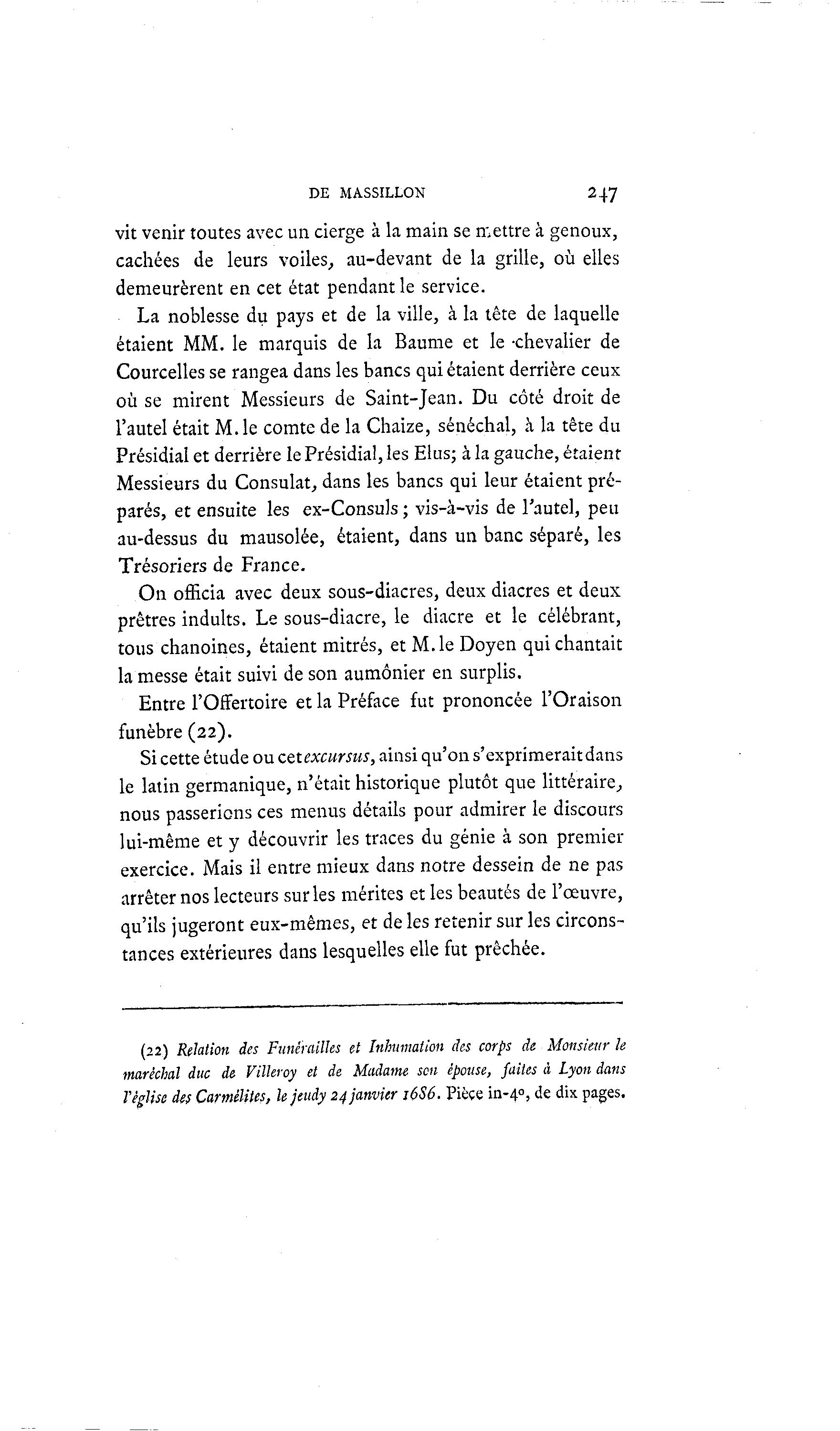 DE MASSILLON 247 vit venir toutes avec un cierge à la main se mettre à genoux, cachées de leurs voiles, au-devant de la grille, où elles demeurèrent en cet état pendant le service. La noblesse du pays et de la ville, à la tête de laquelle étaient MM. le marquis de la Baume et le -chevalier de Courcelles se rangea dans les bancs qui étaient derrière ceux où se mirent Messieurs de Saint-Jean. Du côté droit de l'autel était M. le comte de la Chaize, sénéchal, à la tête du Présidial et derrière le Présidial, les Elus; à la gauche, étaient Messieurs du Consulat, dans les bancs qui leur étaient pré- parés, et ensuite les ex-Consuls ; vis-à -vis de l'autel, peu au-dessus du mausolée, étaient, dans un banc séparé, les Trésoriers de France. On officia avec deux sous-diacres, deux diacres et deux prêtres induits. Le sous-diacre, le diacre et le célébrant, tous chanoines, étaient mitres, et M. le Doyen qui chantait la messe était suivi de son aumônier en surplis. Entre l'Offertoire et la Préface fut prononcée l'Oraison funèbre (22). Si cette étude ou cetexcursus, ainsi qu'on s'exprimerait dans le latin germanique, n'était historique plutôt que littéraire, nous passerions ces menus détails pour admirer le discours lui-même et y découvrir les traces du génie à son premier exercice. Mais il entre mieux dans notre dessein de ne pas arrêter nos lecteurs sur les mérites et les beautés de l'œuvre, qu'ils jugeront eux-mêmes, et de les retenir sur les circons- tances extérieures dans lesquelles elle fut prêchée. (22) Relation des Funérailles et Inhumation des corps de Monsieur le maréchal duc de Villeroy et de Madame son épouse, faites à Lyon dans Véglise des Carmélites, lejeudy 24 janvier 16S6. Pièce in-4 0 , de dix pages.