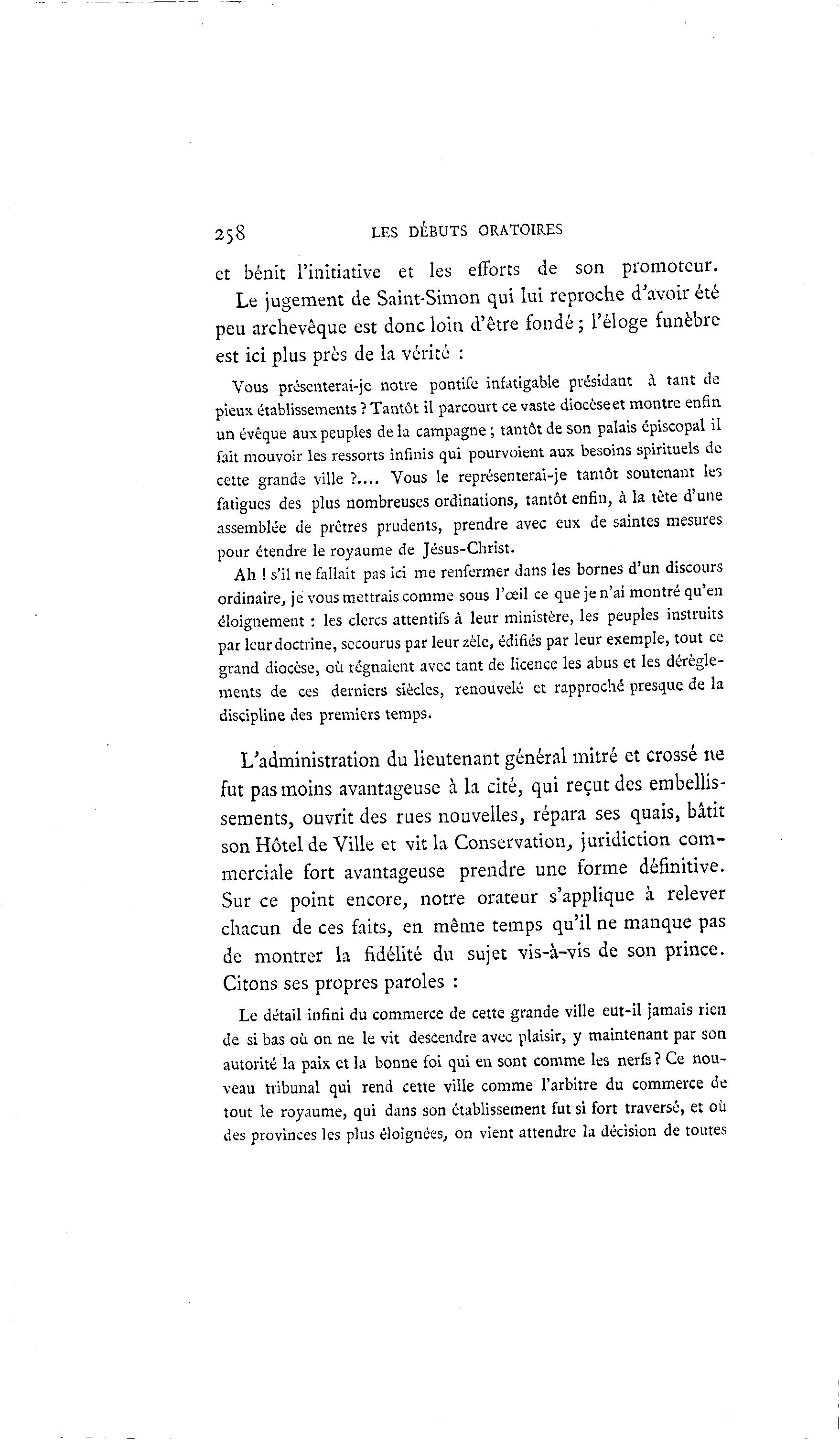 258 LES DÉBUTS ORATOIRES et bénit l'initiative et les efforts de son promoteur. Le jugement de Saint-Simon qui lui reproche d'avoir été peu archevêque est donc loin d'être fondé ; l'éloge funèbre est ici plus près de la vérité : Vous présenterai-je notre pontife infatigable présidant à tant de pieux établissements ? Tantôt il parcourt ce vaste diocèse et montre enfin un évêque aux peuples de la campagne ; tantôt de son palais épiscopal il fait mouvoir les ressorts infinis qui pourvoient aux besoins spirituels de cette grande ville ?.... Vous le représenterai-je tantôt soutenant les fatigues des plus nombreuses ordinations, tantôt enfin, à la tête d'une assemblée de prêtres prudents, prendre avec eux de saintes mesures pour étendre le royaume de Jésus-Christ. Ah ! s'il ne fallait pas ici me renfermer dans les bornes d'un discours ordinaire, je vous mettrais comme sous l'oeil ce que je n'ai montré qu'en éloignement : les clercs attentifs à leur ministère, les peuples instruits par leur doctrine, secourus par leur zèle, édifiés par leur exemple, tout ce grand diocèse, où régnaient avec tant de licence les abus et les dérègle- ments de ces derniers siècles, renouvelé et rapproché presque de la discipline des premiers temps. L'administration du lieutenant général mitre et crosse ive fut pas moins avantageuse à la cité, qui reçut des embellis- sements, ouvrit des rues nouvelles, répara ses quais, bâtit son Hôtel de Ville et vit la Conservation, juridiction com- merciale fort avantageuse prendre une forme définitive. Sur ce point encore, notre orateur s'applique à relever chacun de ces faits, en même temps qu'il ne manque pas de montrer la fidélité du sujet vis-à -vis de son prince. Citons ses propres paroles : Le détail infini du commerce de cette grande ville eut-il jamais rien de si bas où on ne le vit descendre avec plaisir, y maintenant par son autorité la paix et la bonne foi qui en sont comme les nerfs? Ce nou- veau tribunal qui rend cette ville comme l'arbitre du commerce de tout le royaume, qui dans son établissement fut si fort traversé, et où des provinces les plus éloignées, on vient attendre la décision de toutes