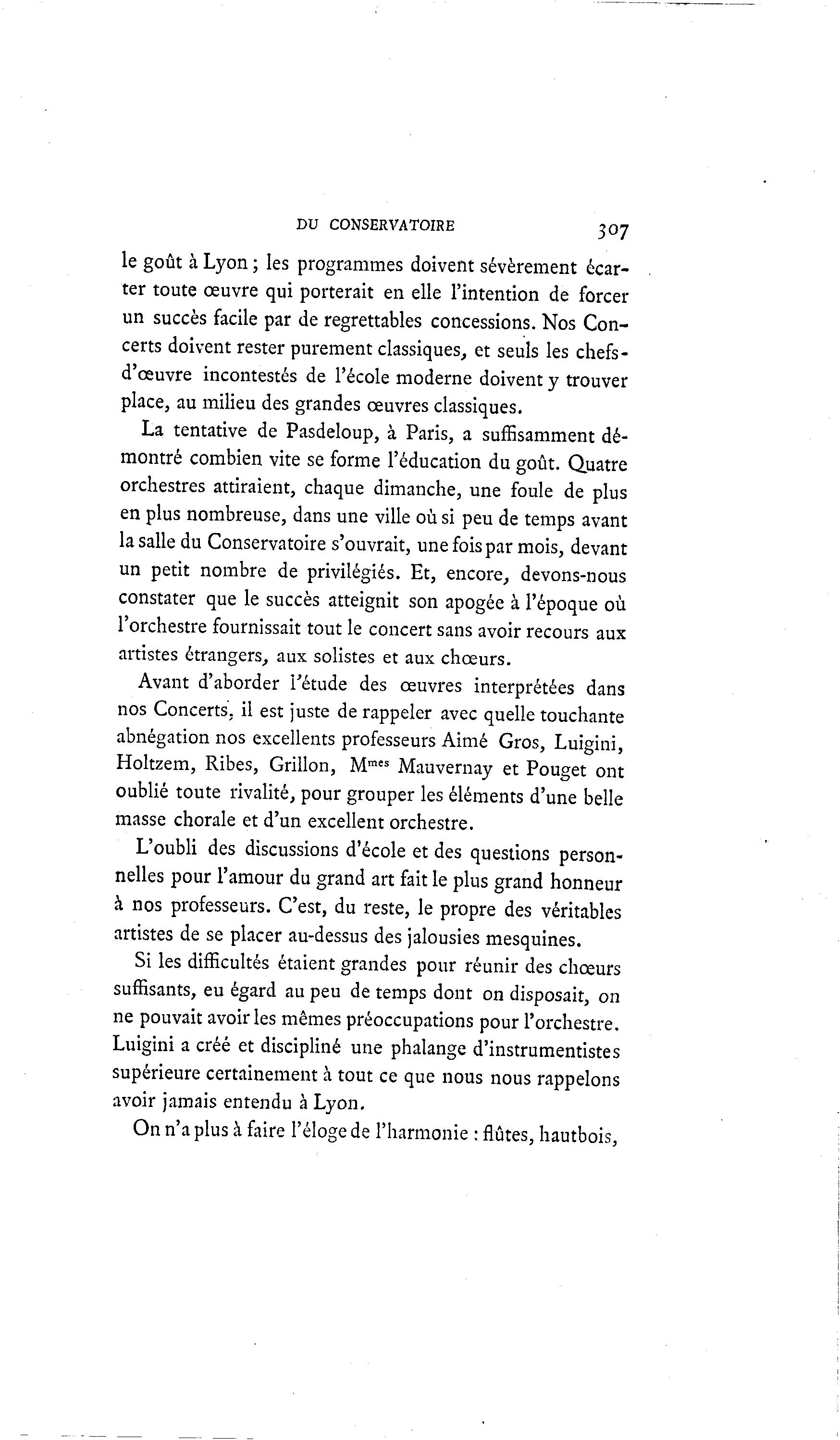 DU CONSERVATOIRE 307 le goût à Lyon ; les programmes doivent sévèrement écar- ter toute oeuvre qui porterait en elle l'intention de forcer un succès facile par de regrettables concessions. Nos Con- certs doivent rester purement classiques, et seuls les chefs- d'œuvre incontestés de l'école moderne doivent y trouver place, au milieu des grandes oeuvres classiques. La tentative de Pasdeloup, à Paris, a suffisamment dé- montré combien vite se forme l'éducation du goût. Quatre orchestres attiraient, chaque dimanche, une foule de plus en plus nombreuse, dans une ville où si peu de temps avant la salle du Conservatoire s'ouvrait, une fois par mois, devant un petit nombre de privilégiés. Et, encore, devons-nous constater que le succès atteignit son apogée à l'époque où l'orchestre fournissait tout le concert sans avoir recours aux artistes étrangers, aux solistes et aux chœurs. Avant d'aborder l'étude des œuvres interprétées dans nos Concerts, il est juste de rappeler avec quelle touchante abnégation nos excellents professeurs Aimé Gros, Luigini, Holtzem, Ribes, Grillon, Mmes Mauvernay et Pouget ont oublié toute rivalité, pour grouper les éléments d'une belle masse chorale et d'un excellent orchestre. L'oubli des discussions d'école et des questions person- nelles pour l'amour du grand art fait le plus grand honneur à nos professeurs. C'est, du reste, le propre des véritables artistes de se placer au-dessus des jalousies mesquines. Si les difficultés étaient grandes pour réunir des chœurs suffisants, eu égard au peu de temps dont on disposait, on ne pouvait avoir les mêmes préoccupations pour l'orchestre. Luigini a créé et discipliné une phalange d'instrumentistes supérieure certainement à tout ce que nous nous rappelons avoir jamais entendu à Lyon. On n'a plus à faire l'éloge de l'harmonie : flûtes, hautbois,