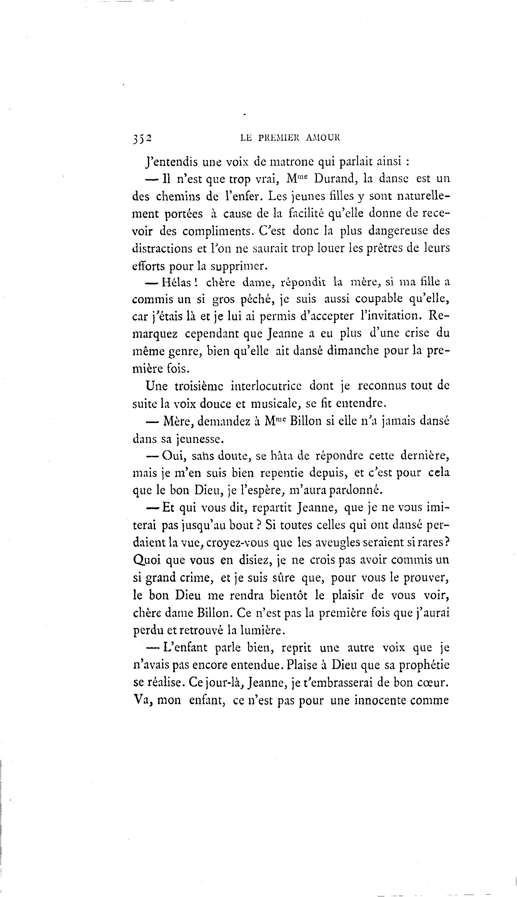 352 LE PREMIER AMOUR J'entendis une voix de matrone qui parlait ainsi : — Il n'est que trop vrai, Mme Durand, la danse est un des chemins de l'enfer. Les jeunes filles y sont naturelle- ment portées à cause de la facilité qu'elle donne de rece- voir des compliments. C'est donc la plus dangereuse des distractions et Ton ne saurait trop louer les prêtres de leurs efforts pour la supprimer. — Hélas '. chère dame, répondit la mère, si ma fille a commis un si gros péché, je suis aussi coupable qu'elle, car j'étais là et je lui ai permis d'accepter l'invitation. Re- marquez cependant que Jeanne a eu plus d'une crise du même genre, bien qu'elle ait dansé dimanche pour la pre- mière fois. Une troisième interlocutrice dont je reconnus tout de suite la voix douce et musicale, se fit entendre. — Mère, demandez à Mrac Billon si elle n'a jamais dansé dans sa jeunesse. — Oui, sans doute, se hâta de répondre cette dernière, mais je m'en suis bien repentie depuis, et c'est pour cela que le bon Dieu, je l'espère, m'aura pardonné. — Et qui vous dit, repartit Jeanne, que je ne vous imi- terai pas jusqu'au bout ? Si toutes celles qui ont dansé per- daient la vue, croyez-vous que les aveugles seraient si rares? Quoi que vous en disiez, je ne crois pas avoir commis un si grand crime, et je suis sûre que, pour vous le prouver, le bon Dieu me rendra bientôt le plaisir de vous voir, chère dame Billon. Ce n'est pas la première fois que j'aurai perdu et retrouvé la lumière. — L'enfant parle bien, reprit une autre voix que je n'avais pas encore entendue. Plaise à Dieu que sa prophétie se réalise. Ce jour-là , Jeanne, je t'embrasserai de bon cœur. Va, mon enfant, ce n'est pas pour une innocente comme