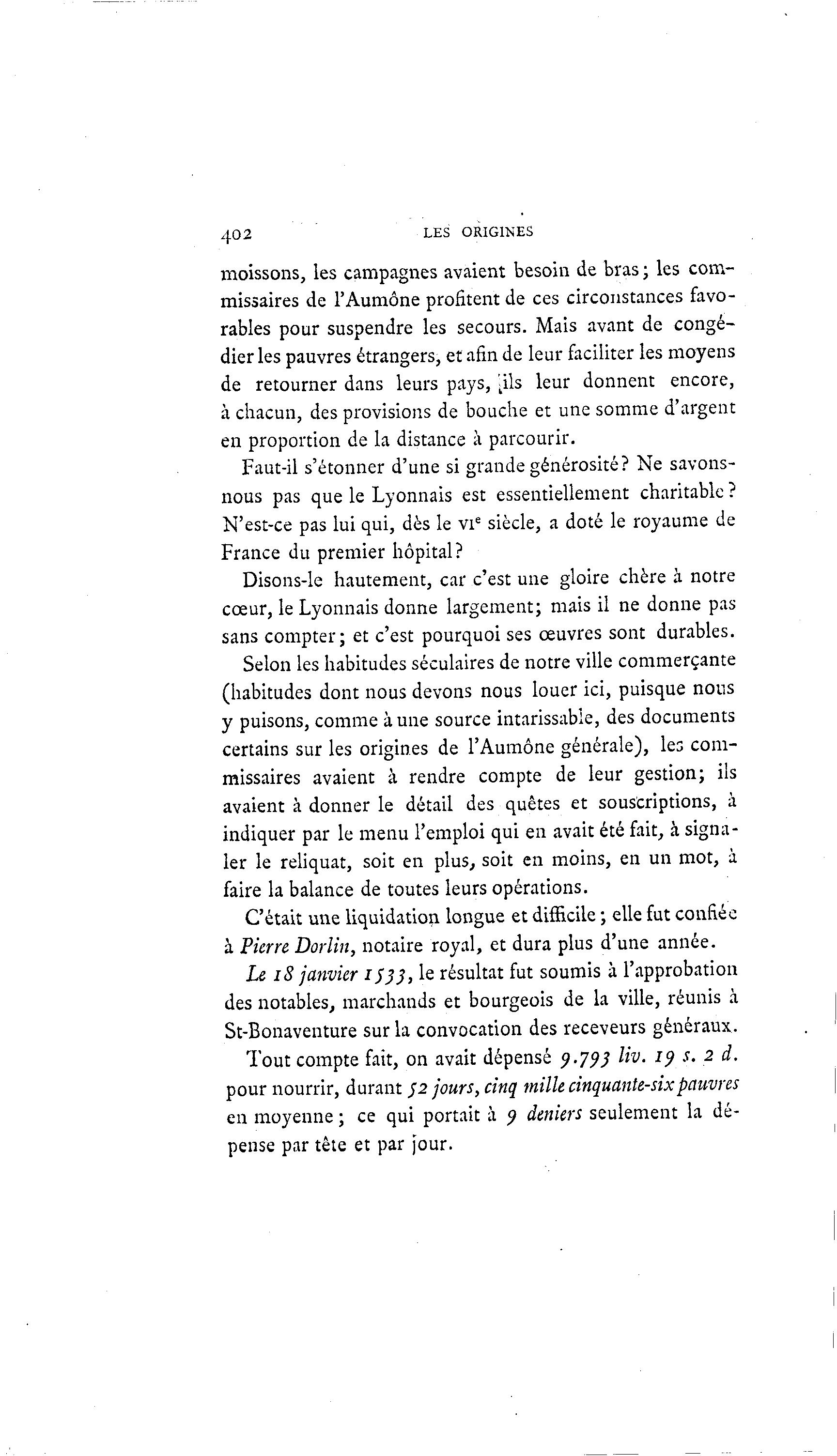 402 LES ORIGINES moissons, les campagnes avaient besoin de bras ; les com- missaires de l'Aumône profitent de ces circonstances favo- rables pour suspendre les secours. Mais avant de congé- dier les pauvres étrangers, et afin de leur faciliter les moyens de retourner dans leurs pays, kils leur donnent encore, à chacun, des provisions de bouche et une somme d'argent en proportion de la distance à parcourir. Faut-il s'étonner d'une si grande générosité? Ne savons- nous pas que le Lyonnais est essentiellement charitable ? N'est-ce pas lui qui, dès le vie siècle, a doté le royaume de France du premier hôpital? Disons-le hautement, car c'est une gloire chère à notre cœur, le Lyonnais donne largement; mais il ne donne pas sans compter; et c'est pourquoi ses œuvres sont durables. Selon les habitudes séculaires de notre ville commerçante (habitudes dont nous devons nous louer ici, puisque nous y puisons, comme aune source intarissable, des documents certains sur les origines de l'Aumône générale), les com- missaires avaient à rendre compte de leur gestion; ils avaient à donner le détail des quêtes et souscriptions, à indiquer par le menu l'emploi qui en avait été fait, à signa- ler le reliquat, soit en plus, soit en moins, en un mot, à faire la balance de toutes leurs opérations. C'était une liquidation longue et difficile ; elle fut confiée à Pierre Dorlin, notaire royal, et dura plus d'une année. Le iS janvier 1533, I e résultat fut soumis à l'approbation des notables, marchands et bourgeois de la ville, réunis à St-Bonaventure sur la convocation des receveurs généraux. Tout compte fait, on avait dépensé 9.793 liv. 19 s. 2 d. pour nourrir, durant /2 jours, cinq mille cinquante-six pauvres en moyenne ; ce qui portait à 9 deniers seulement la dé- pense par tête et par jour.