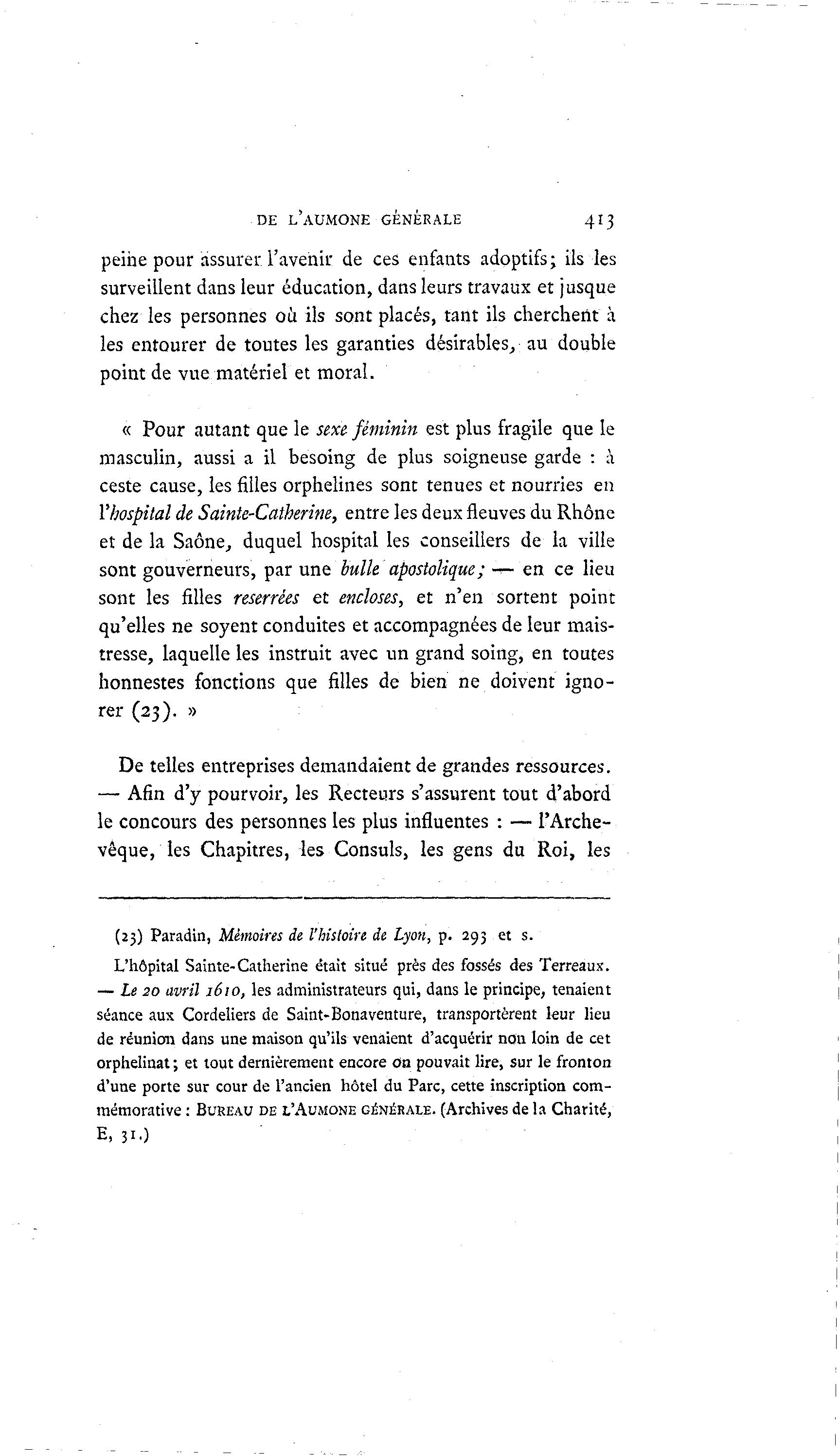 DE L'AUMONE GÉNÉRALE 413 peine pour assurer l'avenir de ces enfants adoptifs; ils les surveillent dans leur éducation, dans leurs travaux et jusque chez les personnes où ils sont placés, tant ils cherchent à les entourer de toutes les garanties désirables., au double point de vue matériel et moral. « Pour autant que le sexe féminin est plus fragile que le masculin, aussi a il besoing de plus soigneuse garde : à ceste cause, les filles orphelines sont tenues et nourries en Yhospital de Sainte-Catherine, entre les deux fleuves du Rhône et de la Saône, duquel hospital les conseillers de la ville sont gouverneurs, par une bulle apostolique; — en ce lieu sont les filles reserrées et encloses, et n'en sortent point qu'elles ne soyent conduites et accompagnées de leur mais- tresse, laquelle les instruit avec un grand soing, en toutes honnestes fonctions que filles de bien ne doivent igno- rer (23). » De telles entreprises demandaient de grandes ressources. — Afin d'y pourvoir, les Recteurs s'assurent tout d'abord le concours des personnes les plus influentes : — l'Arche- vêque, les Chapitres, les Consuls, les gens du Roi, les (23) Paradin, Mémoires de l'histoire de Lyon, p. 293 et s. L'hôpital Sainte-Catherine était situé près des fossés des Terreaux. — Le 20 avril 1610, les administrateurs qui, dans le principe, tenaient séance aux Cordeliers de Saint-Bonaventure, transportèrent kur lieu de réunion dans une maison qu'ils venaient d'acquérir non loin de cet orphelinat ; et tout dernièrement encore on pouvait lire, sur le fronton d'une porte sur cour de l'ancien hôtel du Parc, cette inscription com- mémorative : BUREAU DE L'AUMÔNE GÉNÉRALE. (Archives de la Charité, E, 31.)