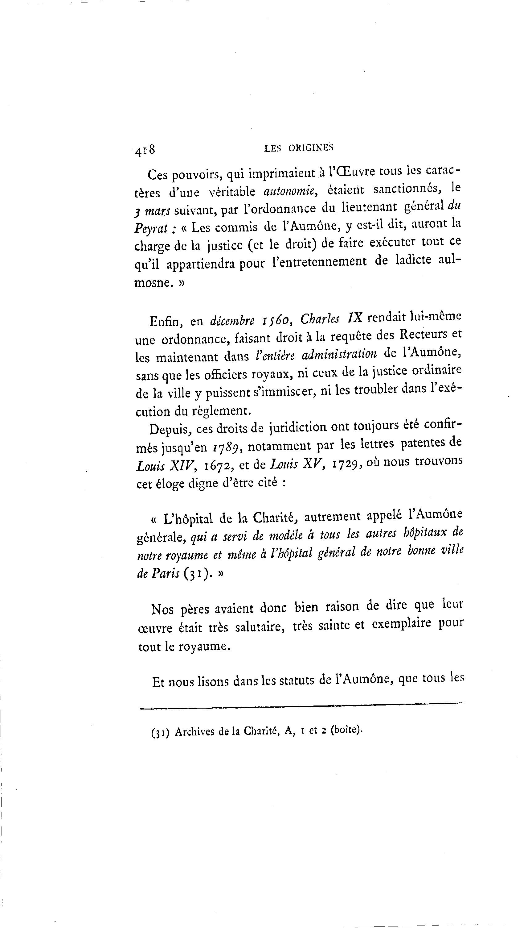 418 LES ORIGINES Ces pouvoirs, qui imprimaient à l'Œuvre tous les carac- tères d'une véritable autonomie, étaient sanctionnés, le 3 mars suivant, par l'ordonnance du lieutenant général du Peyrat : « Les commis de l'Aumône, y est-il dit, auront la charge de la justice (et le droit) de faire exécuter tout ce qu'il appartiendra pour l'entretennement de ladicte aul- mosne. » Enfin, en décembre 1560, Charles IX rendait lui-même une ordonnance, faisant droit à la requête des Recteurs et les maintenant dans l'entière administration de l'Aumône, sans que les officiers royaux, ni ceux de la justice ordinaire de la ville y puissent s'immiscer, ni les troubler dans l'exé- cution du règlement. Depuis, ces droits de juridiction ont toujours été confir- més jusqu'en 17S9, notamment par les lettres patentes de Louis XIV, 1672, et de Louis XV, 1729, où nous trouvons cet éloge digne d'être cité : « L'hôpital de la Charité, autrement appelé l'Aumône générale, qui a servi de modèle à tous les autres hôpitaux de notre royaume et même à l'hôpital général de notre bonne ville de Paris (31). » Nos pères avaient donc bien raison de dire que leur oeuvre était très salutaire, très sainte et exemplaire pour tout le royaume. Et nous lisons dans les statuts de l'Aumône, que tous les (31) Archives delà Chanté, A, 1 et 2 (boîte).