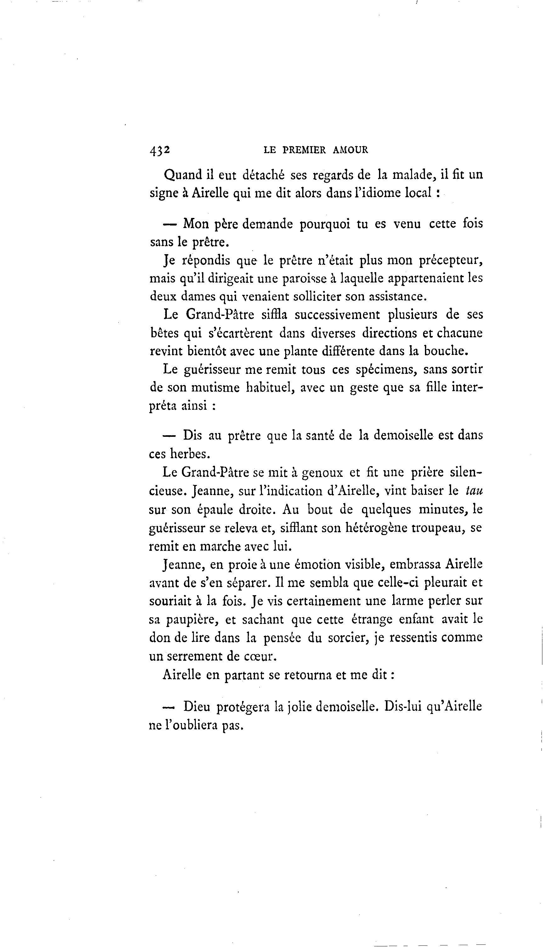 432 LE PREMIER AMOUR Quand il eut détaché ses regards de la malade, il fit un signe à Airelle qui me dit alors dans l'idiome local : — Mon père demande pourquoi tu es venu cette fois sans le prêtre. Je répondis que le prêtre n'était plus mon précepteur, mais qu'il dirigeait une paroisse à laquelle appartenaient les deux dames qui venaient solliciter son assistance. Le Grand-Pâtre siffla successivement plusieurs de ses bêtes qui s'écartèrent dans diverses directions et chacune revint bientôt avec une plante différente dans la bouche. Le guérisseur me remit tous ces spécimens, sans sortir de son mutisme habituel, avec un geste que sa fille inter- préta ainsi : — Dis au prêtre que la santé de la demoiselle est dans ces herbes. Le Grand-Pâtre se mit à genoux et fit une prière silen- cieuse. Jeanne, sur l'indication d'Airelle, vint baiser le tau sur son épaule droite. Au bout de quelques minutes, le guérisseur se releva et, sifflant son hétérogène troupeau, se remit en marche avec lui. Jeanne, en proie à une émotion visible, embrassa Airelle avant de s'en séparer. Il me sembla que celle-ci pleurait et souriait à la fois. Je vis certainement une larme perler sur sa paupière, et sachant que cette étrange enfant avait le don de lire dans la pensée du sorcier, je ressentis comme un serrement de cœur. Airelle en partant se retourna et me dit : — Dieu protégera la jolie demoiselle. Dis-lui qu'Airelle ne l'oubliera pas.