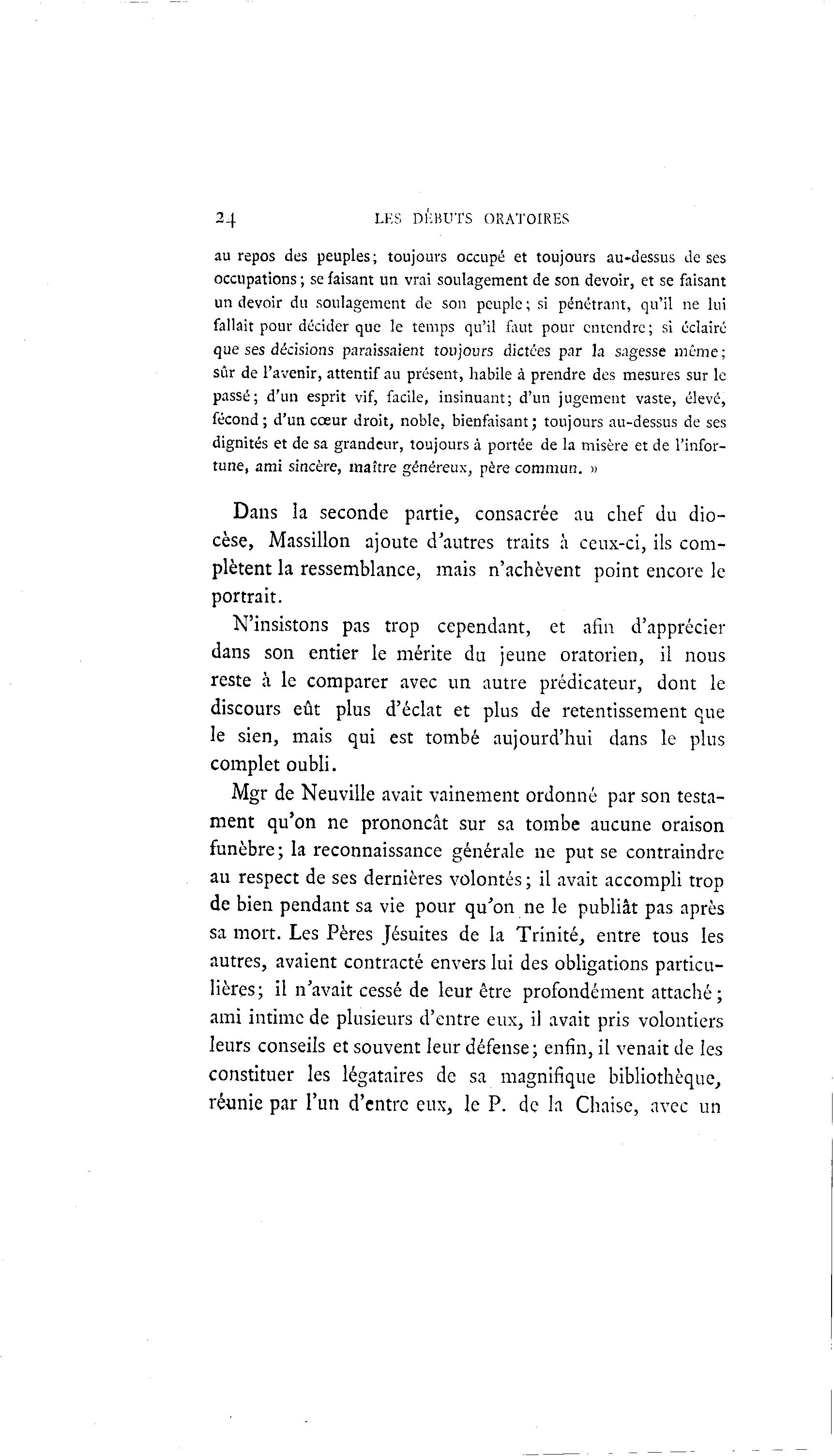 24 LKS DÉBUTS ORATOIRES au repos des peuples; toujours occupé et toujours au-dessus de ses occupations; se faisant un vrai soulagement de son devoir, et se faisant un devoir du soulagement de son peuple ; si pénétrant, qu'il ne lui fallait pour décider que le temps qu'il faut pour entendre; si éclairé que ses décisions paraissaient toujours dictées par la sagesse même; sûr de l'avenir, attentif au présent, habile à prendre des mesures sur le passé; d'un esprit vif, facile, insinuant; d'un jugement vaste, élevé, fécond ; d'un cœur droit, noble, bienfaisant; toujours au-dessus de ses dignités et de sa grandeur, toujours à portée de la misère et de l'infor- tune, ami sincère, maître généreux, père commun. » Dans la seconde partie, consacrée au chef du dio- cèse, Massillon ajoute d'autres traits à ceux-ci, ils com- plètent la ressemblance, mais n'achèvent point encore le portrait. N'insistons pas trop cependant, et afin d'apprécier dans son entier le mérite du jeune oratorien, il nous reste à le comparer avec un autre prédicateur, dont le discours eût plus d'éclat et plus de retentissement que le sien, mais qui est tombé aujourd'hui dans le plus complet oubli. Mgr de Neuville avait vainement ordonné par son testa- ment qu'on ne prononçât sur sa tombe aucune oraison funèbre; la reconnaissance générale ne put se contraindre au respect de ses dernières volontés ; il avait accompli trop de bien pendant sa vie pour qu'on ne le publiât pas après sa mort. Les Pères Jésuites de la Trinité, entre tous les autres, avaient contracté envers lui des obligations particu- lières; il n'avait cessé de leur être profondément attaché; ami intime de plusieurs d'entre eux, il avait pris volontiers leurs conseils et souvent leur défense; enfin, il venait de les constituer les légataires de sa magnifique bibliothèque, réunie par l'un d'entre eux, le P. de la Chaise, avec un
