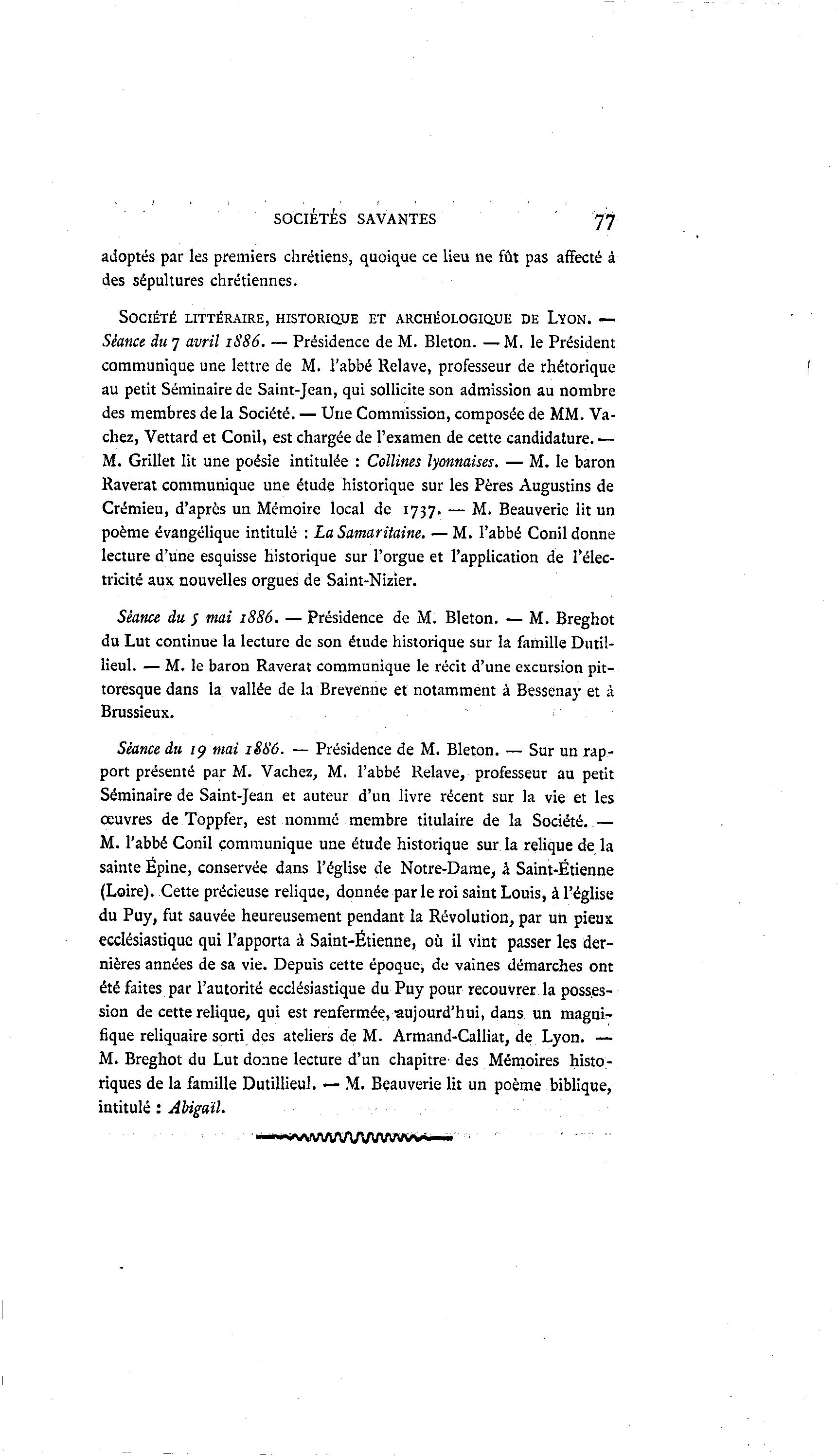 SOCIÉTÉS SAVANTES 77 adoptés par les premiers chrétiens, quoique ce lieu ne fût pas affecté à des sépultures chrétiennes. SOCIÉTÉ LITTÉRAIRE, HISTORIQUE ET ARCHÉOLOGIQUE DE LYON. — Séance du 7 avril 1S86. — Présidence de M. Bleton. — M. le Président communique une lettre de M. l'abbé Relave, professeur de rhétorique ! au petit Séminaire de Saint-Jean, qui sollicite son admission au nombre des membres de la Société. — Une Commission, composée de MM. Va- chez, Vettard et Conil, est chargée de l'examen de cette candidature. — M. Grillet lit une poésie intitulée : Collines lyonnaises. — M. le baron Raverat communique une étude historique sur les Pères Augustins de Crémieu, d'après un Mémoire local de 1737. — M. Beauverie lit un poème évangélique intitulé : La Samaritaine. — M. l'abbé Conil donne lecture d'une esquisse historique sur l'orgue et l'application de l'élec- tricité aux nouvelles orgues de Saint-Nizier. Séance du S mai 1886. — Présidence de M. Bleton. — M. Breghot du Lut continue la lecture de son étude historique sur la famille Dutil- lieul. — M. le baron Raverat communique le récit d'une excursion pit- toresque dans la vallée de la Brevenne et notamment à Bessenay et à Brussieux. Séance du 19 mai 1S86. — Présidence de M. Bleton. — Sur un rap- port présenté par M. Vachez, M. l'abbé Relave, professeur au petit Séminaire de Saint-Jean et auteur d'un livre récent sur la vie et les œuvres de Toppfer, est nommé membre titulaire de la Société. — M. l'abbé Conil communique une étude historique sur la relique de la sainte Épine, conservée dans l'église de Notre-Dame, à Saint-Ëtienne (Loire). Cette précieuse relique, donnée par le roi saint Louis, à l'église du Puy, fut sauvée heureusement pendant la Révolution, par un pieux ecclésiastique qui l'apporta à Saint-Étienne, où il vint passer les der- nières années de sa vie. Depuis cette époque, de vaines démarches ont été faites par l'autorité ecclésiastique du Puy pour recouvrer la posses- sion de cette relique, qui est renfermée, •aujourd'hui, dans un magni- fique reliquaire sorti des ateliers de M. Armand-Calliat, de Lyon. — M. Breghot du Lut donne lecture d'un chapitre des Mémoires histo- riques de la famille Dutillieul. — M. Beauverie lit un poème biblique, intitulé : Abigail.