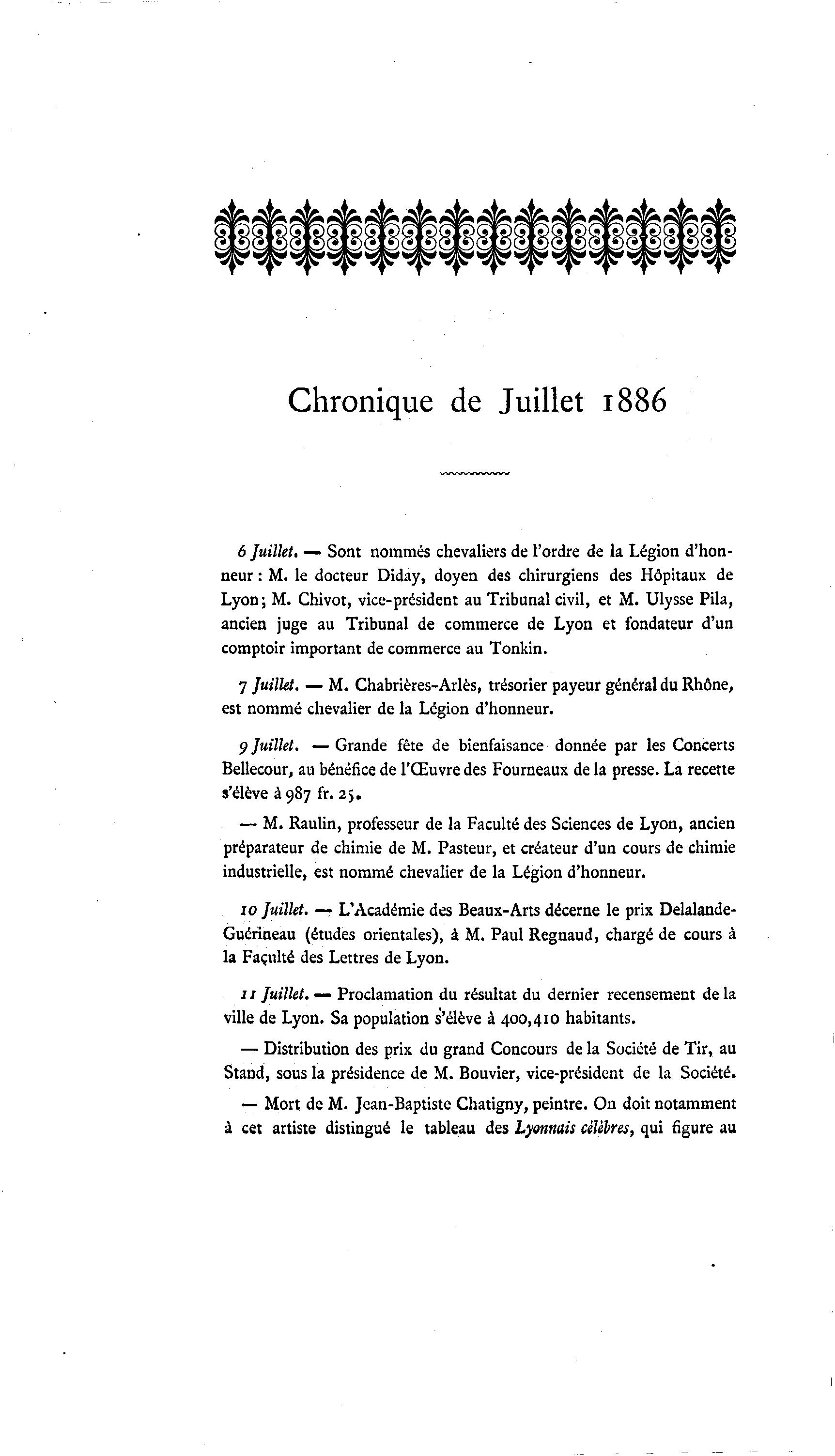 Chronique de Juillet 1886 6 Juillet. — Sont nommés chevaliers de l'ordre de la Légion d'hon- neur : M. le docteur Diday, doyen des chirurgiens des Hôpitaux de Lyon ; M. Chivot, vice-président au Tribunal civil, et M. Ulysse Pila, ancien juge au Tribunal de commerce de Lyon et fondateur d'un comptoir important de commerce au Tonkin. 7 Juillet. — M. Chabrières-Arles, trésorier payeur général du Rhône, est nommé chevalier de la Légion d'honneur. 9 Juillet. — Grande fête de bienfaisance donnée par les Concerts Bellecour, au bénéfice de l'Œuvre des Fourneaux de la presse. La recette s'élève à 987 fr. 25. — M. Raulin, professeur de la Faculté des Sciences de Lyon, ancien préparateur de chimie de M. Pasteur, et créateur d'un cours de chimie industrielle, est nommé chevalier de la Légion d'honneur. 10 Juillet. — L'Académie des Beaux-Arts décerne le prix Delalande- Guérineau (études orientales), à M. Paul Regnaud, chargé de cours à la Faculté des Lettres de Lyon. 11 Juillet. — Proclamation du résultat du dernier recensement de la ville de Lyon. Sa population s'élève à 400,410 habitants. — Distribution des prix du grand Concours de la Société de Tir, au Stand, sous la présidence de M. Bouvier, vice-président de la Société. — Mort de M. Jean-Baptiste Chatigny, peintre. On doit notamment à cet artiste distingué le tableau des Lyonnais célèbres, qui figure au