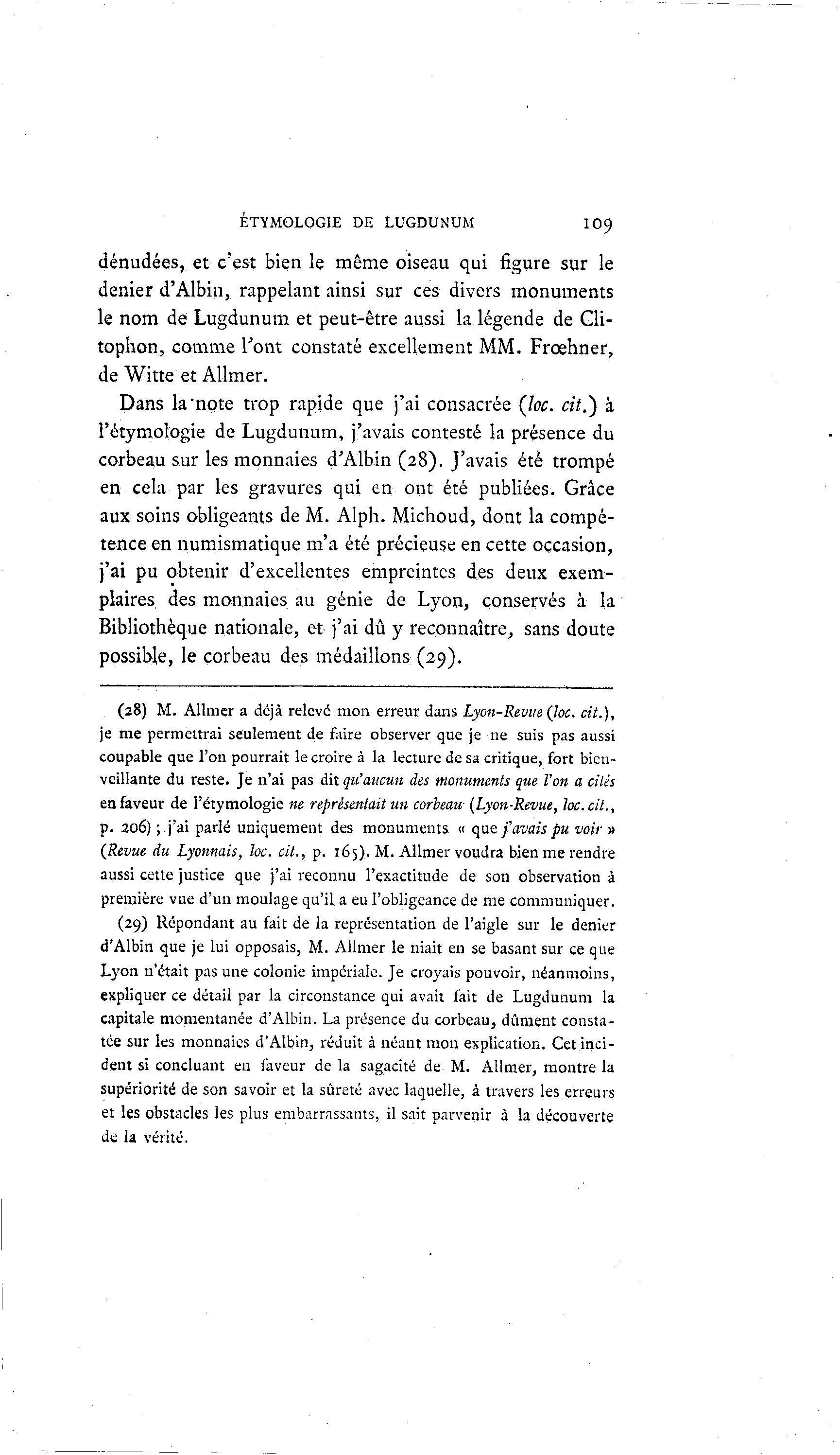 ETYMOLOGIE DE LUGDUNUM 109 dénudées, et c'est bien le même oiseau qui figure sur le denier d'Albin, rappelant ainsi sur ces divers monuments le nom de Lugdunum et peut-être aussi la légende de Cli- tophon, comme l'ont constaté excellement MM. Frcehner, de Witte et Allmer. Dans la "note trop rapide que j'ai consacrée (Joe. cit.) à l'étymologie de Lugdunum, j'avais contesté la présence du corbeau sur les monnaies d'Albin (28). J'avais été trompé en cela par les gravures qui en ont été publiées. Grâce aux soins obligeants de M. Alph. Michoud, dont la compé- tence en numismatique m'a été précieuse en cette occasion, j'ai pu obtenir d'excellentes empreintes des deux exem- plaires des monnaies au génie de Lyon, conservés à la Bibliothèque nationale, et j'ai dû y reconnaître, sans doute possible, le corbeau des médaillons (29). (28) M. Allmer a déjà relevé mon erreur dans Lyon-Revue (Joe. cit.), je me permettrai seulement de faire observer que je ne suis pas aussi coupable que l'on pourrait le croire à la lecture de sa critique, fort bien- veillante du reste. Je n'ai pas dit qu'aucun des monuments que l'on a cités en faveur de l'étymologie ne représentait un corbeau (Lyon-Revue, loc.cit,, p. 206) ; j'ai parlé uniquement des monuments « que j'avais pu voir » (Revue du Lyonnais, loc. cit., p. 165). M. Allmer voudra bien me rendre aussi cette justice que j'ai reconnu l'exactitude de son observation à première vue d'un moulage qu'il a eu l'obligeance de me communiquer. (29) Répondant au fait de la représentation de l'aigle sur le denier d'Albin que je lui opposais, M. Allmer le niait en se basant sur ce que Lyon n'était pas une colonie impériale. Je croyais pouvoir, néanmoins, expliquer ce détail par la circonstance qui avait fait de Lugdunum la capitale momentanée d'Albin. La présence du corbeau, dûment consta- tée sur les monnaies d'Albin, réduit à néant mon explication. Cet inci- dent si concluant en faveur de la sagacité de M. Allmer, montre la supériorité de son savoir et la sûreté avec laquelle, à travers les erreurs et les obstacles les plus embarrassants, il sait parvenir à la découverte de la vérité.