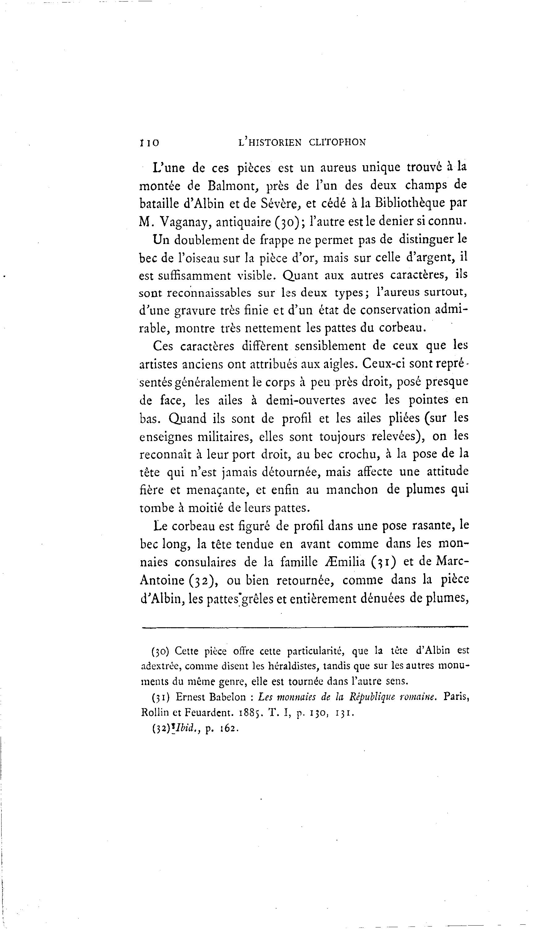 110 L'HISTORIEN CLITOPHON L'une de ces pièces est un aureus unique trouvé à la montée de Balmont, près de l'un des deux champs de bataille d'Albin et de Sévère, et cédé à la Bibliothèque par M. Vaganay, antiquaire (30); l'autre est le denier si connu. Un doublement de frappe ne permet pas de distinguer le bec de l'oiseau sur la pièce d'or, mais sur celle d'argent, il est suffisamment visible. Quant aux autres caractères, ils sont reconnaissables sur les deux types; l'aureus surtout, d'une gravure très finie et d'un état de conservation admi- rable, montre très nettement les pattes du corbeau. Ces caractères diffèrent sensiblement de ceux que les artistes anciens ont attribués aux aigles. Ceux-ci sont repré- sentés généralement le corps à peu près droit, posé presque de face, les ailes à demi-ouvertes avec les pointes en bas. Quand ils sont de profil et les ailes pliées (sur les enseignes militaires, elles sont toujours relevées), on les reconnaît à leur port droit, au bec crochu, à la pose de la tête qui n'est jamais détournée, mais affecte une attitude fière et menaçante, et enfin au manchon de plumes qui tombe à moitié de leurs pattes. Le corbeau est figuré de profil dans une pose rasante, le bec long, la tête tendue en avant comme dans les mon- naies consulaires de la famille ^Emilia (31) et de Marc- Antoine (32), ou bien retournée, comme dans la pièce d'Albin, les pattes'grêles et entièrement dénuées de plumes, (30) Cette pièce offre cette particularité, que la tête d'Albin est adextrée, comme disent les héraldistes, tandis que sur les autres monu- ments du même genre, elle est tournée dans l'autre sens. (31) Ernest Babelon : Les monnaies de la République romaine. Paris, Rollin et Feuardent. 1885. T. I, p. 130, 131. (]2)\lbid,} p. 162.