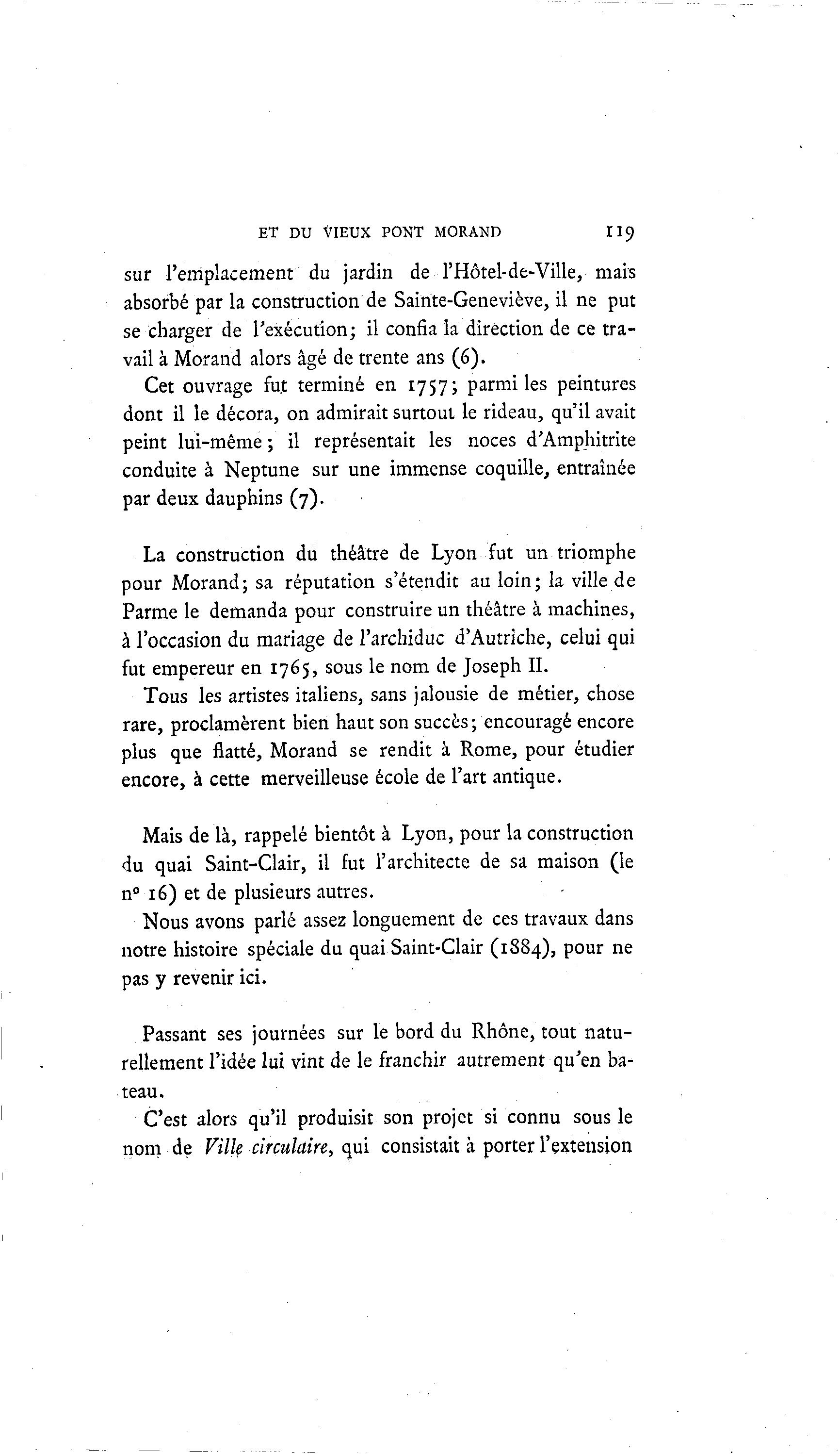 ET DU VIEUX PONT MORAND 119 sur l'emplacement du jardin de l'Hôtel-de-Ville, mais absorbé par la construction de Sainte-Geneviève, il ne put se charger de l'exécution; il confia la direction de ce tra- vail à Morand alors âgé de trente ans (6). Cet ouvrage fut terminé en 1757; parmi les peintures dont il le décora, on admirait surtout le rideau, qu'il avait peint lui-même ; il représentait les noces d'Amphitrite conduite à Neptune sur une immense coquille, entraînée par deux dauphins (7). La construction du théâtre de Lyon fut un triomphe pour Morand; sa réputation s'étendit au loin; la ville de Parme le demanda pour construire un théâtre à machines, à l'occasion du mariage de l'archiduc d'Autriche, celui qui fut empereur en 1765, sous le nom de Joseph IL Tous les artistes italiens, sans jalousie de métier, chose rare, proclamèrent bien haut son succès; encouragé encore plus que flatté, Morand se rendit à Rome, pour étudier encore, à cette merveilleuse école de l'art antique. Mais de là , rappelé bientôt à Lyon, pour la construction du quai Saint-Clair, il fut l'architecte de sa maison (le n° 16) et de plusieurs autres. Nous avons parlé assez longuement de ces travaux dans notre histoire spéciale du quai Saint-Clair (1S84), pour ne pas y revenir ici. Passant ses journées sur le bord du Rhône, tout natu- rellement l'idée lui vint de le franchir autrement qu'en ba- teau. C'est alors qu'il produisit son projet si connu sous le nom de Ville circulaire, qui consistait à porter l'extension