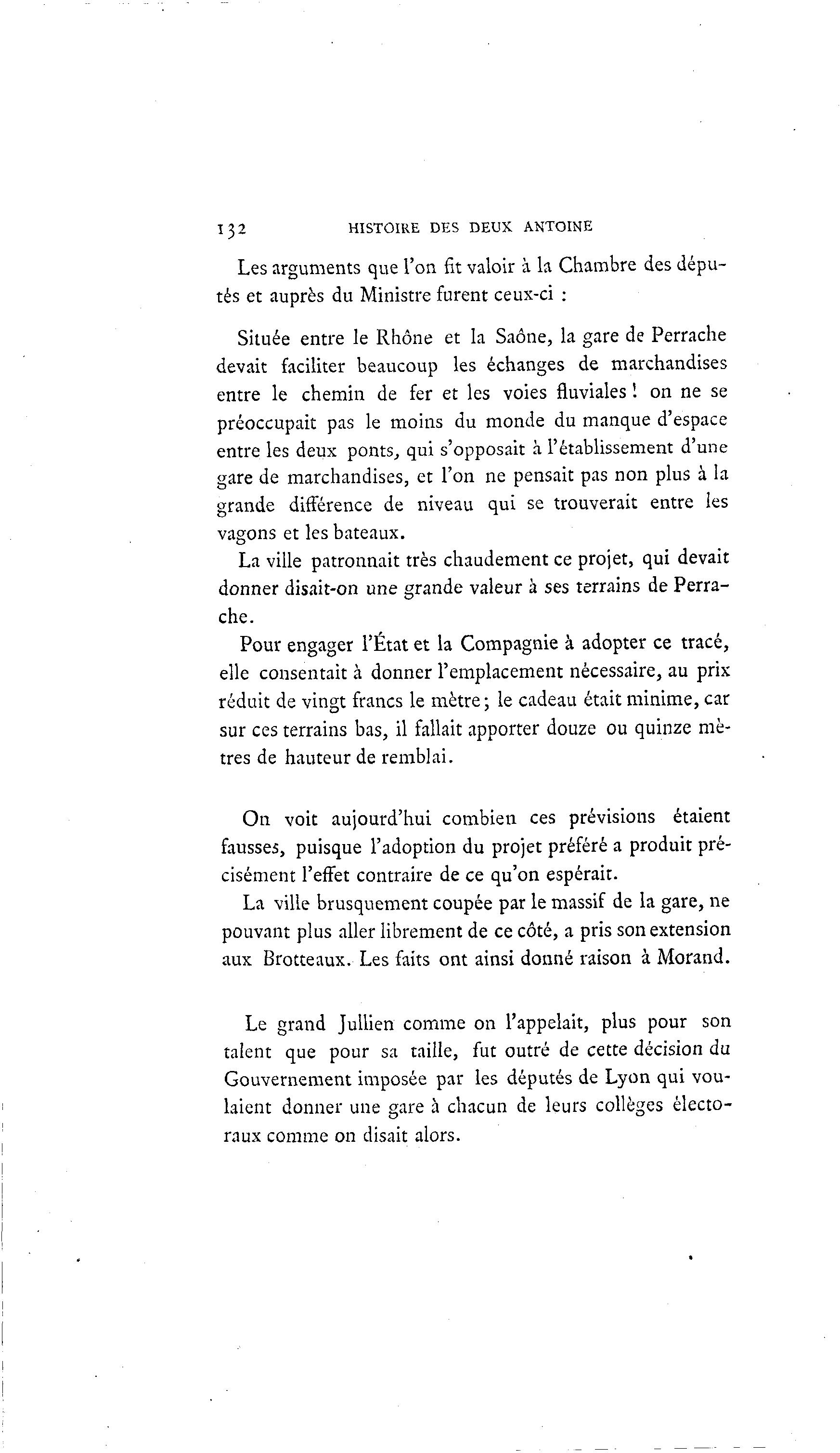 132 HISTOIRE DES DEUX ANTOINE Les arguments que l'on fit valoir à la Chambre des dépu- tés et auprès du Ministre furent ceux-ci : Située entre le Rhône et la Saône, la gare de Perrache devait faciliter beaucoup les échanges de marchandises entre le chemin de fer et les voies fluviales ! on ne se préoccupait pas le moins du monde du manque d'espace entre les deux ponts, qui s'opposait à l'établissement d'une gare de marchandises, et l'on ne pensait pas non plus à la grande différence de niveau qui se trouverait entre les vagons et les bateaux. La ville patronnait très chaudement ce projet, qui devait donner disait-on une grande valeur à ses terrains de Perra- che. Pour engager l'État et la Compagnie à adopter ce tracé, elle consentait à donner l'emplacement nécessaire, au prix réduit de vingt francs le mètre ; le cadeau était minime, car sur ces terrains bas, il fallait apporter douze ou quinze mè- tres de hauteur de remblai. On voit aujourd'hui combien ces prévisions étaient fausses, puisque l'adoption du projet préféré a produit pré- cisément l'effet contraire de ce qu'on espérait. La ville brusquement coupée par le massif de la gare, ne pouvant plus aller librement de ce côté, a pris son extension aux Brotteaux. Les faits ont ainsi donné raison à Morand. Le grand Jullien comme on l'appelait, plus pour son talent que pour sa taille, fut outré de cette décision du Gouvernement imposée par les députés de Lyon qui vou- laient donner une gare à chacun de leurs collèges électo- raux comme on disait alors.