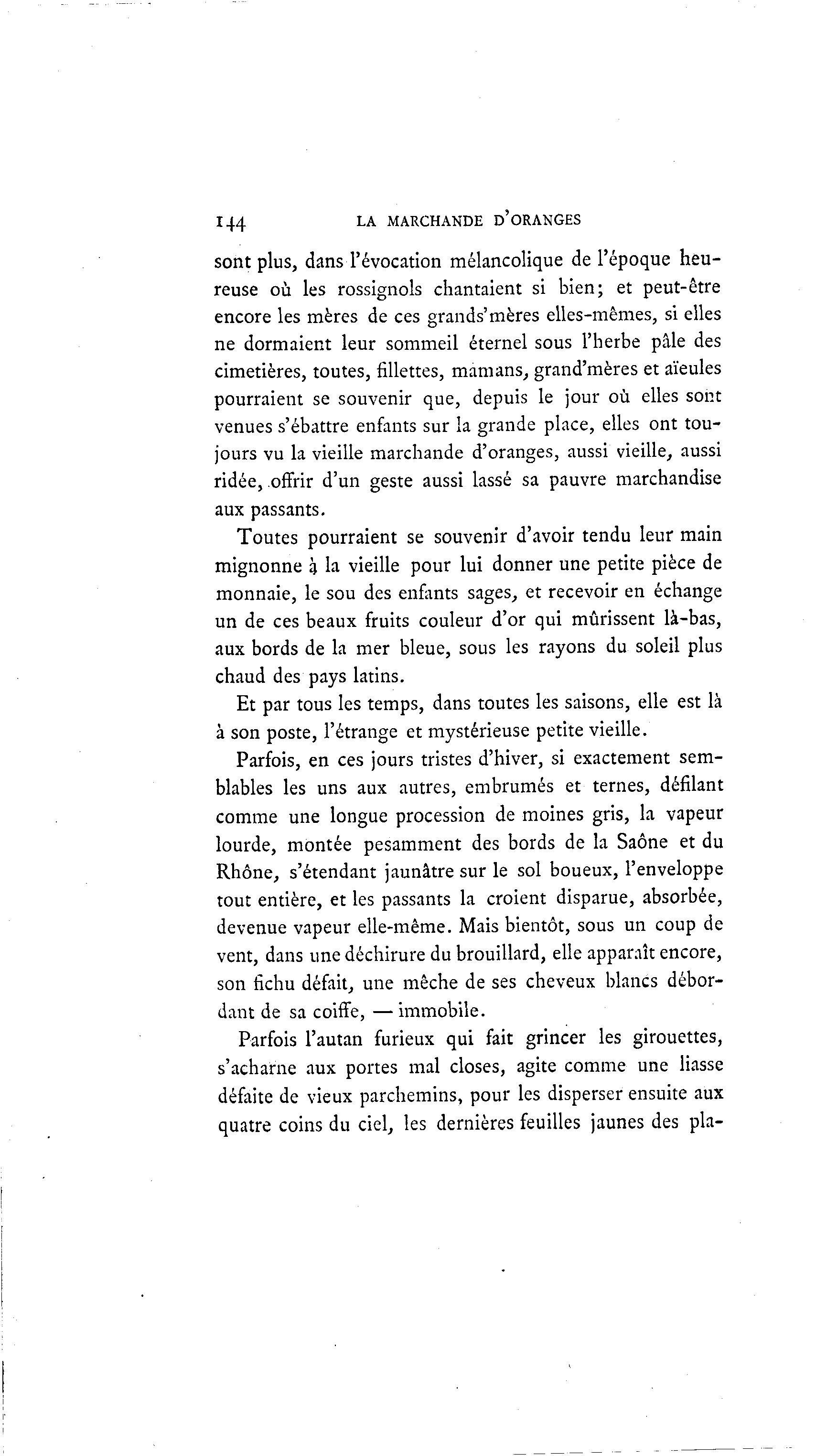 LA 144 MARCHANDE D'ORANGES sont plus, dans l'évocation mélancolique de l'époque heu- reuse où les rossignols chantaient si bien; et peut-être encore les mères de ces grands'mères elles-mêmes, si elles ne dormaient leur sommeil éternel sous l'herbe pâle des cimetières, toutes, fillettes, mamans, grand'mères et aïeules pourraient se souvenir que, depuis le jour où elles sont venues s'ébattre enfants sur la grande place, elles ont tou- jours vu la vieille marchande d'oranges, aussi vieille, aussi ridée, offrir d'un geste aussi lassé sa pauvre marchandise aux passants. Toutes pourraient se souvenir d'avoir tendu leur main mignonne à la vieille pour lui donner une petite pièce de monnaie, le sou des enfants sages, et recevoir en échange un de ces beaux fruits couleur d'or qui mûrissent là -bas, aux bords de la mer bleue, sous les rayons du soleil plus chaud des pays latins. Et par tous les temps, dans toutes les saisons, elle est là à son poste, l'étrange et mystérieuse petite vieille. Parfois, en ces jours tristes d'hiver, si exactement sem- blables les uns aux autres, embrumés et ternes, défilant comme une longue procession de moines gris, la vapeur lourde, montée pesamment des bords de la Saône et du Rhône, s'étendant jaunâtre sur le sol boueux, l'enveloppe tout entière, et les passants la croient disparue, absorbée, devenue vapeur elle-même. Mais bientôt, sous un coup de vent, dans une déchirure du brouillard, elle apparaît encore, son fichu défait, une mèche de ses cheveux blancs débor- dant de sa coiffe, — immobile. Parfois l'autan furieux qui fait grincer les girouettes, s'acharne aux portes mal closes, agite comme une liasse défaite de vieux parchemins, pour les disperser ensuite aux quatre coins du ciel, les dernières feuilles jaunes des pla-