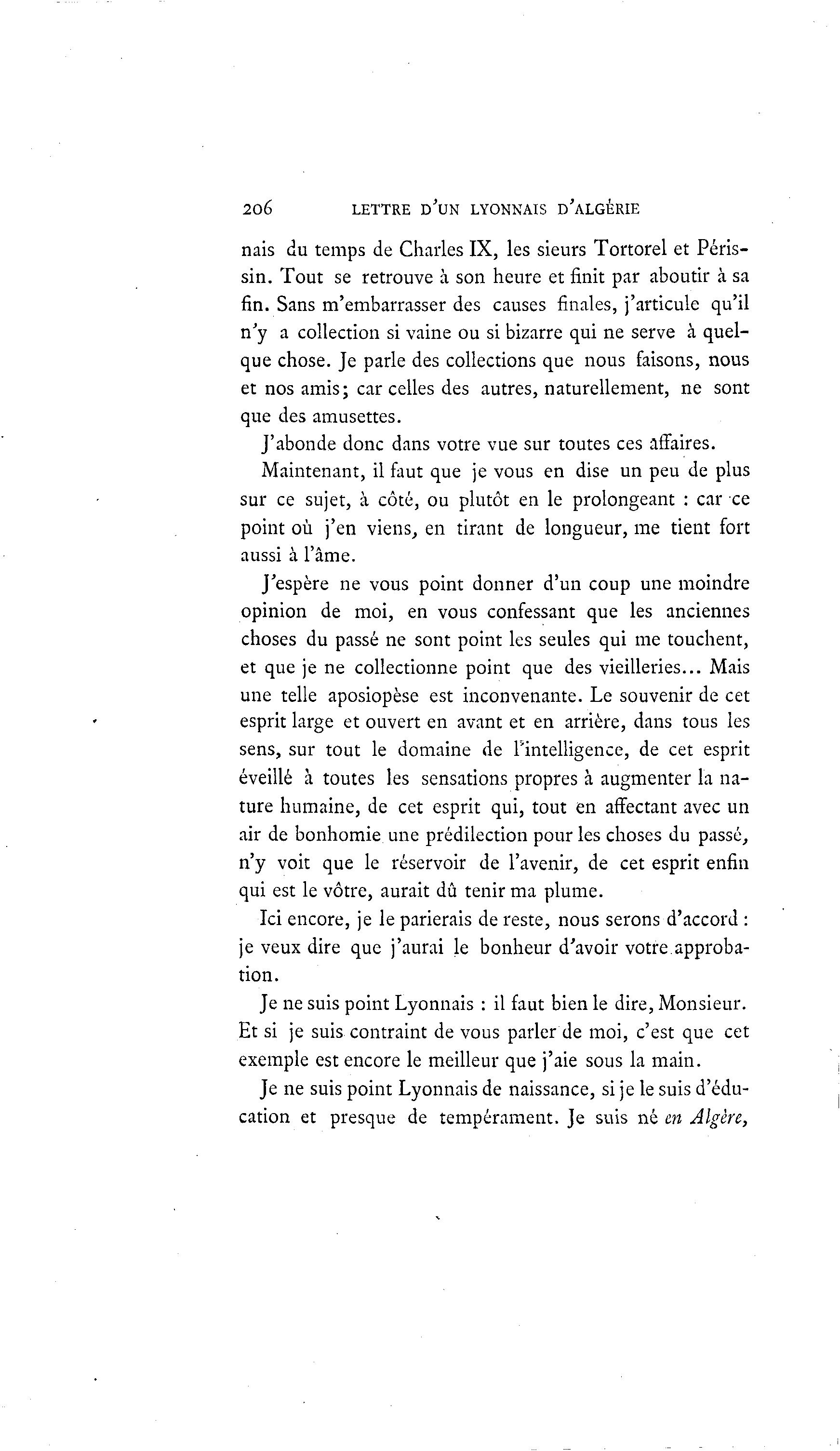 206 LETTRE D'UN LYONNAIS D'ALGÉRIE nais du temps de Charles IX, les sieurs Tortorel et Péris- sin. Tout se retrouve à son heure et finit par aboutir à sa fin. Sans m'embarrasser des causes finales, j'articule qu'il n'y a collection si vaine ou si bizarre qui ne serve à quel- que chose. Je parle des collections que nous faisons, nous et nos amis; car celles des autres, naturellement, ne sont que des amusettes. J'abonde donc dans votre vue sur toutes ces affaires. Maintenant, il faut que je vous en dise un peu de plus sur ce sujet, à côté, ou plutôt en le prolongeant : car ce point où j'en viens, en tirant de longueur, me tient fort aussi à l'âme. J'espère ne vous point donner d'un coup une moindre opinion de moi, en vous confessant que les anciennes choses du passé ne sont point les seules qui me touchent, et que je ne collectionne point que des vieilleries... Mais une telle aposiopèse est inconvenante. Le souvenir de cet esprit large et ouvert en avant et en arrière, dans tous les sens, sur tout le domaine de l'intelligence, de cet esprit éveillé à toutes les sensations propres à augmenter la na- ture humaine, de cet esprit qui, tout en affectant avec un air de bonhomie une prédilection pour les choses du passé, n'y voit que le réservoir de l'avenir, de cet esprit enfin qui est le vôtre, aurait dû tenir ma plume. Ici encore, je le parierais de reste, nous serons d'accord : je veux dire que j'aurai le bonheur d'avoir votre approba- tion. Je ne suis point Lyonnais : il faut bien le dire, Monsieur. Et si je suis contraint de vous parler de moi, c'est que cet exemple est encore le meilleur que j'aie sous la main. Je ne suis point Lyonnais de naissance, si je le suis d'édu- cation et presque de tempérament. Je suis né en Algère,