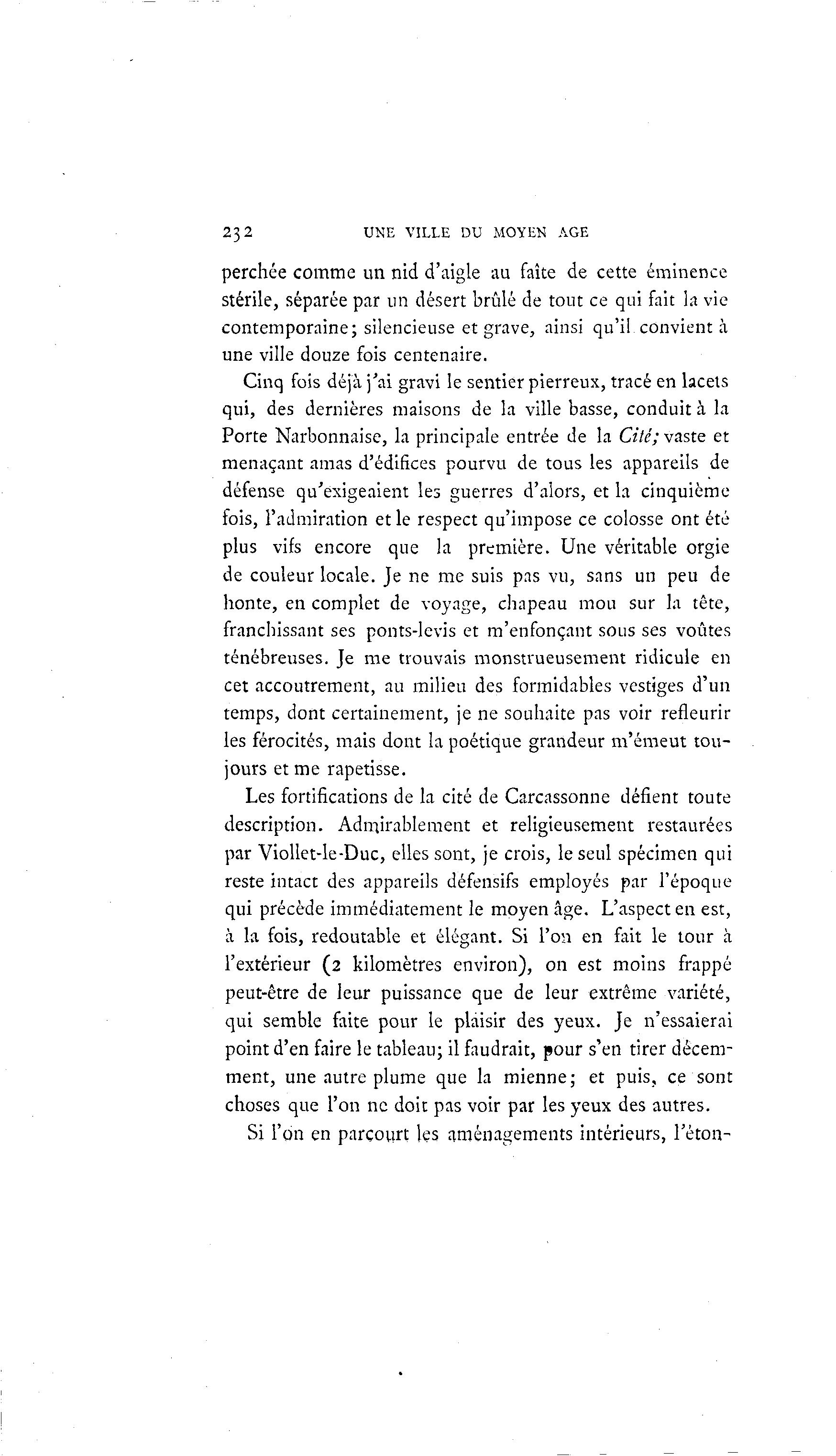 232 UNE VILLE DU MOYEN AGE perchée comme un nid d'aigle au faîte de cette éminence stérile, séparée par un désert brûlé de tout ce qui fait la vie contemporaine; silencieuse et grave, ainsi qu'il convient à une ville douze fois centenaire. Cinq fois déjà j'ai gravi le sentier pierreux, tracé en lacets qui, des dernières maisons de la ville basse, conduit à la Porte Narbonnaise, la principale entrée de la Cité; vaste et menaçant amas d'édifices pourvu de tous les appareils de défense qu'exigeaient les guerres d'alors, et la cinquième fois, l'admiration et le respect qu'impose ce colosse ont été plus vifs encore que la première. Une véritable orgie de couleur locale. Je ne me suis pas vu, sans un peu de honte, en complet de voyage, chapeau mou sur la tête, franchissant ses ponts-levis et m'enfonçant sous ses voûtes ténébreuses. Je me trouvais monstrueusement ridicule en cet accoutrement, au milieu des formidables vestiges d'un temps, dont certainement, je ne souhaite pas voir refleurir les férocités, mais dont la poétique grandeur m'émeut tou- jours et me rapetisse. Les fortifications de la cité de Carcassonne défient toute description. Admirablement et religieusement restaurées par Viollet-le-Duc, elles sont, je crois, le seul spécimen qui reste intact des appareils défensifs employés par l'époque qui précède immédiatement le moyen âge. L'aspect en est, à la fois, redoutable et élégant. Si l'on en fait le tour à l'extérieur (2 kilomètres environ), on est moins frappé peut-être de leur puissance que de leur extrême variété, qui semble faite pour le plaisir des yeux. Je n'essaierai point d'en faire le tableau; il faudrait, pour s'en tirer décem- ment, une autre plume que la mienne; et puis, ce sont choses que l'on ne doit pas voir par les yeux des autres. Si l'on en parcourt les aménagements intérieurs, Téton-