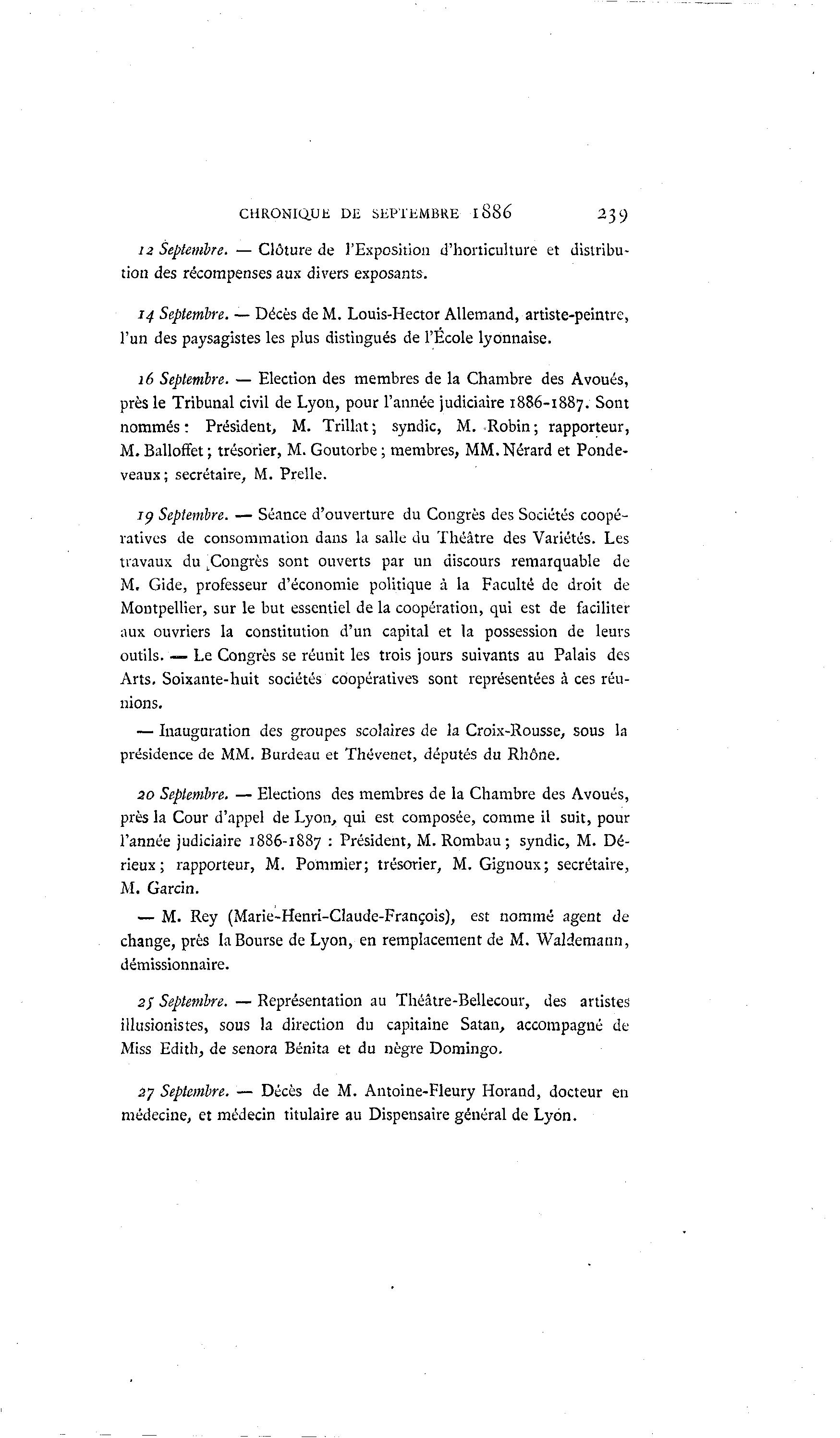 CHRONIQ.UK DE SEPTEMBRE I886 239 12 Septembre. — Clôture de l'Exposition d'horticulture et distribu- tion des récompenses aux divers exposants. 14 Septembre. — Décès de M. Louis-Hector Allemand, artiste-peintre, l'un des paysagistes les plus distingués de l'Ecole lyonnaise. 16 Septembre. — Election des membres de la Chambre des Avoués, près le Tribunal civil de Lyon, pour l'année judiciaire 1886-1887. Sont nommés : Président, M. Trillat ; syndic, M. Robin ; rapporteur, M. Balloffet ; trésorier, M. Goutorbe ; membres, MM.Nérard et Ponde- veaux; secrétaire, M. Prelle. 19 Septembre. — Séance d'ouverture du Congrès des Sociétés coopé- ratives de consommation dans la salle du Théâtre des Variétés. Les travaux du t Congrès sont ouverts par un discours remarquable de M. Gide, professeur d'économie politique à la Faculté de droit de Montpellier, sur le but essentiel de la coopération, qui est de faciliter aux ouvriers la constitution d'un capital et la possession de leurs outils. — Le Congrès se réunit les trois jours suivants au Palais des Arts. Soixante-huit sociétés coopératives sont représentées à ces réu- nions. — Inauguration des groupes scolaires de la Croix-Rousse, sous la présidence de MM. Burdeau et Thévenet, députés du Rhône. 20 Septembre. — Elections des membres de la Chambre des Avoués, près la Cour d'appel de Lyon, qui est composée, comme il suit, pour l'année judiciaire 1886-1887 : Président, M. Rombau ; syndic, M. Dé- rieux ; rapporteur, M. Pommier; trésorier, M. Gignoux; secrétaire, M. Garcin. — M. Rey (Marie-Henri-Claude-François), est nommé agent de change, près la Bourse de Lyon, en remplacement de M. Waldemann, démissionnaire. 2/ Septembre. — Représentation au Théâtre-Bellecour, des artistes illusionistes, sous la direction du capitaine Satan, accompagné de Miss Edith, de senora Bénita et du nègre Domingo. 37 Septembre. — Décès de M. Antoine-Fleury Horand, docteur en médecine, et médecin titulaire au Dispensaire général de Lyon.