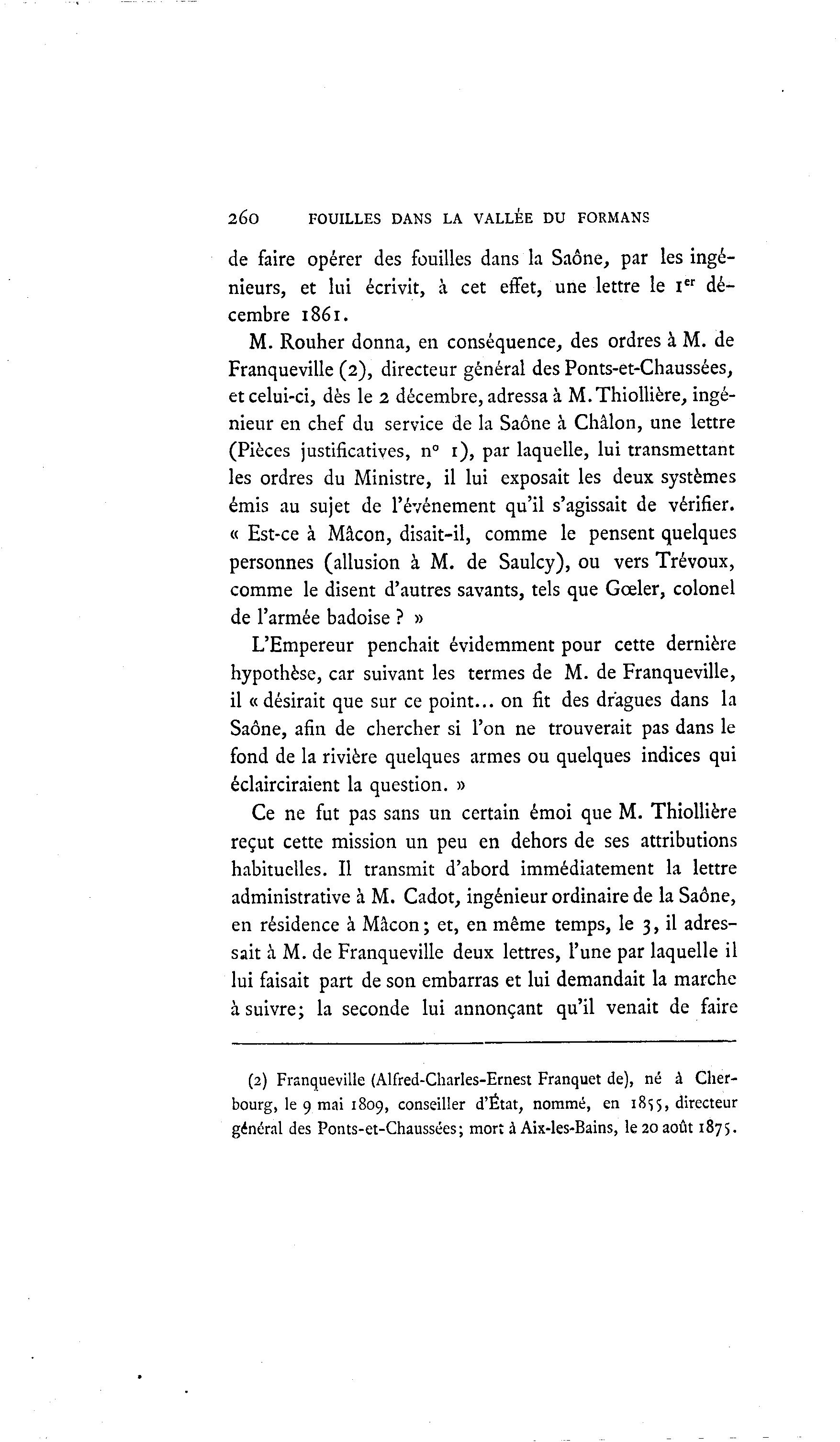 260 FOUILLES DANS LA VALLEE DU FORMANS de faire opérer des fouilles dans la Saône, par les ingé- nieurs, et lui écrivit, à cet effet, une lettre le I" dé- cembre 1861. M. Rouher donna, en conséquence, des ordres à M. de Franqueville (2), directeur général des Ponts-et-Chaussées, et celui-ci, dès le 2 décembre, adressa à M.Thiollière, ingé- nieur en chef du service de la Saône à Châlon, une lettre (Pièces justificatives, n° 1), par laquelle, lui transmettant les ordres du Ministre, il lui exposait les deux systèmes émis au sujet de l'événement qu'il s'agissait de vérifier. « Est-ce à Mâcon, disait-il, comme le pensent quelques personnes (allusion à M. de Saulcy), ou vers Trévoux, comme le disent d'autres savants, tels que Gceler, colonel de l'armée badoise ? » L'Empereur penchait évidemment pour cette dernière hypothèse, car suivant les termes de M. de Franqueville, il «désirait que sur ce point... on fit des dragues dans la Saône, afin de chercher si l'on ne trouverait pas dans le fond de la rivière quelques armes ou quelques indices qui éclairciraient la question. » Ce ne fut pas sans un certain émoi que M. Thiollière reçut cette mission un peu en dehors de ses attributions habituelles. Il transmit d'abord immédiatement la lettre administrative à M. Cadot, ingénieur ordinaire de la Saône, en résidence à Mâcon ; et, en même temps, le 3, il adres- sait à M. de Franqueville deux lettres, l'une par laquelle il lui faisait part de son embarras et lui demandait la marche à suivre; la seconde lui annonçant qu'il venait de faire (2) Franqueville (Alfred-Charles-Ernest Franquet de), né à Cher- bourg, le 9 mai 1809, conseiller d'État, nommé, en i S ^ , directeur général des Ponts-et-Chaussées; mort à Aix-les-Bains, le 20 août 1875.