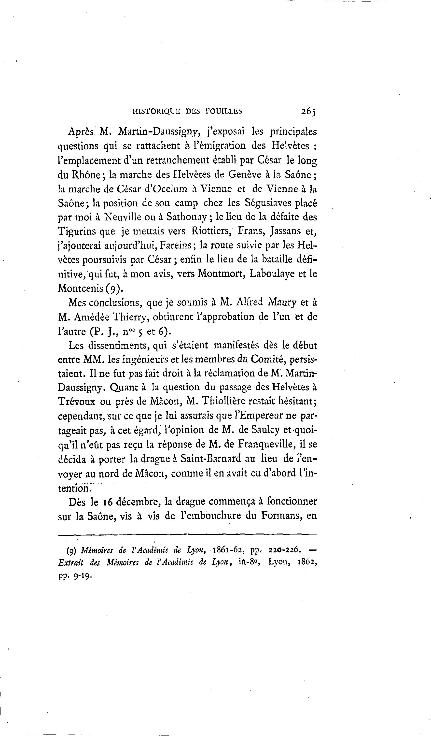 HISTORIQUE DES FOUILLES 265 Après M. Martin-Daussigny, j'exposai les principales questions qui se rattachent à l'émigration des Helvètes : l'emplacement d'un retranchement établi par César le long dit Rhône ; la marche des Helvètes de Genève à la Saône ; la marche de César d'Ocelum à Vienne et de Vienne à la Saône; la position de son camp chez les Ségusiaves placé par moi à Neuville ou à Sathonay ; le lieu de la défaite des Tigurins que je mettais vers Riottiers, Frans, Jassans et, j'ajouterai aujourd'hui, Fareins ; la route suivie par les Hel- vètes poursuivis par César ; enfin le lieu de la bataille défi- nitive, qui fut, à mon avis, vers Montmort, Laboulaye et le Montcenis (9). Mes conclusions, que je soumis à M. Alfred Maury et à M. Amédée Thierry, obtinrent l'approbation de l'un et de l'autre (P. J., nos 5 et 6). Les dissentiments, qui s'étaient manifestés dès le début entre MM. les ingénieurs et les membres du Comité, persis- taient. Il ne fut pas fait droit à la réclamation de M. Martin- Daussigny. Quant à la question du passage des Helvètes à Trévoux ou près de Mâcon, M. Thiollière restait hésitant ; cependant, sur ce que je lui assurais que l'Empereur ne par- tageait pas, à cet égard," l'opinion de M. de Saulcy et quoi- qu'il n'eût pas reçu la réponse de M. de Franqueville, il se décida à porter la drague à Saint-Barnard au lieu de l'en- voyer au nord de Mâcon, comme il en avait eu d'abord l'in- tention. Dès le 16 décembre, la drague commença à fonctionner sur la Saône, vis à vis de l'embouchure du Formans, en (9) Mémoires de l'Académie de Lyon, 1861-62, pp. 220-226. — Extrait des Mémoires de l'Académie de Lyon, in-8°, Lyon, 1862, pp. 9-19.