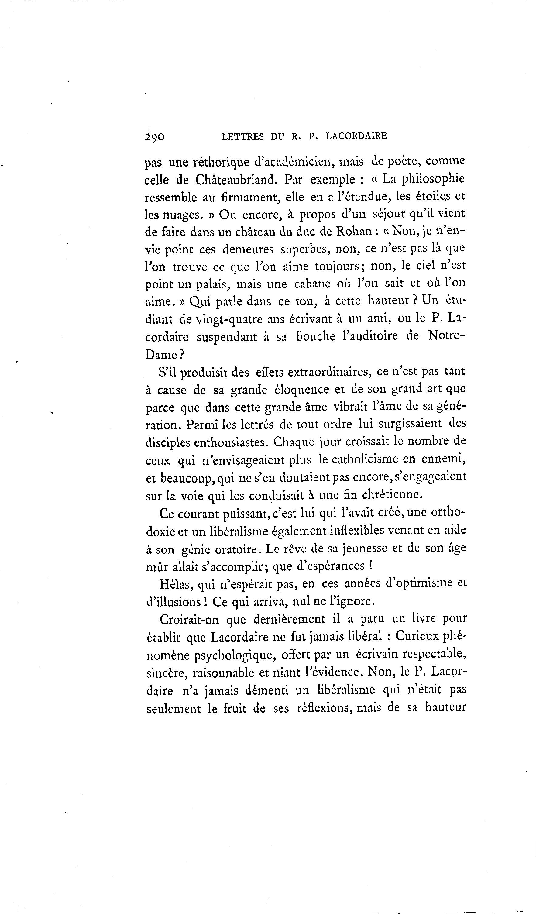 29O LETTRES DU R. P. LACORDAIRE pas une réthorique d'académicien, mais de poète, comme celle de Chateaubriand. Par exemple : « La philosophie ressemble au firmament, elle en a l'étendue, les étoiles et les nuages. » Ou encore, à propos d'un séjour qu'il vient de faire dans un château du duc de Rohan : « Non, je n'en- vie point ces demeures superbes, non, ce n'est pas là que Ton trouve ce que Ton aime toujours; non, le ciel n'est point un palais, mais une cabane où Ton sait et où l'on aime. » Qui parle dans ce ton, à cette hauteur ? Un étu- diant de vingt-quatre ans écrivant à un ami, ou le P. La- cordaire suspendant à sa bouche l'auditoire de Notre- Dame? S'il produisit des effets extraordinaires, ce n'est pas tant à cause de sa grande éloquence et de son grand art que parce que dans cette grande âme vibrait l'âme de sa géné- ration. Parmi les lettrés de tout ordre lui surgissaient des disciples enthousiastes. Chaque jour croissait le nombre de ceux qui n'envisageaient plus le catholicisme en ennemi, et beaucoup, qui ne s'en doutaient pas encore, s'engageaient sur la voie qui les conduisait à une fin chrétienne. Ce courant puissant, c'est lui qui l'avait créé, une ortho- doxie et un libéralisme également inflexibles venant en aide à son génie oratoire. Le rêve de sa jeunesse et de son âge mûr allait s'accomplir ; que d'espérances ! Hélas, qui n'espérait pas, en ces années d'optimisme et d'illusions ! Ce qui arriva, nul ne l'ignore. Croirait-on que dernièrement il a paru un livre pour établir que Lacordaire ne fut jamais libéral : Curieux phé- nomène psychologique, offert par un écrivain respectable, sincère, raisonnable et niant l'évidence. Non, le P. Lacor- daire n'a jamais démenti un libéralisme qui n'était pas seulement le fruit de ses réflexions, mais de sa hauteur