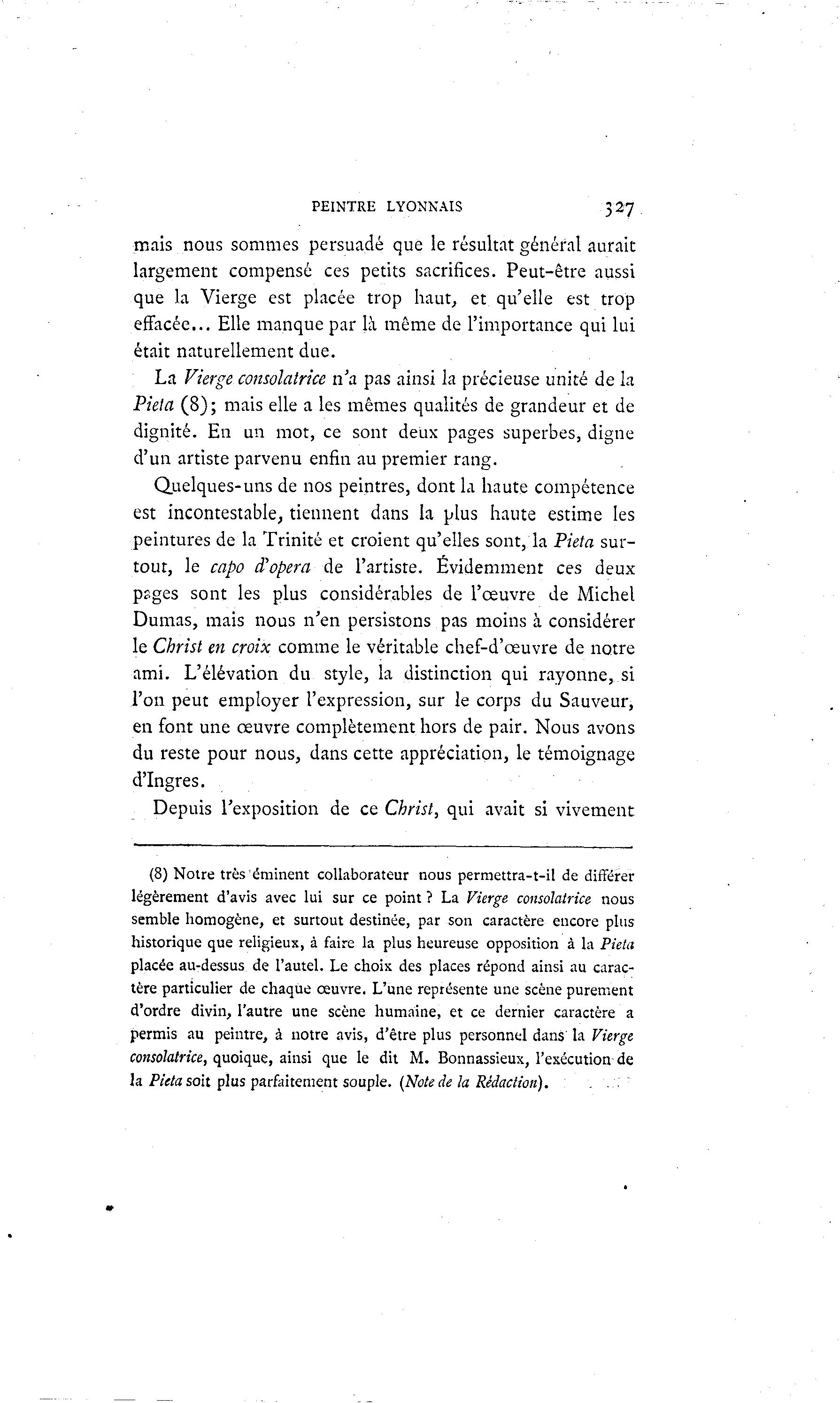 PEINTRE LYONNAIS 327 mais nous sommes persuadé que le résultat général aurait largement compensé ces petits sacrifices. Peut-être aussi que la Vierge est placée trop haut., et qu'elle est trop effacée... Elle manque par là même de l'importance qui lui était naturellement due. La Vierge consolatrice n'a pas ainsi la précieuse unité de la Pieta ( 8 ) ; mais elle a les mêmes qualités de grandeur et de dignité. En un mot, ce sont deux pages superbes, digne d'un artiste parvenu enfin au premier rang. Quelques-uns de nos peintres, dont la haute compétence est incontestable, tiennent dans la plus haute estime les peintures de la Trinité et croient qu'elles sont, la Pieta sur- tout, le capo iïopera de l'artiste. Évidemment ces deux pages sont les plus considérables de l'œuvre de Michel Dumas, mais nous n'en persistons pas moins à considérer le Christ en croix comme le véritable chef-d'œuvre de notre ami. L'élévation du style, la distinction qui rayonne, si l'on peut employer l'expression, sur le corps du Sauveur, en font une œuvre complètement hors de pair. Nous avons du reste pour nous, dans cette appréciation, le témoignage d'Ingres. Depuis l'exposition de ce Christ, qui avait si vivement (8) Notre très'éminent collaborateur nous permettra-t-il de différer légèrement d'avis avec lui sur ce point ? La Vierge consolatrice nous semble homogène, et surtout destinée, par son caractère encore plus historique que religieux, à faire la plus heureuse opposition à la Pieta placée au-dessus de l'autel. Le choix des places répond ainsi au carac- tère particulier de chaque œuvre. L'une représente une scène purement d'ordre divin, l'autre une scène humaine, et ce dernier caractère a permis au peintre, à notre avis, d'être plus personnel dans la Vierge consolatrice, quoique, ainsi que le dit M. Bonnassieux, l'exécution de la Pieta soit plus parfaitement souple. [Note de la Rédaction).