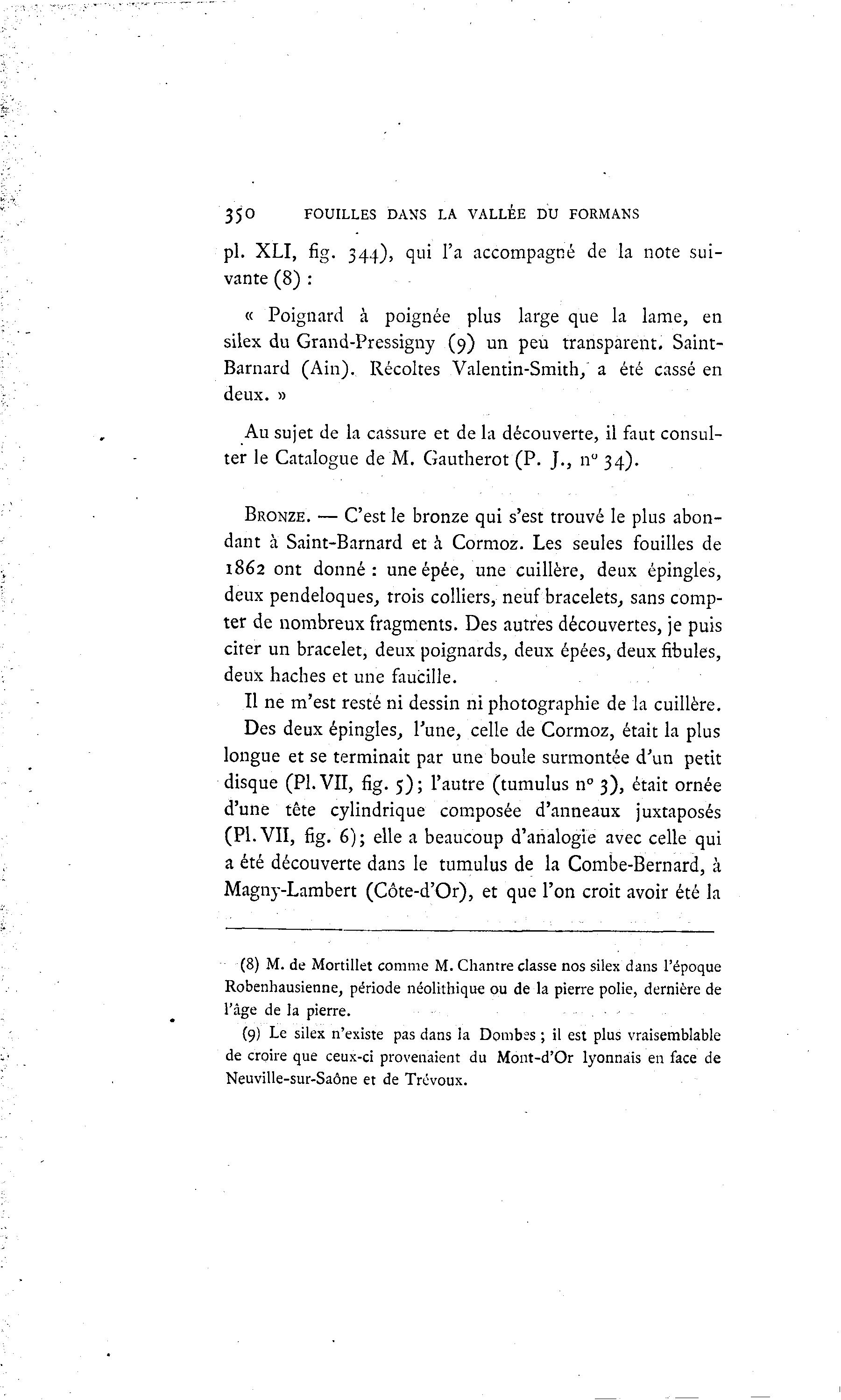 350 FOUILLES DANS LA VALLÉE DU FORMANS pi. XLI, fig. 344), qui l'a accompagné de la note sui- vante (8) : « Poignard à poignée plus large que la lame, en silex du Grand-Pressigny (9) un peu transparent. Saint- Barnard (Ain). Récoltes Valentin-Smith/ a été cassé en deux. » Au sujet de la cassure et de la découverte, il faut consul- ter le Catalogue de M. Gautherot (P. J., 11° 34). BRONZE. — C'est le bronze qui s'est trouvé le plus abon- dant à Saint-Barnard et à Cormoz. Les seules fouilles de 1862 ont donné: une épée, une cuillère, deux épingles, deux pendeloques, trois colliers, neuf bracelets, sans comp- ter de nombreux fragments. Des autres découvertes, je puis citer un bracelet, deux poignards, deux épées, deux fibules, deux haches et une faucille. Il ne m'est resté ni dessin ni photographie de la cuillère. Des deux épingles, l'une, celle de Cormoz, était la plus longue et se terminait par une boule surmontée d'un petit disque (PI. VII, fig. 5) ; l'autre (tumulus n° 3), était ornée d'une tête cylindrique composée d'anneaux juxtaposés (PI. VII, fig. 6); elle a beaucoup d'analogie avec celle qui a été découverte dans le tumulus de la Combe-Bernard, à Magny-Lambert (Côte-d'Or), et que l'on croit avoir été la (8) M. de Mortillet comme M. Chantre classe nos silex dans l'époque Robenhausienne, période néolithique ou de la pierre polie, dernière de l'âge de la pierre. (9) Le silex n'existe pas dans la Dombss ; il est plus vraisemblable de croire que ceux-ci provenaient du Mont-d'Or lyonnais en face de Neuville-sur-Saône et de Trévoux.