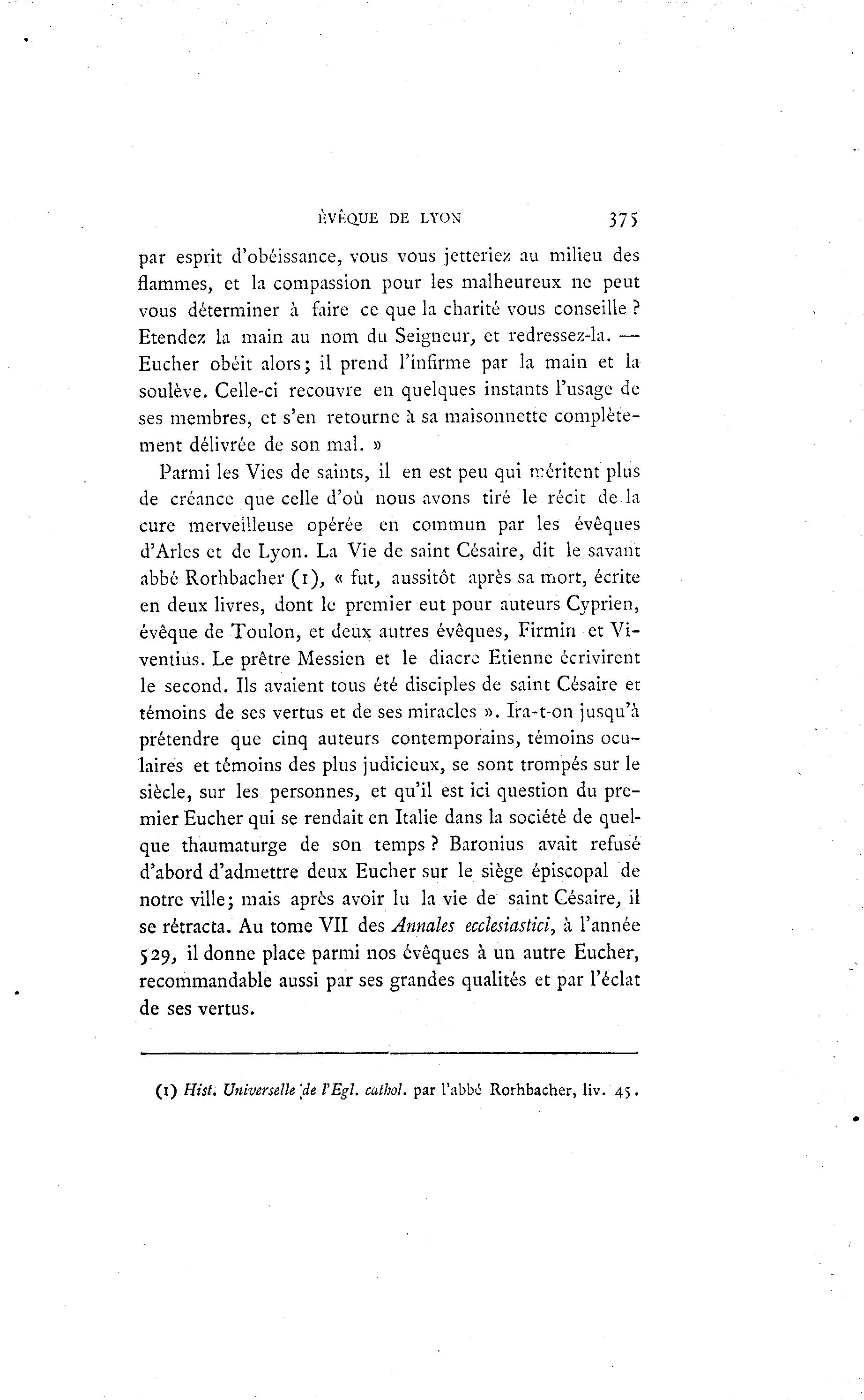 HVÊQUE DE LYON 375 par esprit d'obéissance, vous vous jetteriez au milieu des flammes, et la compassion pour les malheureux ne peut vous déterminer à faire ce que la charité vous conseille ? Etendez la main au nom du Seigneur, et redressez-la. — Eucher obéit alors; il prend l'infirme par la main et la soulève. Celle-ci recouvre en quelques instants l'usage de ses membres, et s'en retourne à sa maisonnette complète- ment délivrée de son mal. » Parmi les Vies de saints, il en est peu qui méritent plus de créance que celle d'où nous avons tiré le récit de la cure merveilleuse opérée en commun par les évêques d'Arles et de Lyon. La Vie de saint Césaire, dit le savant abbé Rorhbacher ( i ) , « fut, aussitôt après sa mort, écrite en deux livres, dont le premier eut pour auteurs Cyprien, évêque de Toulon, et deux autres évêques, Firmin et Vi- ventius. Le prêtre Messien et le diacre Etienne écrivirent le second. Ils avaient tous été disciples de saint Césaire et témoins de ses vertus et de ses miracles ». Ira-t-on jusqu'à prétendre que cinq auteurs contemporains, témoins ocu- laires et témoins des plus judicieux, se sont trompés sur le siècle, sur les personnes, et qu'il est ici question du pre- mier Eucher qui se rendait en Italie dans la société de quel- que thaumaturge de son temps ? Baronius avait refusé d'abord d'admettre deux Eucher sur le siège épiscopal de notre ville; mais après avoir lu la vie de saint Césaire, il se rétracta. Au tome VII des Annales ecclesiastici, à l'année 529, il donne place parmi nos évêques à un autre Eucher, recommandable aussi par ses grandes qualités et par l'éclat de ses vertus. (1) Hist. Universelle [de l'Egl. cuthoh par l'abbé Rorhbacher, liv. 4 5 .