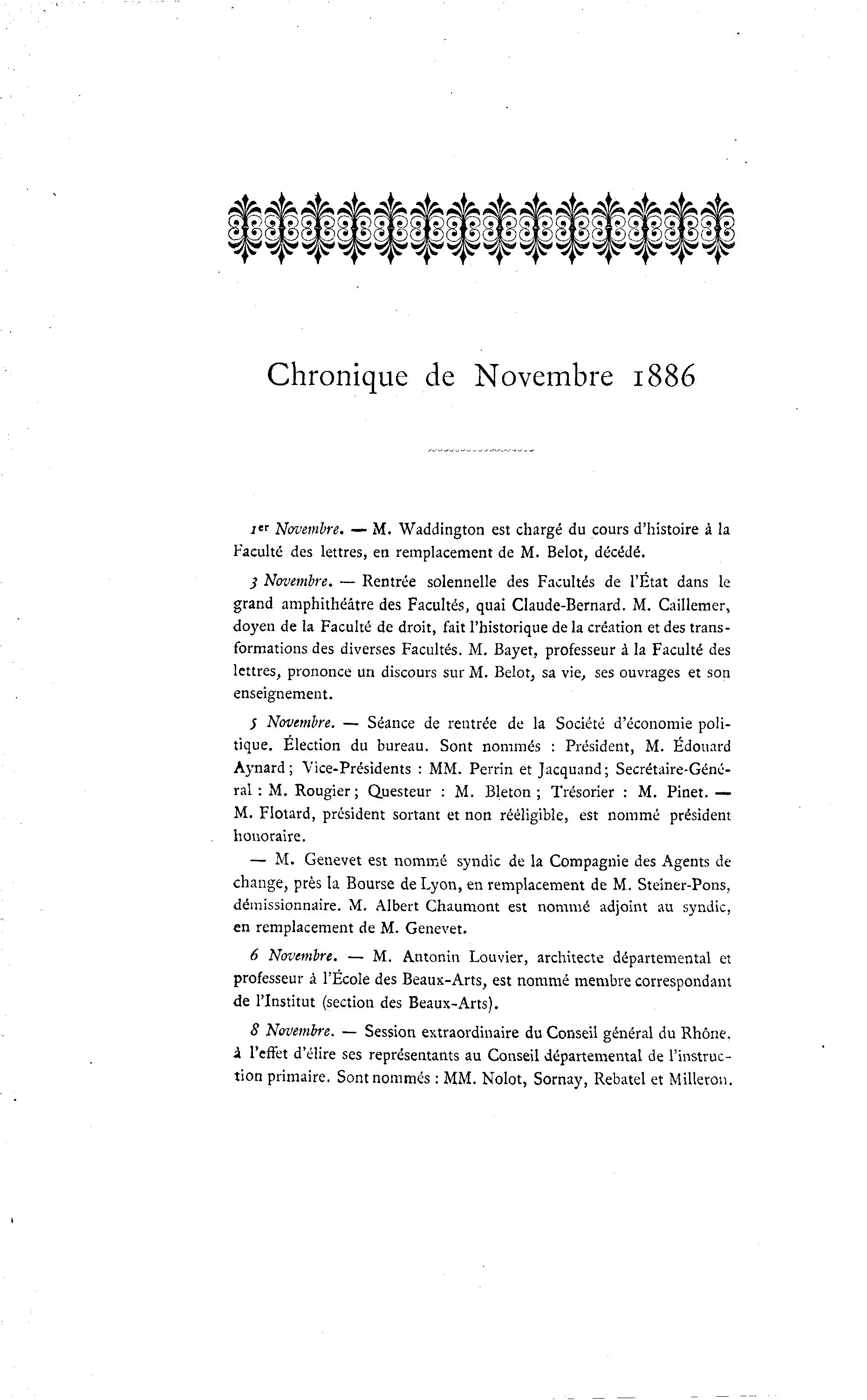 Chronique de Novembre 1886 i" Novembre. — M. Waddington est chargé du cours d'histoire à la Faculté des lettres, en remplacement de M. Belot, décédé. 3 Novembre. — Rentrée solennelle des Facultés de l'État dans le grand amphithéâtre des Facultés, quai Claude-Bernard. M. Caillemer, doyen de la Faculté de droit, fait l'historique de la création et des trans- formations des diverses Facultés. M. Bayet, professeur à la Faculté des lettres, prononce un discours sur M. Belot, sa vie, ses ouvrages et son enseignement. 5 Novembre. — Séance de rentrée de la Société d'économie poli- tique. Élection du bureau. Sont nommés : Président, M. Edouard Aynard ; Vice-Présidents : MM. Perrin et Jacquand; Secrétaire-Géné- ral : M. Rougier; Questeur : M. Bleton ; Trésorier : M. Pinet. — M. Flotard, président sortant et non rééligible, est nommé président honoraire. — M. Genevet est nommé syndic de la Compagnie des Agents de change, près la Bourse de Lyon, en remplacement de M. Steiner-Pons, démissionnaire. M. Albert Chaumont est nommé adjoint au syndic, en remplacement de M. Genevet. 6 Novembre. — M. Antonin Louvier, architecte départemental et professeur à l'École des Beaux-Arts, est nommé membre correspondant de l'Institut (section des Beaux-Arts). 8 Novembre. — Session extraordinaire du Conseil général du Rhône. à l'effet d'élire ses représentants au Conseil départemental de l'instruc- tion primaire. Sont nommés : MM. Nolot, Sornay, Rebatel et Milleron.