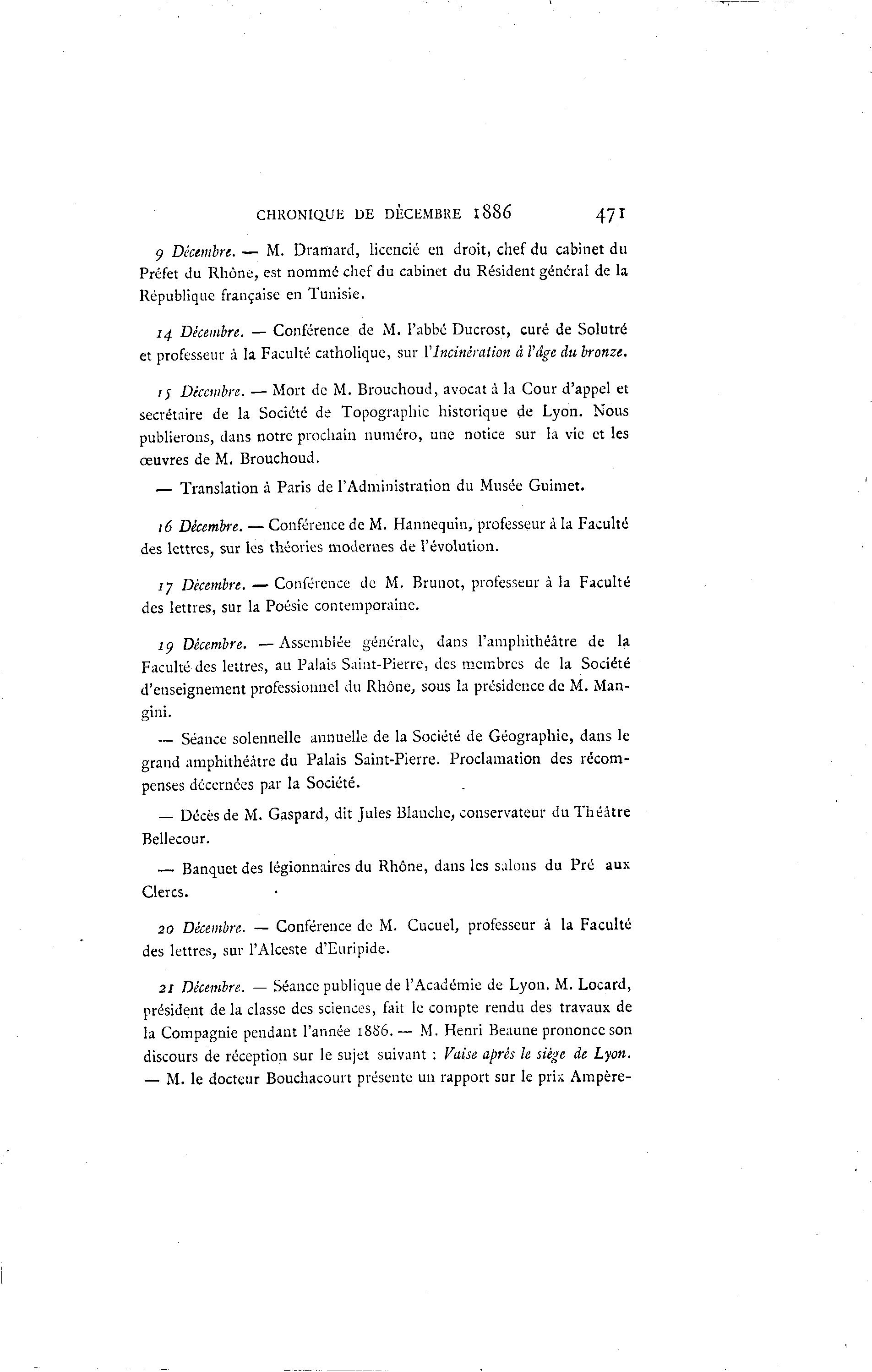 CHRONIQUE DE DECEMBRE l 8 8 6 471 g Décembre. — M. Dramard, licencié en droit, chef du cabinet du Préfet du Rhône, est nommé chef du cabinet du Résident général de la République française en Tunisie. 14 Décembre. — Conférence de M. l'abbé Ducrost, curé de Solutré et professeur à la Faculté catholique, sur l'Incinération à l'âge du bronze. 15 Décembre. — Mort de M. Brouchoud, avocat à la Cour d'appel et secrétaire de la Société de Topographie historique de Lyon. Nous publierons, dans notre prochain numéro, une notice sur la vie et les œuvres de M. Brouchoud. — Translation à Paris de l'Administration du Musée Guimet. 16 Décembre. — Conférence de M. Haunequin, professeur à la Faculté des lettres, sur les théories modernes de l'évolution. ij Décembre. — Conférence de M. Brunot, professeur à la Faculté des lettres, sur la Poésie contemporaine. 19 Décembre. — Assemblée générale, dans l'amphithéâtre de la Faculté des lettres, au Palais Saint-Pierre, des membres de la Société d'enseignement professionnel du Rhône, sous la présidence de M. Man- gini. — Séance solennelle annuelle de la Société de Géographie, dans le grand amphithéâtre du Palais Saint-Pierre. Proclamation des récom- penses décernées par la Société. — Décès de M. Gaspard, dit Jules Blanche, conservateur du Théâtre Bellecour. — Banquet des légionnaires du Rhône, dans les salons du Pré aux Clercs. 20 Décembre. — Conférence de M. Cucuel, professeur à la Faculté des lettres, sur l'Alceste d'Euripide. 21 Décembre. — Séance publique de l'Académie de Lyon. M. Locard, président de la classe des sciences, fait le compte rendu des travaux de la Compagnie pendant l'année 1886. — M. Henri Beaune prononce son discours de réception sur le sujet suivant : Vaise après le siège de Lyon. — M. le docteur Bouchacourt présente un rapport sur le prix Ampère-