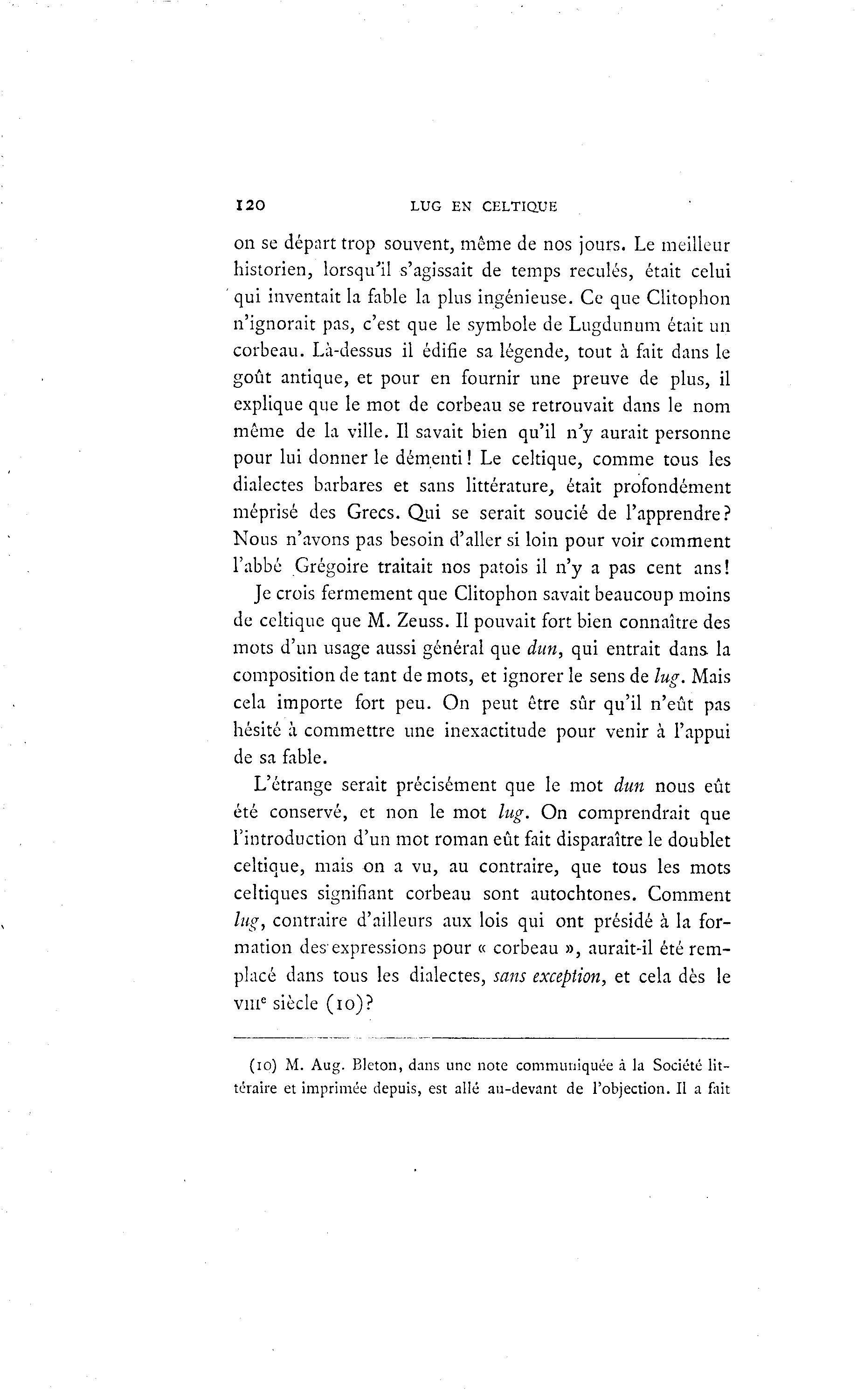 120 LUG EN CELTIQUE on se départ trop souvent, même de nos jours. Le meilleur historien, lorsqu'il s'agissait de temps reculés, était celui qui inventait la fable la plus ingénieuse. Ce que Clitophon n'ignorait pas, c'est que le symbole de Lugdunum était un corbeau. Là -dessus il édifie sa légende, tout à fait dans le goût antique, et pour en fournir une preuve de plus, il explique que le mot de corbeau se retrouvait dans le nom même de la ville. Il savait bien qu'il n'y aurait personne pour lui donner le démenti ! Le celtique, comme tous les dialectes barbares et sans littérature, était profondément méprisé des Grecs. Qui se serait soucié de l'apprendre? Nous n'avons pas besoin d'aller si loin pour voir comment l'abbé Grégoire traitait nos patois il n'y a pas cent ans! Je crois fermement que Clitophon savait beaucoup moins de celtique que M. Zeuss. Il pouvait fort bien connaître des mots d'un usage aussi général que dun, qui entrait dans la composition de tant de mots, et ignorer le sens de lug. Mais cela importe fort peu. On peut être sûr qu'il n'eût pas hésité à commettre une inexactitude pour venir à l'appui de sa fable. L'étrange serait précisément que le mot dun nous eût été conservé, et non le mot lug. On comprendrait que l'introduction d'un mot roman eût fait disparaître le doublet celtique, mais on a vu, au contraire, que tous les mots celtiques signifiant corbeau sont autochtones. Comment lug, contraire d'ailleurs aux lois qui ont présidé à la for- mation des1 expressions pour « corbeau », aurait-il été rem- placé dans tous les dialectes, sans exception, et cela dès le vm c siècle (10)? (10) M. Aug. Bleton, dans une note communiquée à la Société lit- téraire et imprimée depuis, est allé au-devant de l'objection. Il a fait