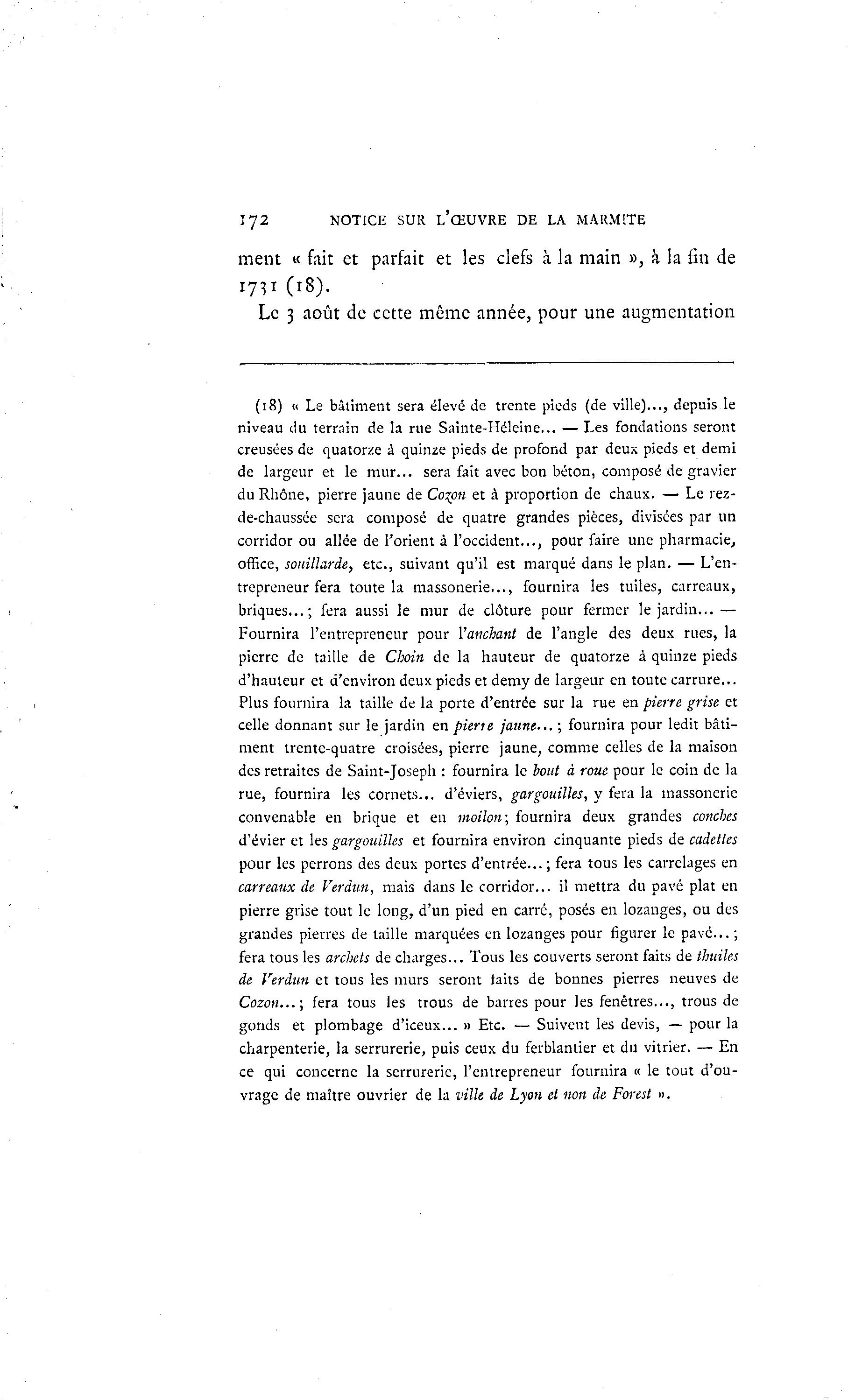 172 NOTICE SUR L'ŒUVRE DE LA MARMITE ment « fait et parfait et les clefs à la main », k la fin de 1731(18). Le 3 août de cette même année, pour une augmentation (18) « Le bâtiment sera élevé de trente pieds (de ville)..., depuis le niveau du terrain de la rue Sainte-Héleine... — Les fondations seront creusées de quatorze à quinze pieds de profond par deux pieds et demi de largeur et le mur... sera fait avec bon béton, composé de gravier du Rhône, pierre jaune de Coqm et à proportion de chaux. — Le rez- de-chaussée sera composé de quatre grandes pièces, divisées par un corridor ou allée de l'orient à l'occident..., pour faire une pharmacie, office, souillarde, etc., suivant qu'il est marqué dans le plan. — L'en- trepreneur fera toute la massonerie..., fournira les tuiles, carreaux, briques...; fera aussi le mur de clôture pour fermer le jardin...— Fournira l'entrepreneur pour Vanchant de l'angle des deux rues, la pierre de taille de Choin de la hauteur de quatorze à quinze pieds d'hauteur et d'environ deux pieds et demy de largeur en toute carrure... Plus fournira la taille de la porte d'entrée sur la rue en pierre grise et celle donnant sur le jardin en piene jaune... ; fournira pour ledit bâti- ment trente-quatre croisées, pierre jaune, comme celles de la maison des retraites de Saint-Joseph : fournira le bout à roue pour le coin de la rue, fournira les cornets... d'éviers, gargouilles, y fera la massonerie convenable en brique et en moilon; fournira deux grandes conches d'évier et les gargouilles et fournira environ cinquante pieds de cadettes pour les perrons des deux portes d'entrée... ; fera tous les carrelages en carreaux de Verdun, mais dans le corridor... il mettra du pavé plat en pierre grise tout le long, d'un pied en carré, posés en lozanges, ou des grandes pierres de taille marquées en lozanges pour figurer le pavé... ; fera tous les archets de charges... Tous les couverts seront faits de thuiles de Verdun et tous les murs seront taits de bonnes pierres neuves de Cozon...; fera tous les trous de barres pour les fenêtres..., trous de gonds et plombage d'iceux... » Etc. — Suivent les devis, — pour la charpenterie, la serrurerie, puis ceux du ferblantier et du vitrier. — En ce qui concerne la serrurerie, l'entrepreneur fournira « le tout d'ou- vrage de maître ouvrier de la ville de Lyon et non de Forest ».