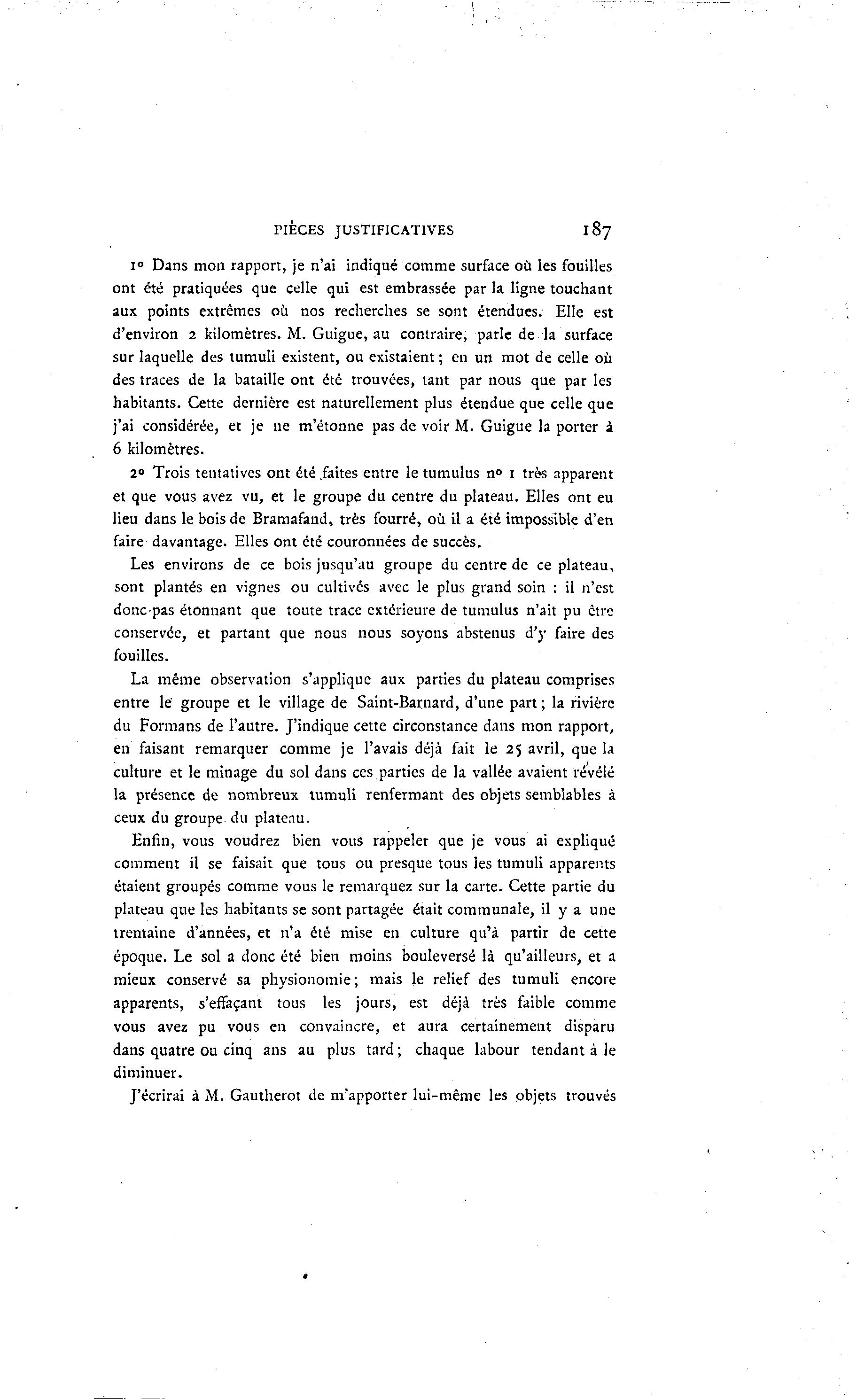 PIÈCES JUSTIFICATIVES 187 i° Dans mon rapport, je n'ai indiqué comme surface où les fouilles ont été pratiquées que celle qui est embrassée par la ligne touchant aux points extrêmes où nos recherches se sont étendues. Elle est d'environ 2 kilomètres. M. Guigue, au contraire, parle de la surface sur laquelle des tumuli existent, ou existaient ; en un mot de celle où des traces de la bataille ont été trouvées, tant par nous que par les habitants. Cette dernière est naturellement plus étendue que celle que j'ai considérée, et je ne m'étonne pas de voir M. Guigue la porter à 6 kilomètres. 2° Trois tentatives ont été faites entre le tumulus n° 1 très apparent et que vous avez vu, et le groupe du centre du plateau. Elles ont eu lieu dans le bois de Bramafand, très fourré, où il a été impossible d'en faire davantage. Elles ont été couronnées de succès. Les environs de ce bois jusqu'au groupe du centre de ce plateau, sont plantés en vignes ou cultivés avec le plus grand soin : il n'est donc-pas étonnant que toute trace extérieure de tumulus n'ait pu être conservée, et partant que nous nous soyons abstenus d'y faire des fouilles. La même observation s'applique aux parties du plateau comprises entre le groupe et le village de Saint-Barnard, d'une part ; la rivière du Formans de l'autre. J'indique cette circonstance dans mon rapport, en faisant remarquer comme je l'avais déjà fait le 25 avril, que la culture et le minage du sol dans ces parties de la vallée avaient révélé la présence de nombreux tumuli renfermant des objets semblables à ceux du groupe du plateau. Enfin, vous voudrez bien vous rappeler que je vous ai expliqué comment il se faisait que tous ou presque tous les tumuli apparents étaient groupés comme vous le remarquez sur la carte. Cette partie du plateau que les habitants se sont partagée était communale, il y a une trentaine d'années, et n'a été mise en culture qu'à partir de cette époque. Le sol a donc été bien moins bouleversé là qu'ailleurs, et a mieux conservé sa physionomie; mais le relief des tumuli encore apparents, s'effaçant tous les jours, est déjà très faible comme vous avez pu vous en convaincre, et aura certainement disparu dans quatre ou cinq ans au plus tard ; chaque labour tendant à le diminuer. J'écrirai à M. Gautherot de m'apporter lui-même les objets trouvés