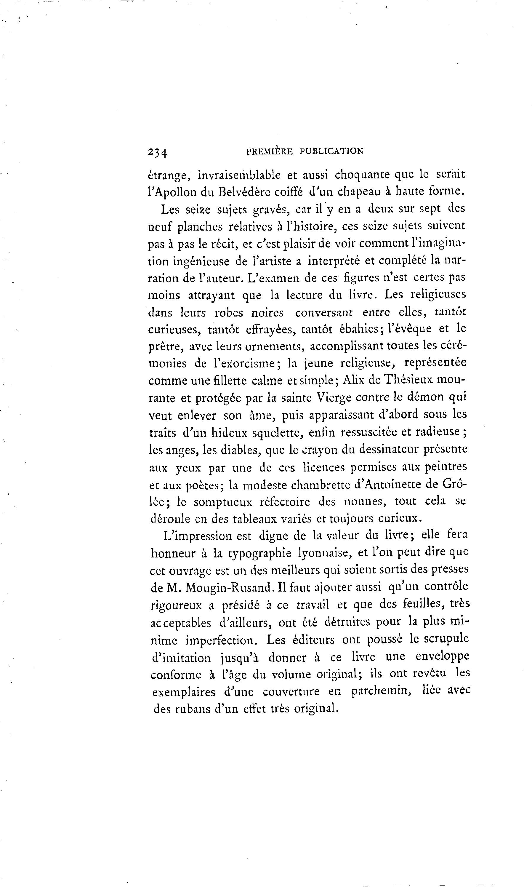 234 PREMIÈRE PUBLICATION étrange, invraisemblable et aussi choquante que le serait l'Apollon du Belvédère coiffé d'un chapeau à haute forme. Les seize sujets gravés, car il y en a deux sur sept des neuf planches relatives à l'histoire, ces seize sujets suivent pas à pas le récit, et c'est plaisir de voir comment l'imagina- tion ingénieuse de l'artiste a interprété et complété la nar- ration de l'auteur. L'examen de ces figures n'est certes pas moins attrayant que la lecture du livre. Les religieuses dans leurs robes noires conversant entre elles, tantôt curieuses, tantôt effrayées, tantôt ébahies; l'évêque et le prêtre, avec leurs ornements, accomplissant toutes les céré- monies de l'exorcisme; la jeune religieuse, représentée comme une fillette calme et simple ; Alix de Thésieux mou- rante et protégée par la sainte Vierge contre le démon qui veut enlever son âme, puis apparaissant d'abord sous les traits d'un hideux squelette, enfin ressuscitée et radieuse ; les anges, les diables, que le crayon du dessinateur présente aux yeux par une de ces licences permises aux peintres et aux poètes; la modeste chambrette d'Antoinette de Grô- lée; le somptueux réfectoire des nonnes, tout cela se déroule en des tableaux variés et toujours curieux. L'impression est digne de la valeur du livre ; elle fera honneur à la typographie lyonnaise, et l'on peut dire que cet ouvrage est un des meilleurs qui soient sortis des presses de M. Mougin-Rusand. Il faut ajouter aussi qu'un contrôle rigoureux a présidé à ce travail et que des feuilles, très acceptables d'ailleurs, ont été détruites pour la plus mi- nime imperfection. Les éditeurs ont poussé le scrupule d'imitation jusqu'à donner à ce livre une enveloppe conforme à l'âge du volume original; ils ont revêtu les exemplaires d'une couverture en parchemin, liée avec des rubans d'un effet très original.