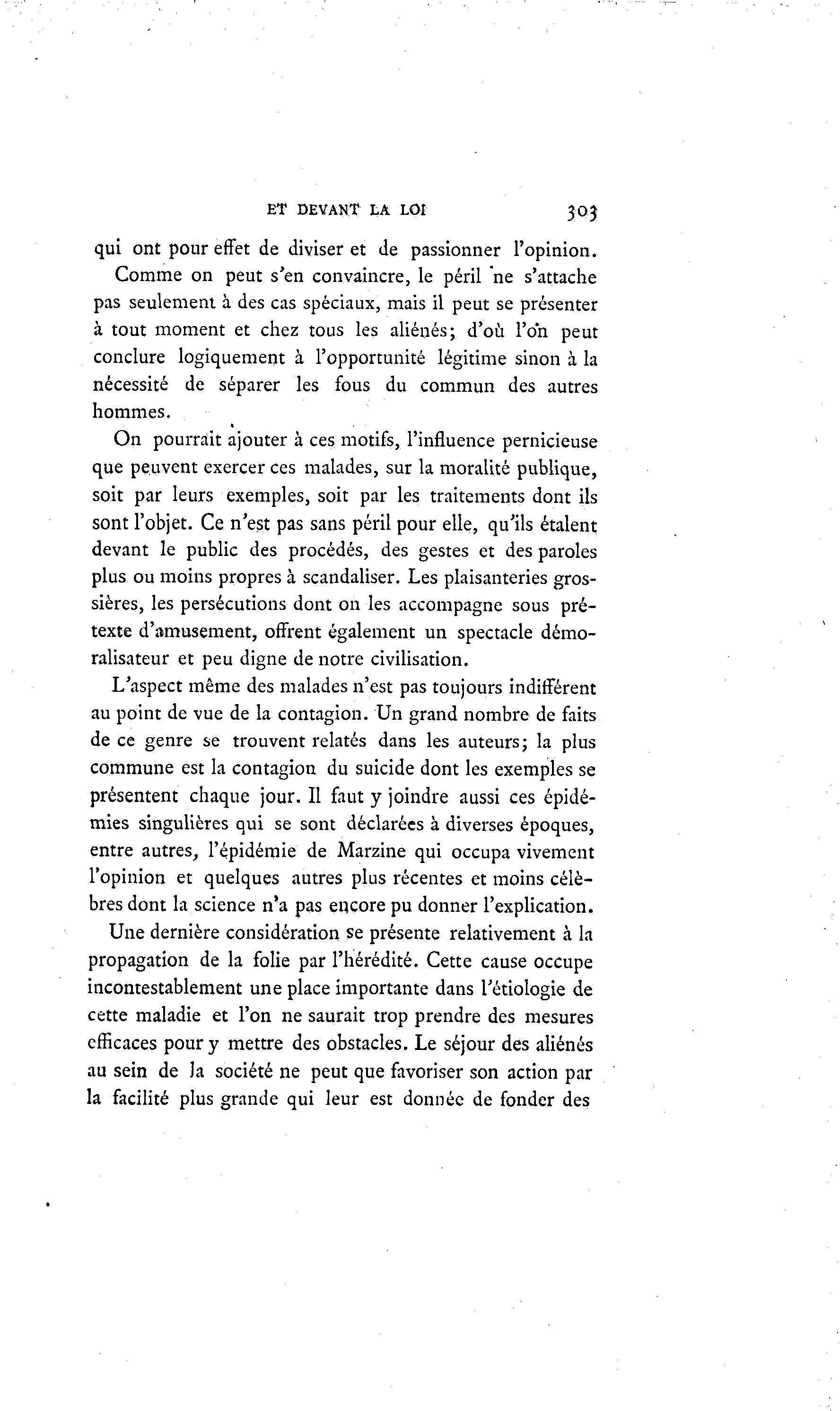 ET DEVANT LA LOI 30} qui ont pour effet de diviser et de passionner l'opinion. Comme on peut s'en convaincre, le péril ne s'attache pas seulement à des cas spéciaux, mais il peut se présenter à tout moment et chez tous les aliénés; d'où l'on peut conclure logiquement à l'opportunité légitime sinon à la nécessité de séparer les fous du commun des autres hommes. On pourrait ajouter à ces motifs, l'influence pernicieuse que peuvent exercer ces malades, sur la moralité publique, soit par leurs exemples, soit par les traitements dont ils sont l'objet. Ce n'est pas sans péril pour elle, qu'ils étalent devant le public des procédés, des gestes et des paroles plus ou moins propres à scandaliser. Les plaisanteries gros- sières, les persécutions dont on les accompagne sous pré- texte d'amusement, offrent également un spectacle démo- ralisateur et peu digne de notre civilisation. L'aspect même des malades n'est pas toujours indifférent au point de vue de la contagion. Un grand nombre de faits de ce genre se trouvent relatés dans les auteurs; la plus commune est la contagion du suicide dont les exemples se présentent chaque jour. Il faut y joindre aussi ces épidé- mies singulières qui se sont déclarées à diverses époques, entre autres, l'épidémie de Marzine qui occupa vivement l'opinion et quelques autres plus récentes et moins célè- bres dont la science n'a pas encore pu donner l'explication. Une dernière considération se présente relativement à la propagation de la folie par l'hérédité. Cette cause occupe incontestablement une place importante dans Tétiologie de cette maladie et l'on ne saurait trop prendre des mesures efficaces pour y mettre des obstacles. Le séjour des aliénés au sein de la société ne peut que favoriser son action par la facilité plus grande qui leur est donnée de fonder des