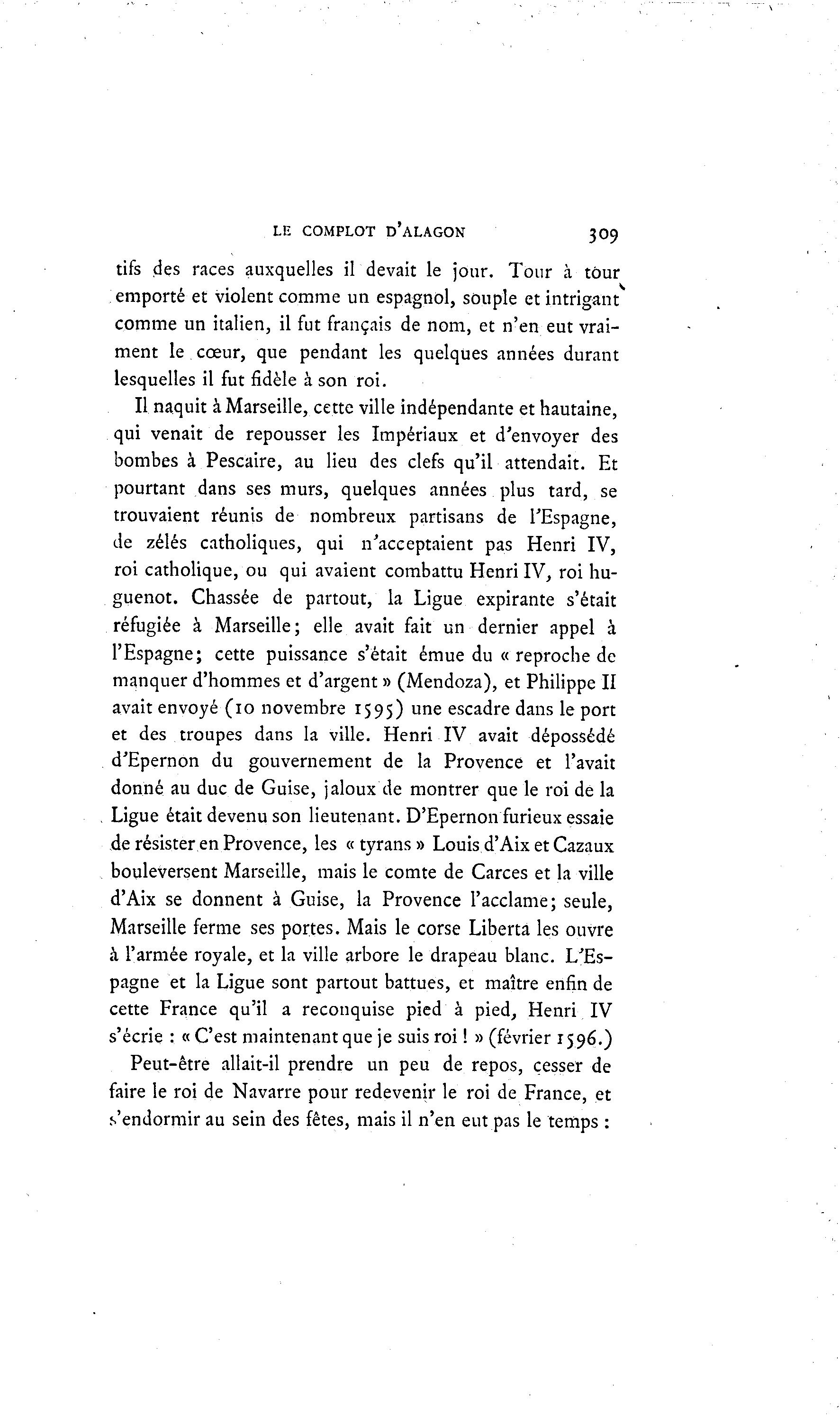 LE COMPLOT D'ALAGON 3O9 tifs des races auxquelles il devait le jour. Tour à tour emporté et violent comme un espagnol, souple et intrigant comme un italien, il fut français de nom, et n'en eut vrai- ment le cœur, que pendant les quelques années durant lesquelles il fut fidèle à son roi. Il naquit à Marseille, cette ville indépendante et hautaine, qui venait de repousser les Impériaux et d'envoyer des bombes à Pescaire, au lieu des clefs qu'il attendait. Et pourtant dans ses murs, quelques années plus tard, se trouvaient réunis de nombreux partisans de l'Espagne, de zélés catholiques, qui n'acceptaient pas Henri IV, roi catholique, ou qui avaient combattu Henri IV, roi hu- guenot. Chassée de partout, la Ligue expirante s'était réfugiée à Marseille ; elle avait fait un dernier appel à l'Espagne; cette puissance s'était émue du « reproche de manquer d'hommes et d'argent » (Mendoza), et Philippe II avait envoyé (10 novembre 1595) une escadre dans le port et des troupes dans la ville. Henri IV avait dépossédé d'Epernon du gouvernement de la Provence et l'avait donné au duc de Guise, jaloux de montrer que le roi de la Ligue était devenu son lieutenant. D'Epernon furieux essaie de résister en Provence, les «tyrans» Louis d'Aix et Cazaux bouleversent Marseille, mais le comte de Carces et la ville d'Aix se donnent à Guise, la Provence l'acclame; seule, Marseille ferme ses portes. Mais le corse Liberta les ouvre à l'armée royale, et la ville arbore le drapeau blanc. L'Es- pagne et la Ligue sont partout battues, et maître enfin de cette France qu'il a reconquise pied à pied, Henri IV s'écrie : « C'est maintenant que je suis roi ! » (février 1596.) Peut-être allait-il prendre un peu de repos, cesser de faire le roi de Navarre pour redevenir le roi de France, et s'endormir au sein des fêtes, mais il n'en eut pas le temps :
