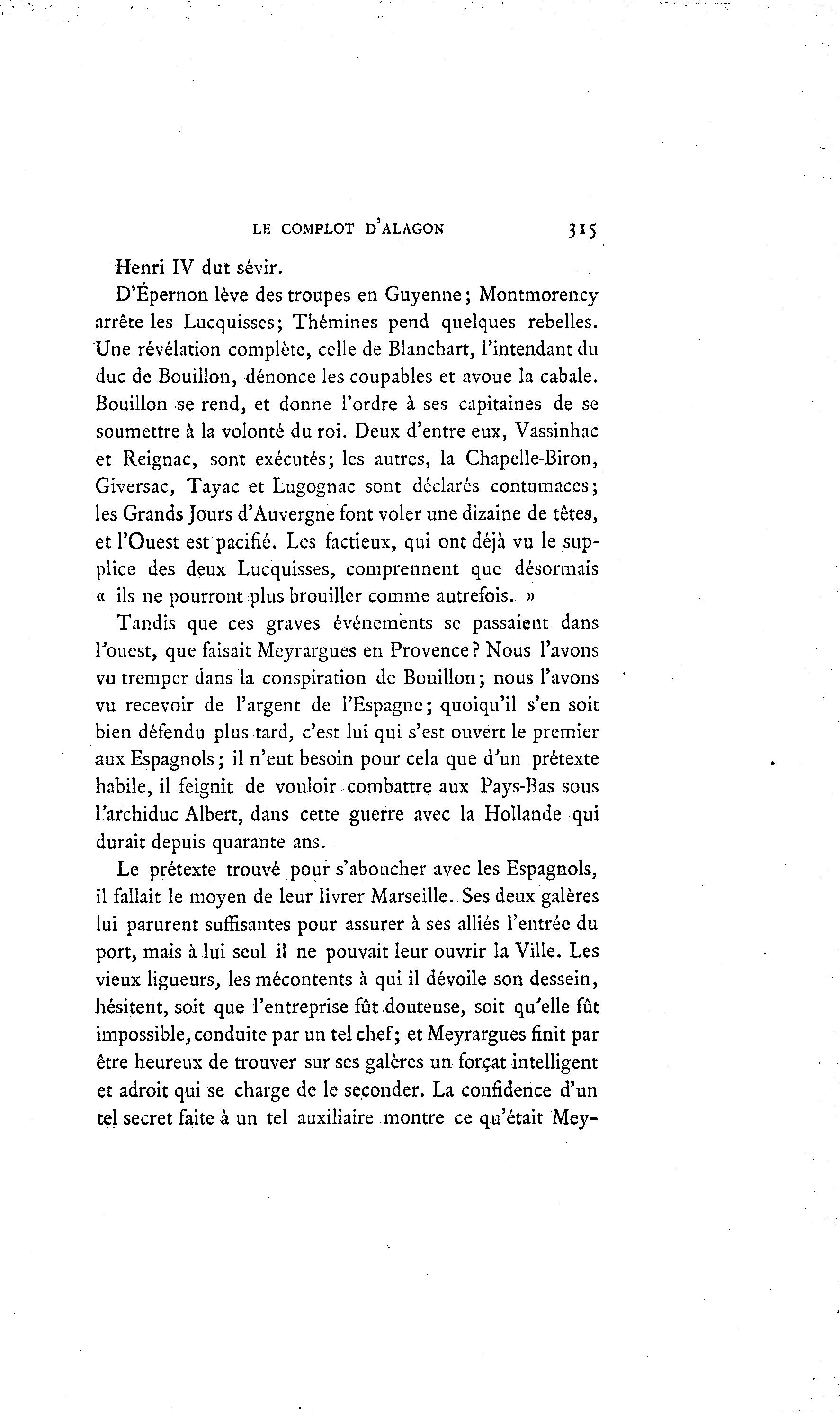 LE COMPLOT D'ALAGON 315 Henri IV dut sévir. D'Épernon lève des troupes en Guyenne ; Montmorency arrête les Lucquisses; Thémines pend quelques rebelles. Une révélation complète, celle de Blanchart, l'intendant du duc de Bouillon, dénonce les coupables et avoue la cabale. Bouillon se rend, et donne l'ordre à ses capitaines de se soumettre à la volonté du roi. Deux d'entre eux, Vassinhac et Reignac, sont exécutés; les autres, la Chapelle-Biron, Giversac, Tayac et Lugognac sont déclarés contumaces; les Grands Jours d'Auvergne font voler une dizaine de têtes, et l'Ouest est pacifié. Les factieux, qui ont déjà vu le sup- plice des deux Lucquisses, comprennent que désormais « ils ne pourront plus brouiller comme autrefois. » Tandis que ces graves événements se passaient dans l'ouest, que faisait Meyrargues en Provence ? Nous l'avons vu tremper dans la conspiration de Bouillon ; nous l'avons vu recevoir de l'argent de l'Espagne; quoiqu'il s'en soit bien défendu plus tard, c'est lui qui s'est ouvert le premier aux Espagnols; il n'eut besoin pour cela que d'un prétexte habile, il feignit de vouloir combattre aux Pays-Bas sous l'archiduc Albert, dans cette guerre avec la Hollande qui durait depuis quarante ans. Le prétexte trouvé pour s'aboucher avec les Espagnols, il fallait le moyen de leur livrer Marseille. Ses deux galères lui parurent suffisantes pour assurer à ses alliés l'entrée du port, mais à lui seul il ne pouvait leur ouvrir la Ville. Les vieux ligueurs, les mécontents à qui il dévoile son dessein, hésitent, soit que l'entreprise fût douteuse, soit qu'elle fût impossible, conduite par un tel chef; et Meyrargues finit par être heureux de trouver sur ses galères un forçat intelligent et adroit qui se charge de le seconder. La confidence d'un tel secret faite à un tel auxiliaire montre ce qu'était Mey-
