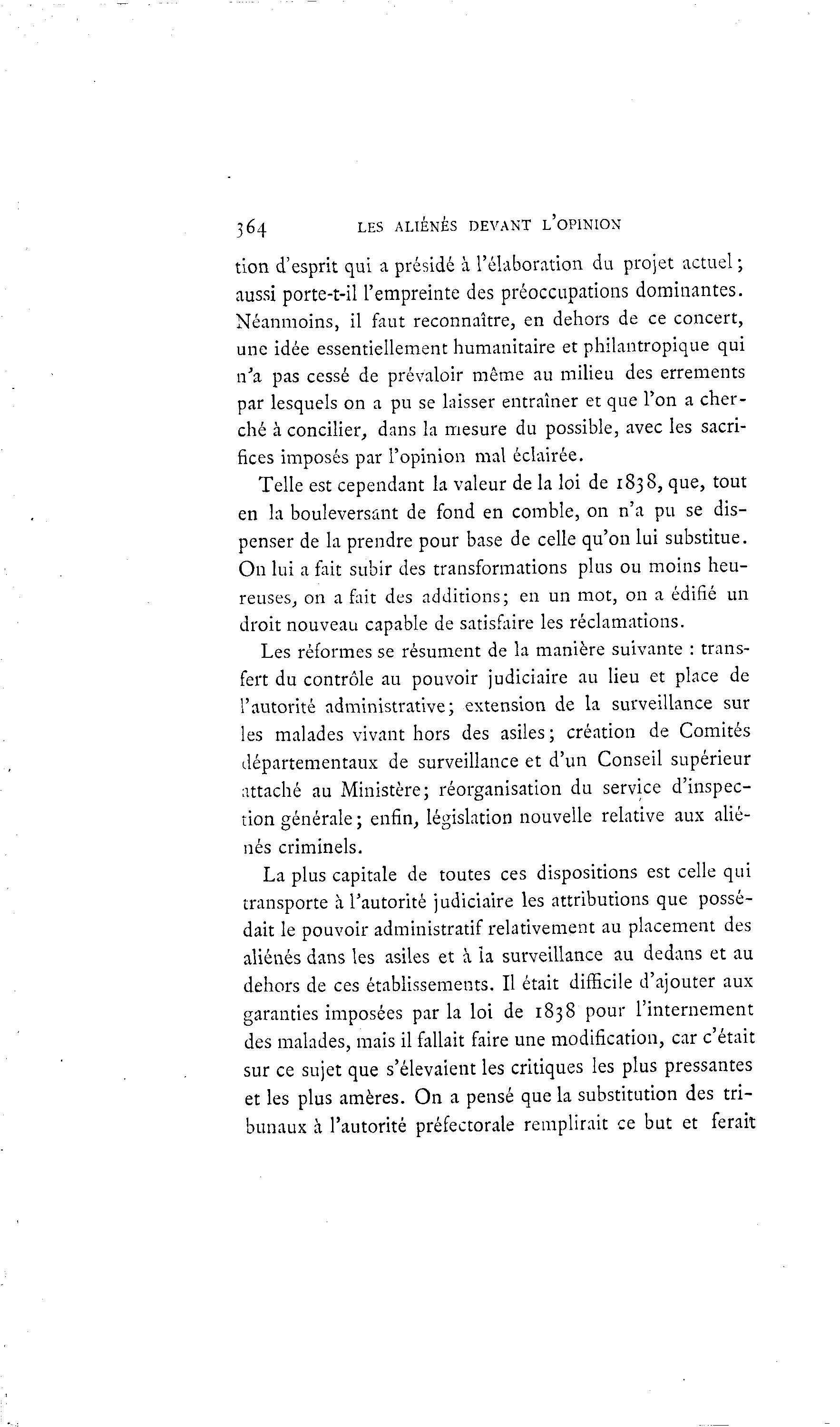 364 LES ALIÉNÉS DEVANT L'OPINION tion d'esprit qui a présidé à l'élaboration du projet actuel ; aussi porte-t-il l'empreinte des préoccupations dominantes. Néanmoins, il faut reconnaître, en dehors de ce concert, une idée essentiellement humanitaire et philantropique qui n'a pas cessé de prévaloir même au milieu des errements par lesquels on a pu se laisser entraîner et que l'on a cher- ché à concilier, dans la mesure du possible, avec les sacri- fices imposés par l'opinion mal éclairée. Telle est cependant la valeur de la loi de 1838, que, tout en la bouleversant de fond en comble, on n'a pu se dis- penser de la prendre pour base de celle qu'on lui substitue. On lui a fait subir des transformations plus ou moins heu- reuses, on a fait des additions; en un mot, on a édifié un droit nouveau capable de satisfaire les réclamations. Les réformes se résument de la manière suivante : trans- fert du contrôle au pouvoir judiciaire au lieu et place de l'autorité administrative; extension de la surveillance sur les malades vivant hors des asiles ; création de Comités départementaux de surveillance et d'un Conseil supérieur attaché au Ministère; réorganisation du service d'inspec- tion générale ; enfin, législation nouvelle relative aux alié- nés criminels. La plus capitale de toutes ces dispositions est celle qui transporte à l'autorité judiciaire les attributions que possé- dait le pouvoir administratif relativement au placement des aliénés dans les asiles et à ia surveillance au dedans et au dehors de ces établissements. Il était difficile d'ajouter aux garanties imposées par la loi de 1838 pour l'internement des malades, mais il fallait faire une modification, car c'était sur ce sujet que s'élevaient les critiques les plus pressantes et les plus arrières. On a pensé que la substitution des tri- bunaux à l'autorité préfectorale remplirait ce but et ferait