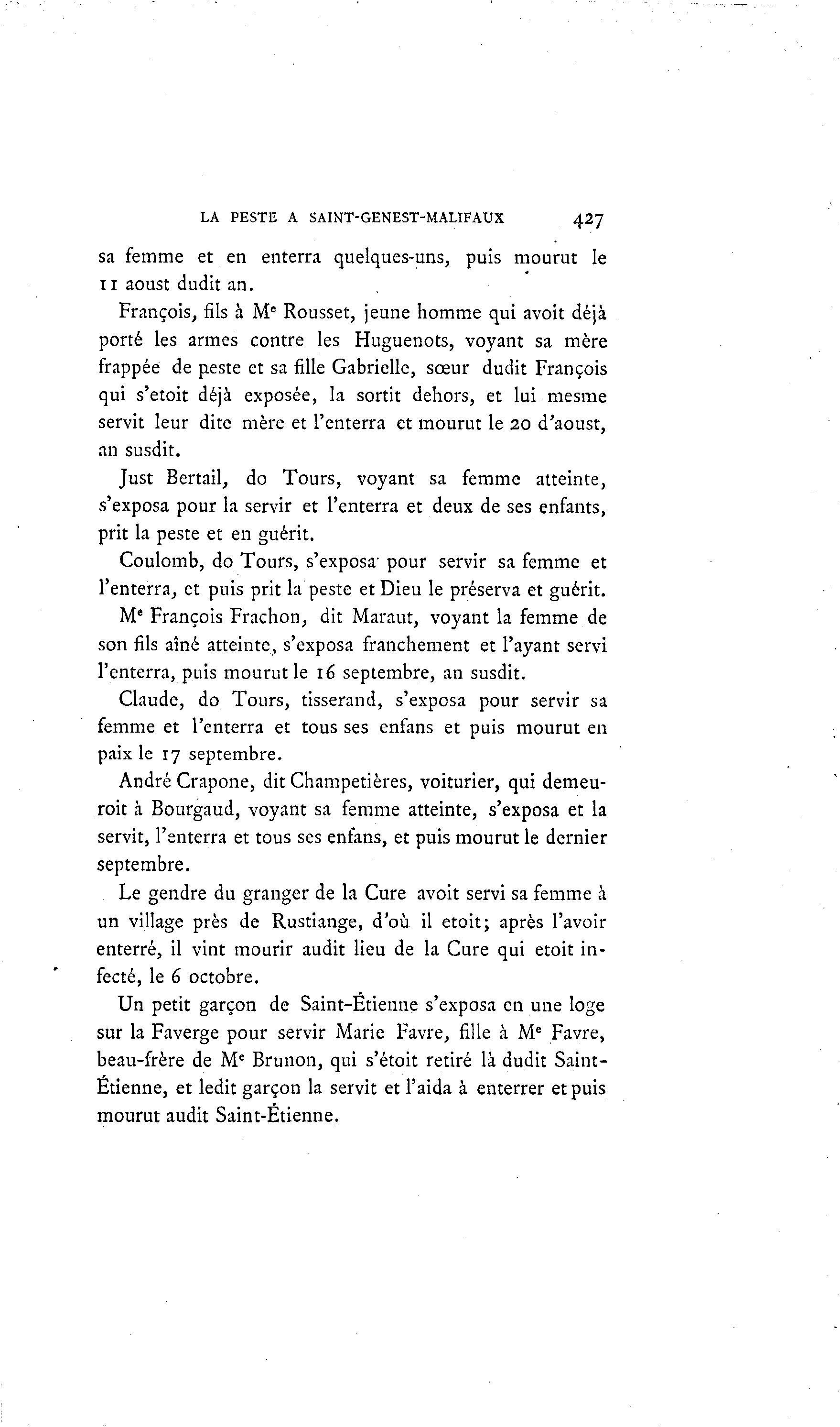 LA PESTE A SAINT-GENEST-MALIFAUX 427 sa femme et en enterra quelques-uns, puis mourut le ir aoust dudit an. François, fils à Me Rousset, jeune homme qui avoit déjà porté les armes contre les Huguenots, voyant sa mère frappée de peste et sa fille Gabrielle, sœur dudit François qui s'etoit déjà exposée, la sortit dehors, et lui mesme servit leur dite mère et l'enterra et mourut le 20 d'aoust, an susdit. Just Bertail, do Tours, voyant sa femme atteinte, s'exposa pour la servir et l'enterra et deux de ses enfants, prit la peste et en guérit. Coulomb, do Tours, s'exposa' pour servir sa femme et l'enterra, et puis prit la peste et Dieu le préserva et guérit. Me François Fraction, dit Maraut, voyant la femme de son fils aîné atteinte, s'exposa franchement et l'ayant servi l'enterra, puis mourut le 16 septembre, an susdit. Claude, do Tours, tisserand, s'exposa pour servir sa femme et l'enterra et tous ses enfans et puis mourut en paix le 17 septembre. André Crapone, dit Champetières, voiturier, qui demeu- roit à Bourgaud, voyant sa femme atteinte, s'exposa et la servit, l'enterra et tous ses enfans, et puis mourut le dernier septembre. Le gendre du granger de la Cure avoit servi sa femme à un village près de Rustiange, d'où il etoit; après l'avoir enterré, il vint mourir audit lieu de la Cure qui etoit in- fecté, le 6 octobre. Un petit garçon de Saint-Étienne s'exposa en une loge sur la Faverge pour servir Marie Favre, fille à Me Favre, beau-frère de Me Brunon, qui s'étoit retiré là dudit Saint- Étienne, et ledit garçon la servit et l'aida à enterrer et puis mourut audit Saint-Étienne.